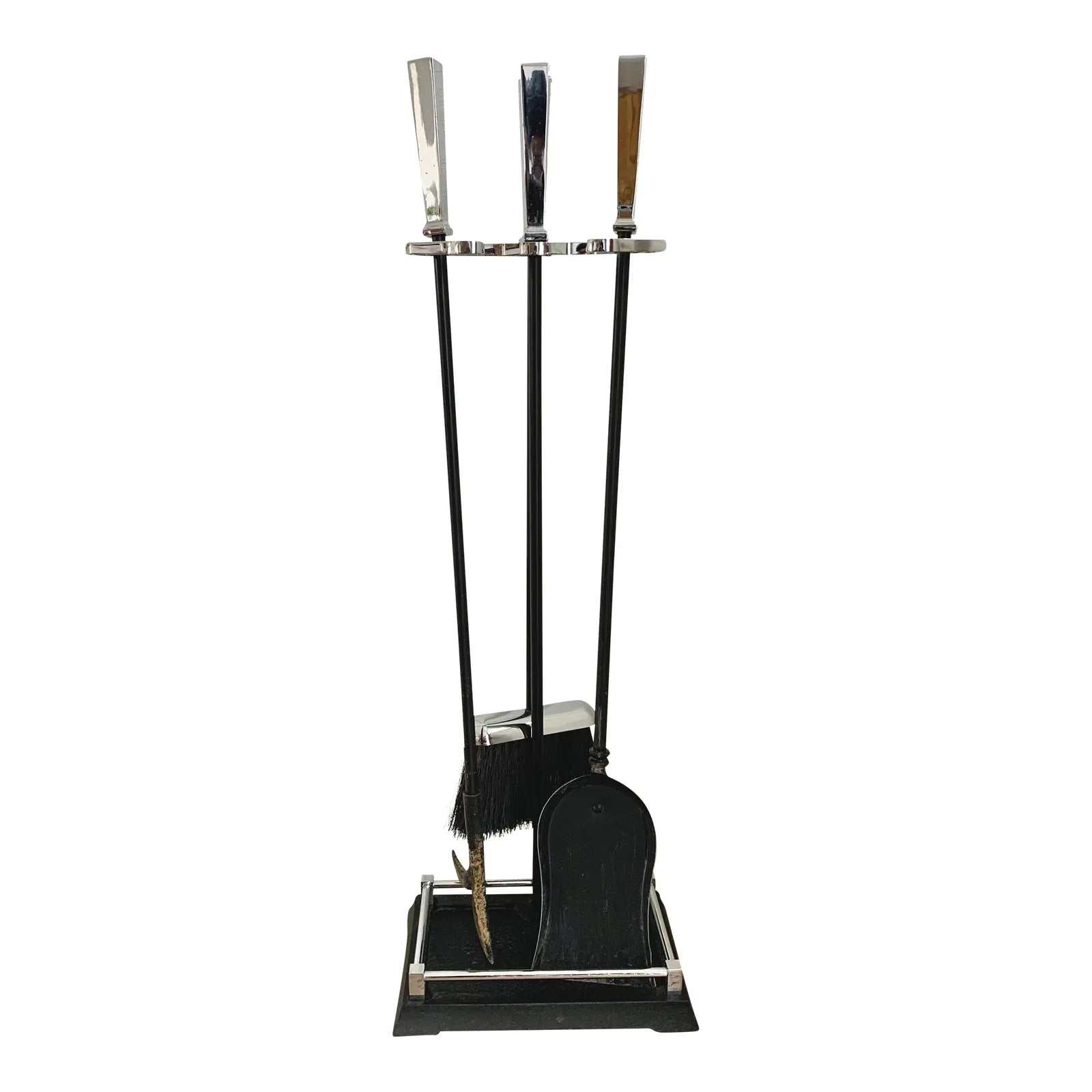 A transitional modern 4-piece fireplace set featuring sleek polished chrome handles and accents. The tools are sturdy and heavy duty and the aesthetic is minimal enough to match many decor styles from traditional to modern.