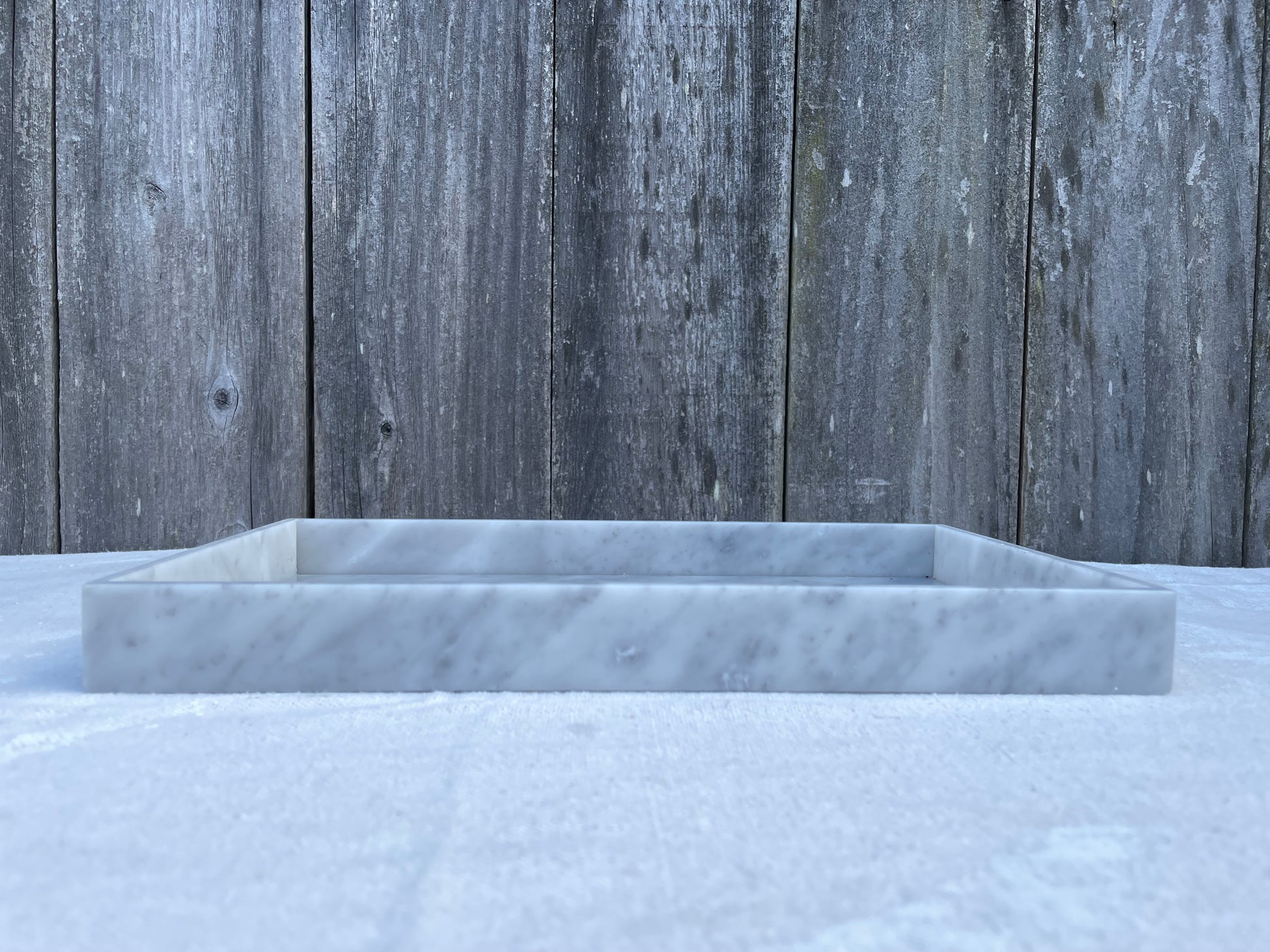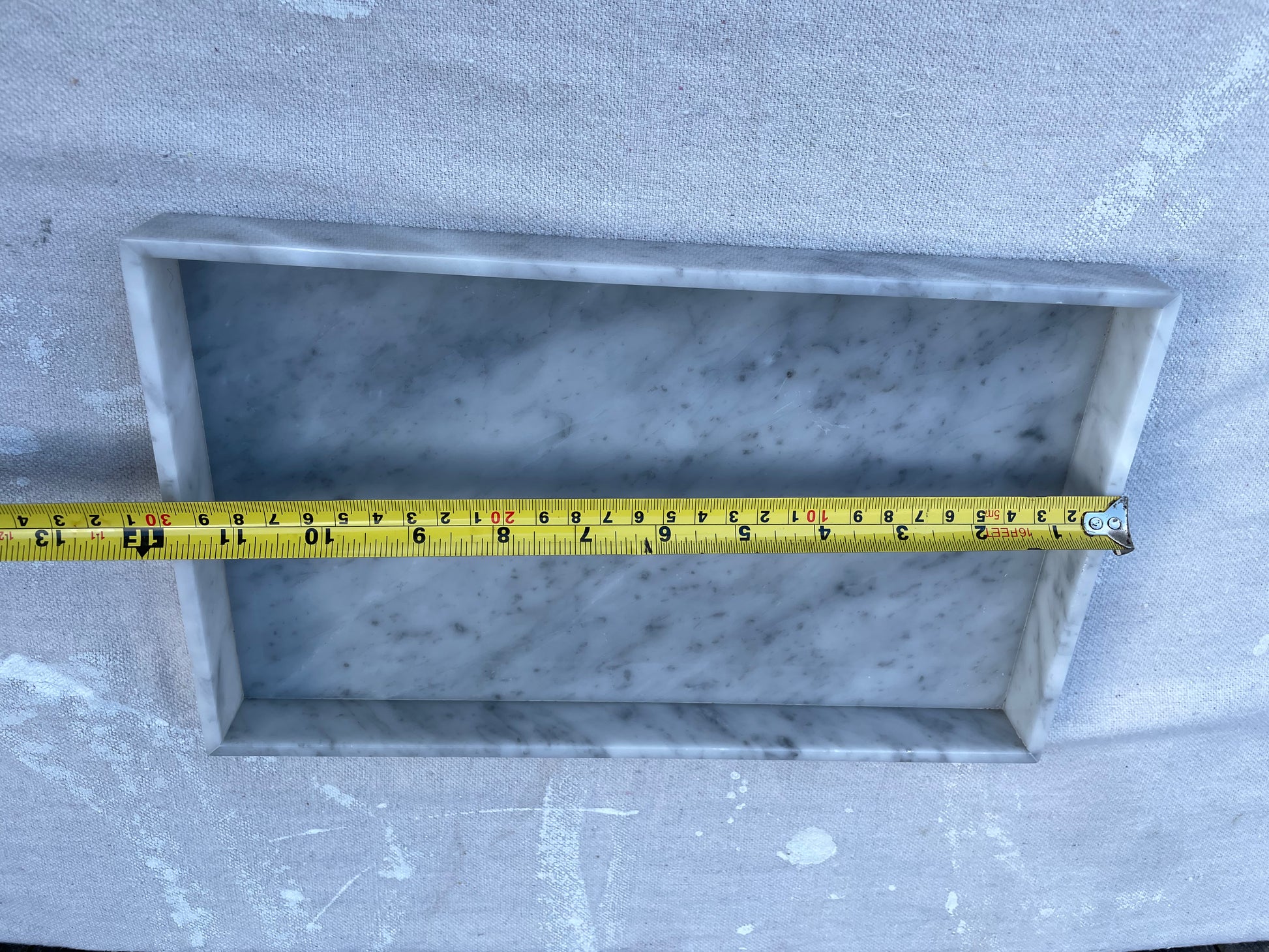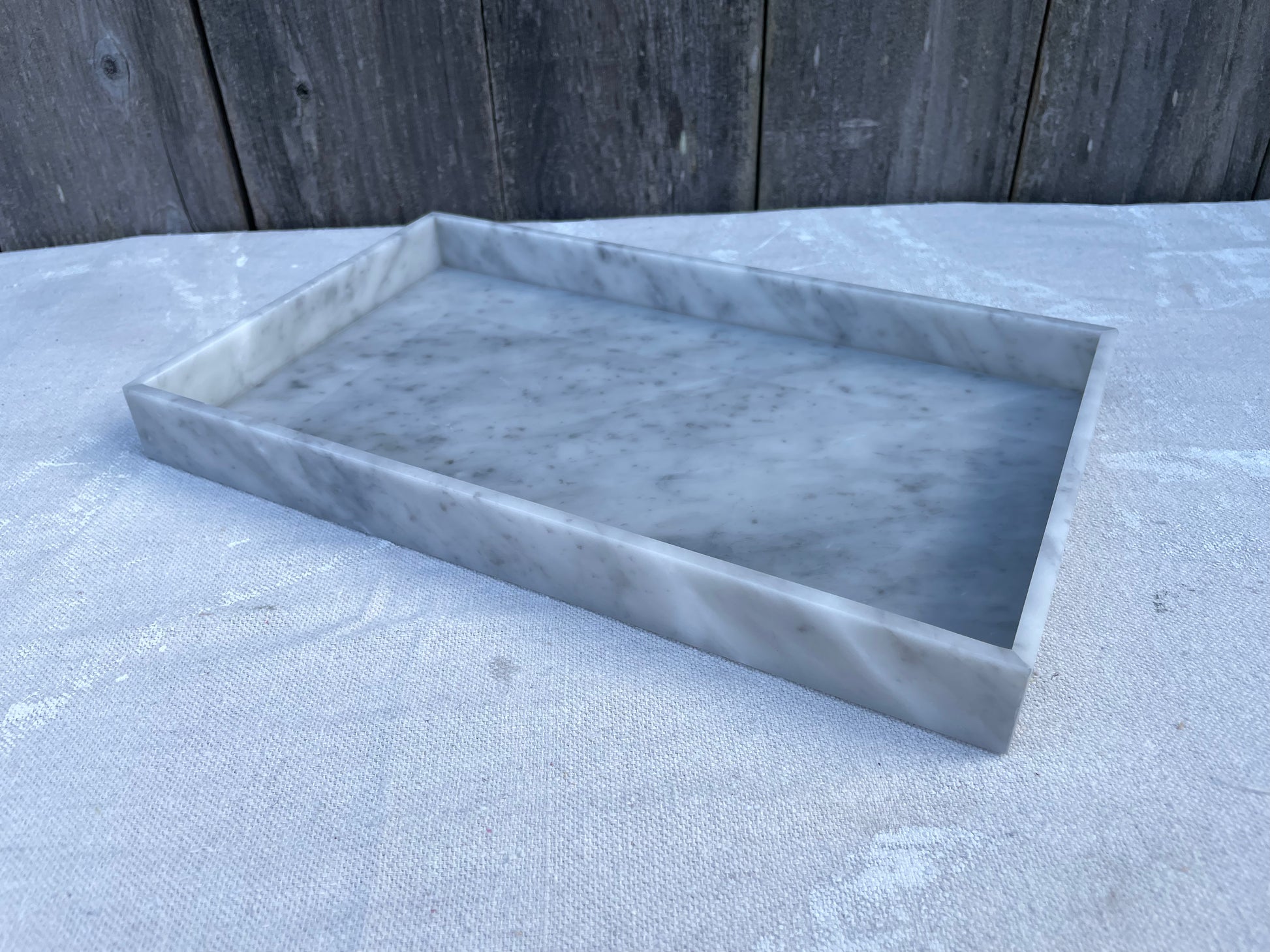 A solid marble tray with modernist lines. This tray is great for organizing in any space, perfect as a desk or vanity top catchall.