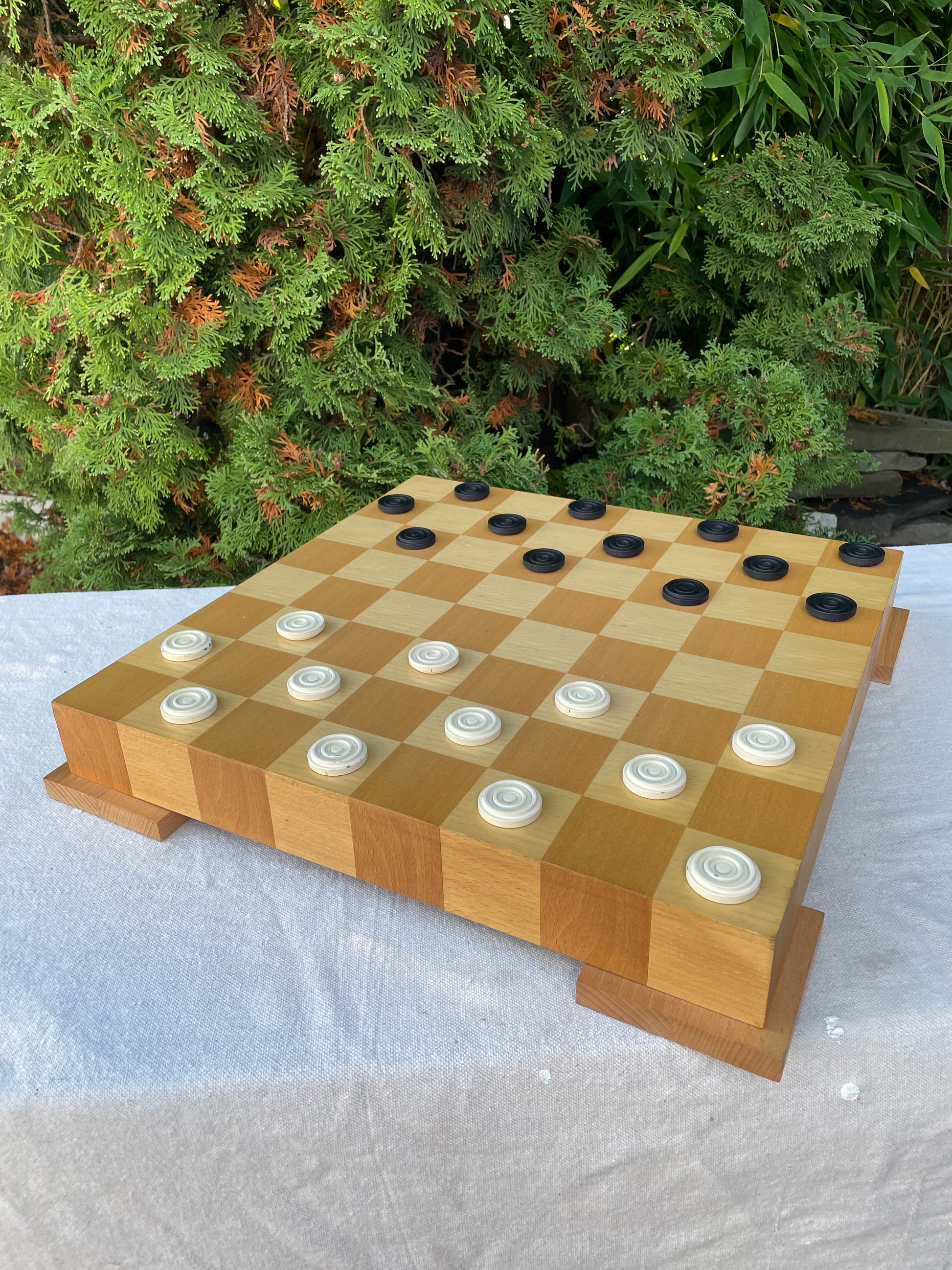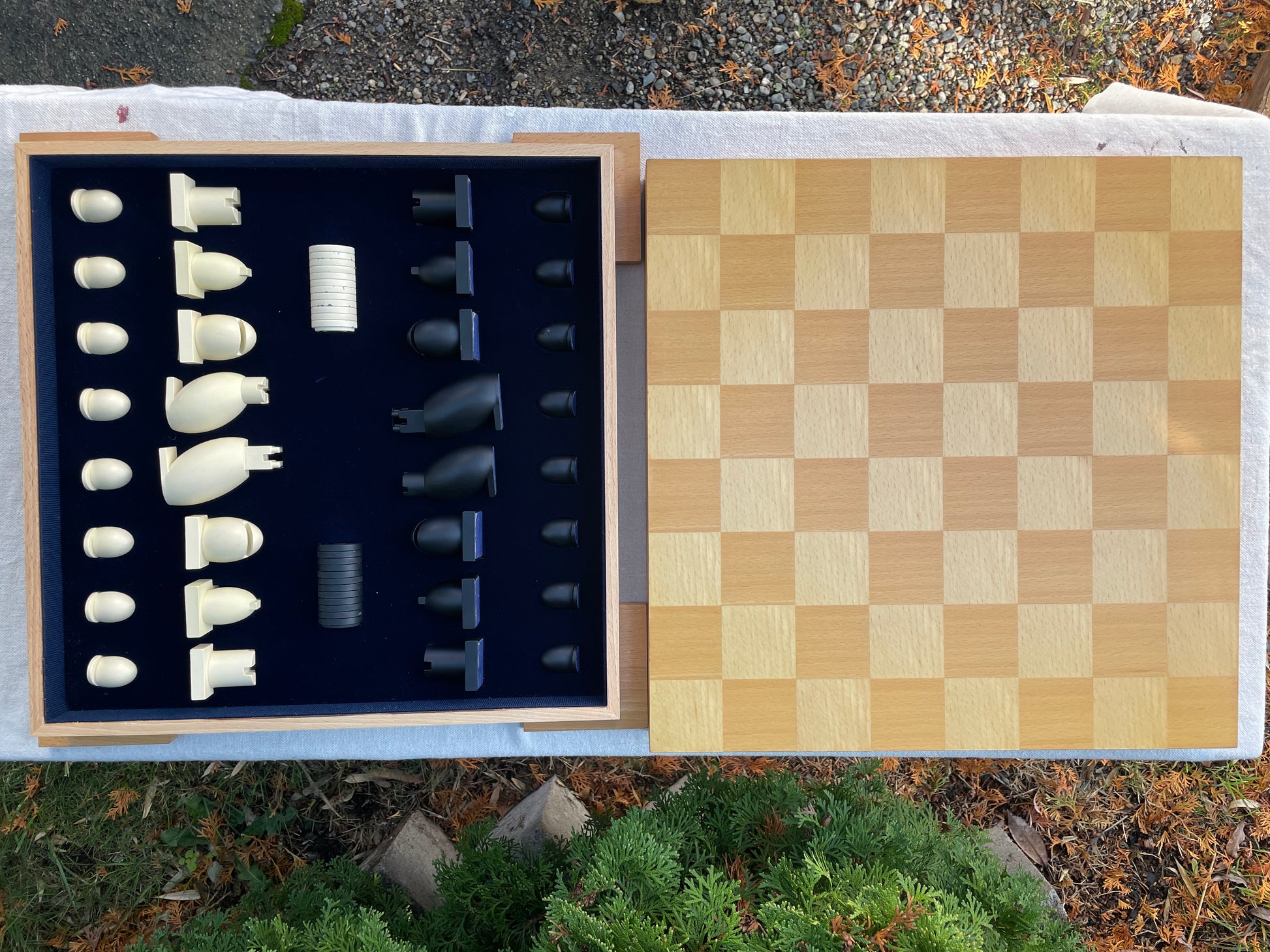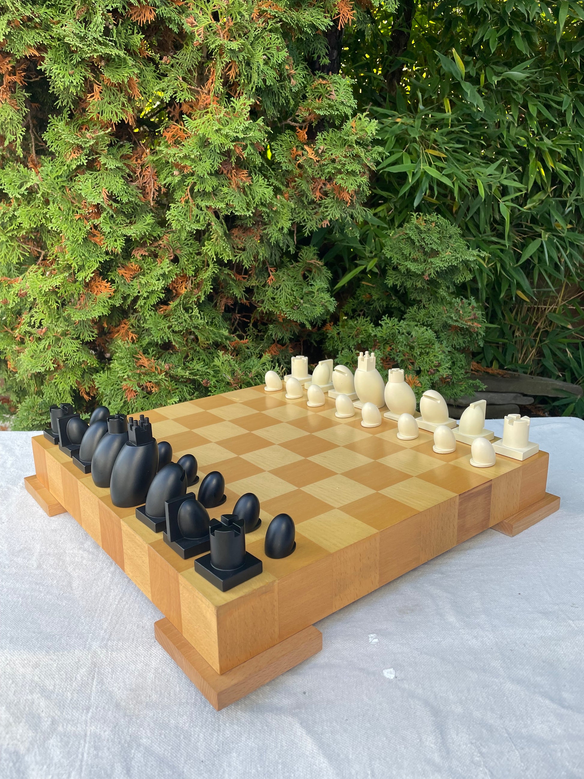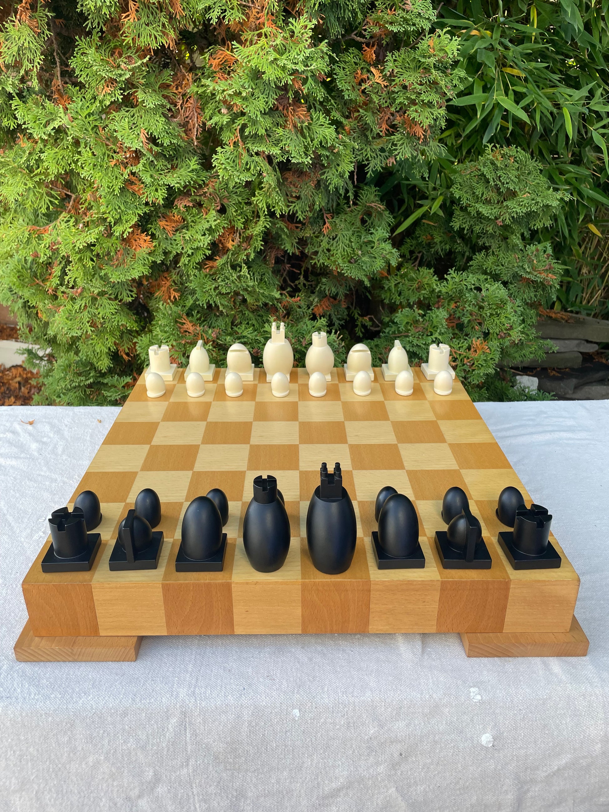 Michael Graves Postmodern Chess and Checkers Set. Original postmodern Michael Graves chess and checkers set. Maple wood chess and checkers set with board and box by famed architect Michael Graves.