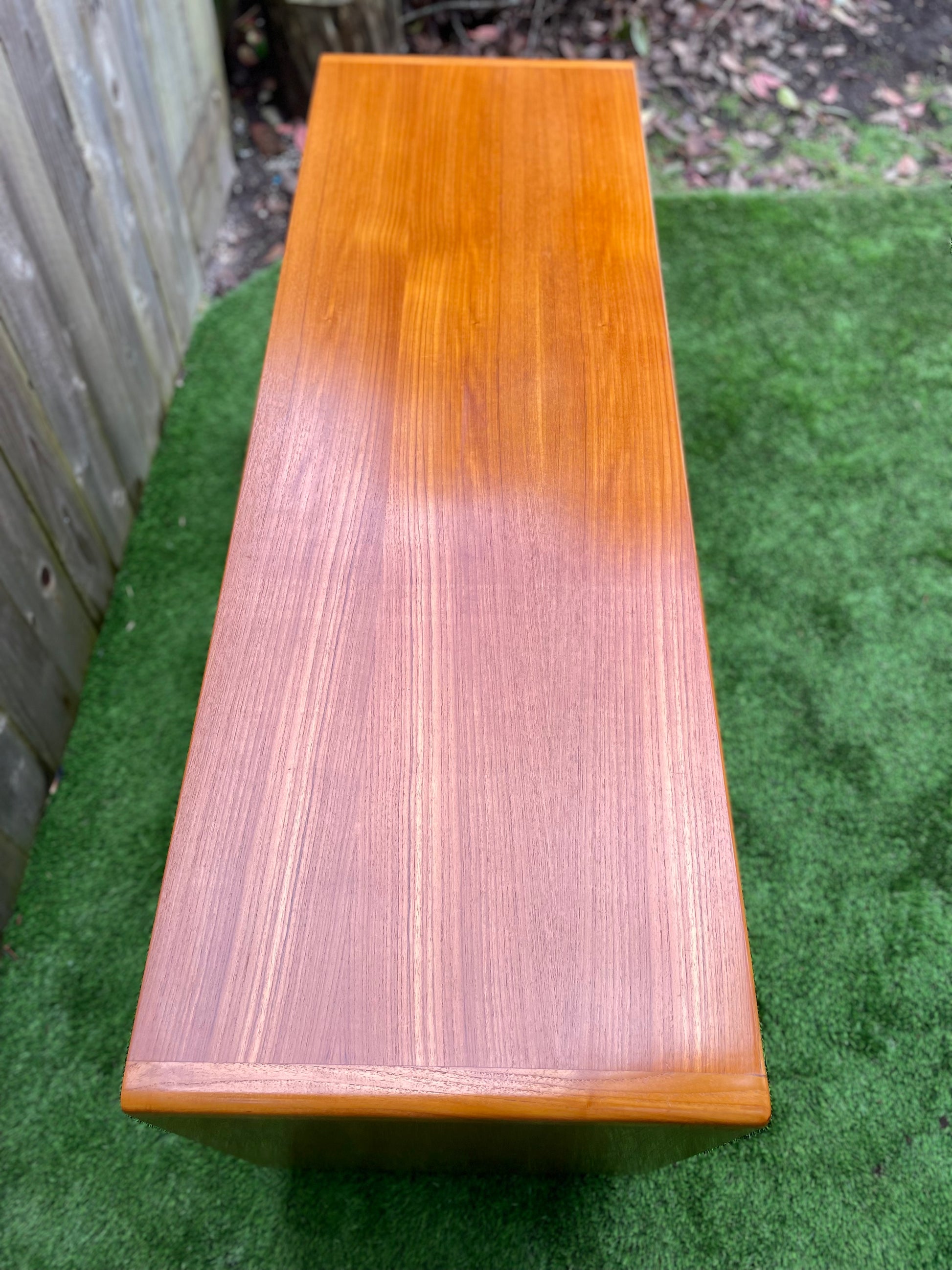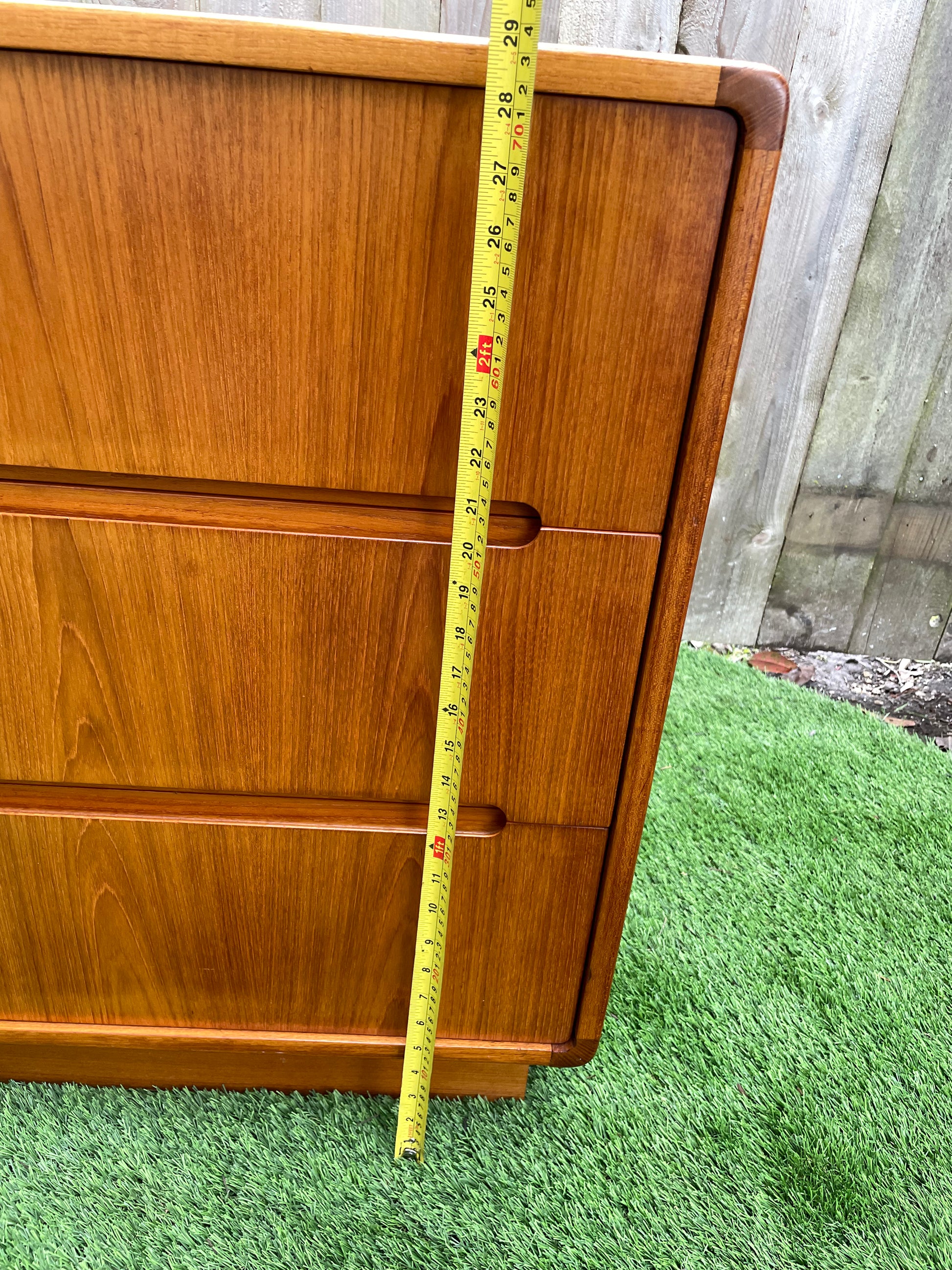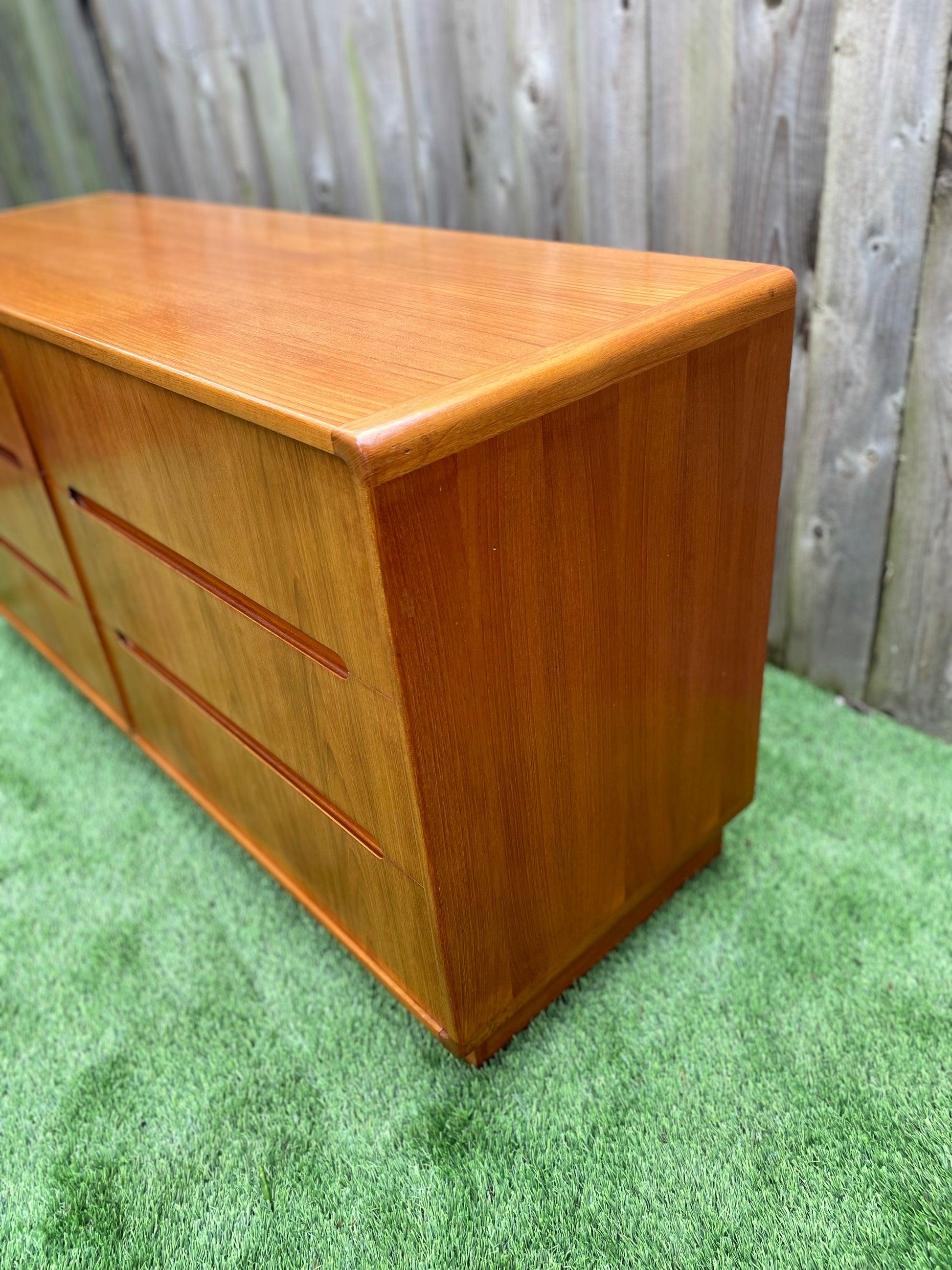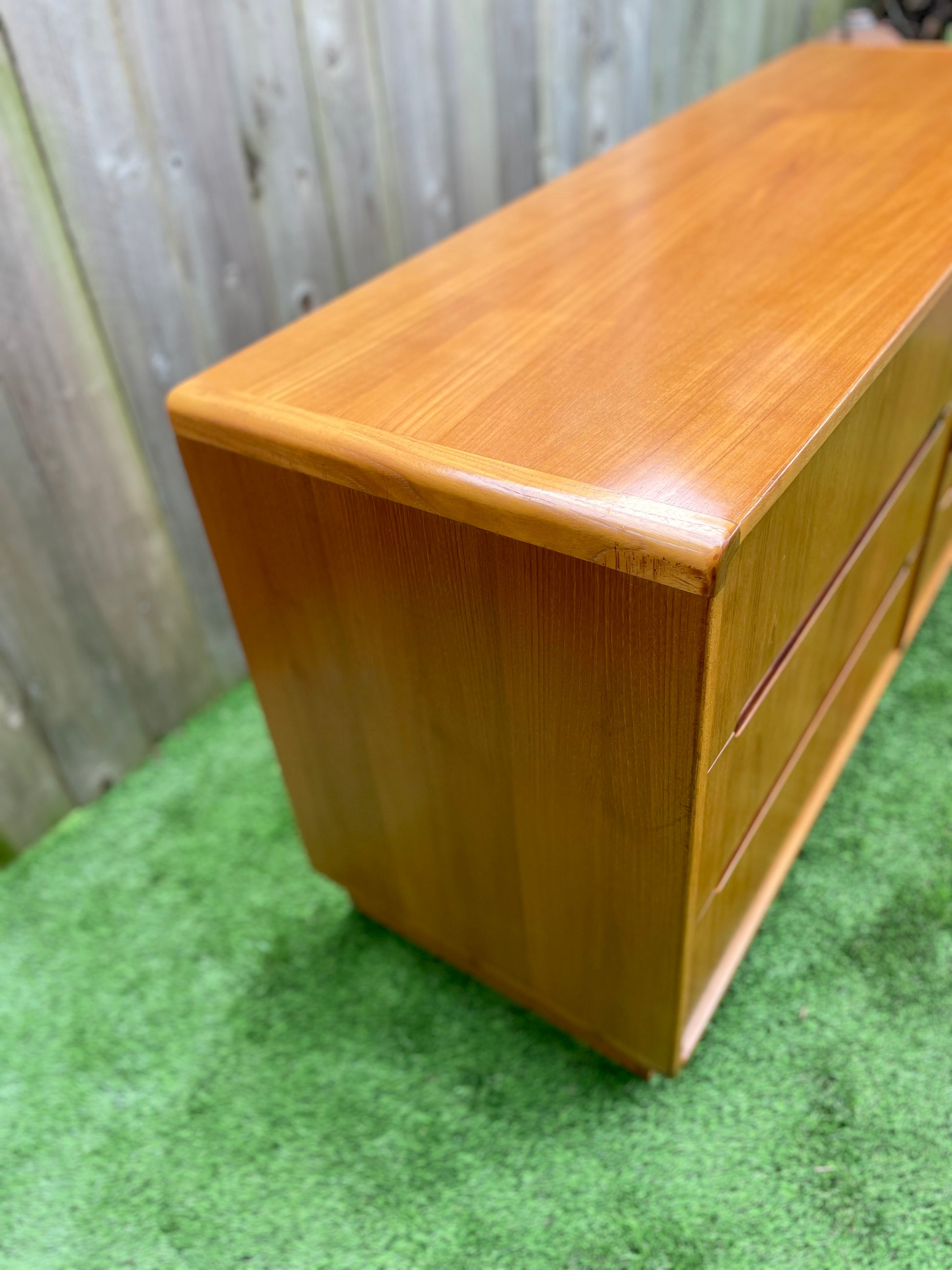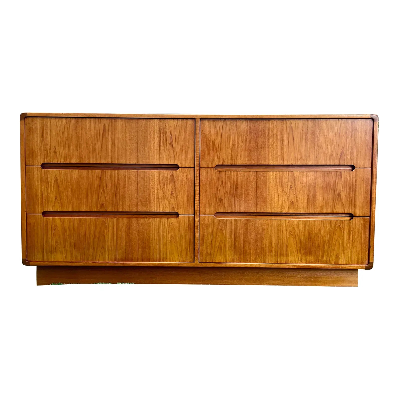 A Danish Modern Style Lowboy Dresser crafted from richly grained teak wood. Featuring six roomy drawers with integrated pulls, this dresser offers both style and functionality. The sleek design and quality craftsmanship make it a perfect addition to any modern or mid-century inspired decor. Organize essentials in style with this timeless piece. Bring Scandinavian charm to your home!
