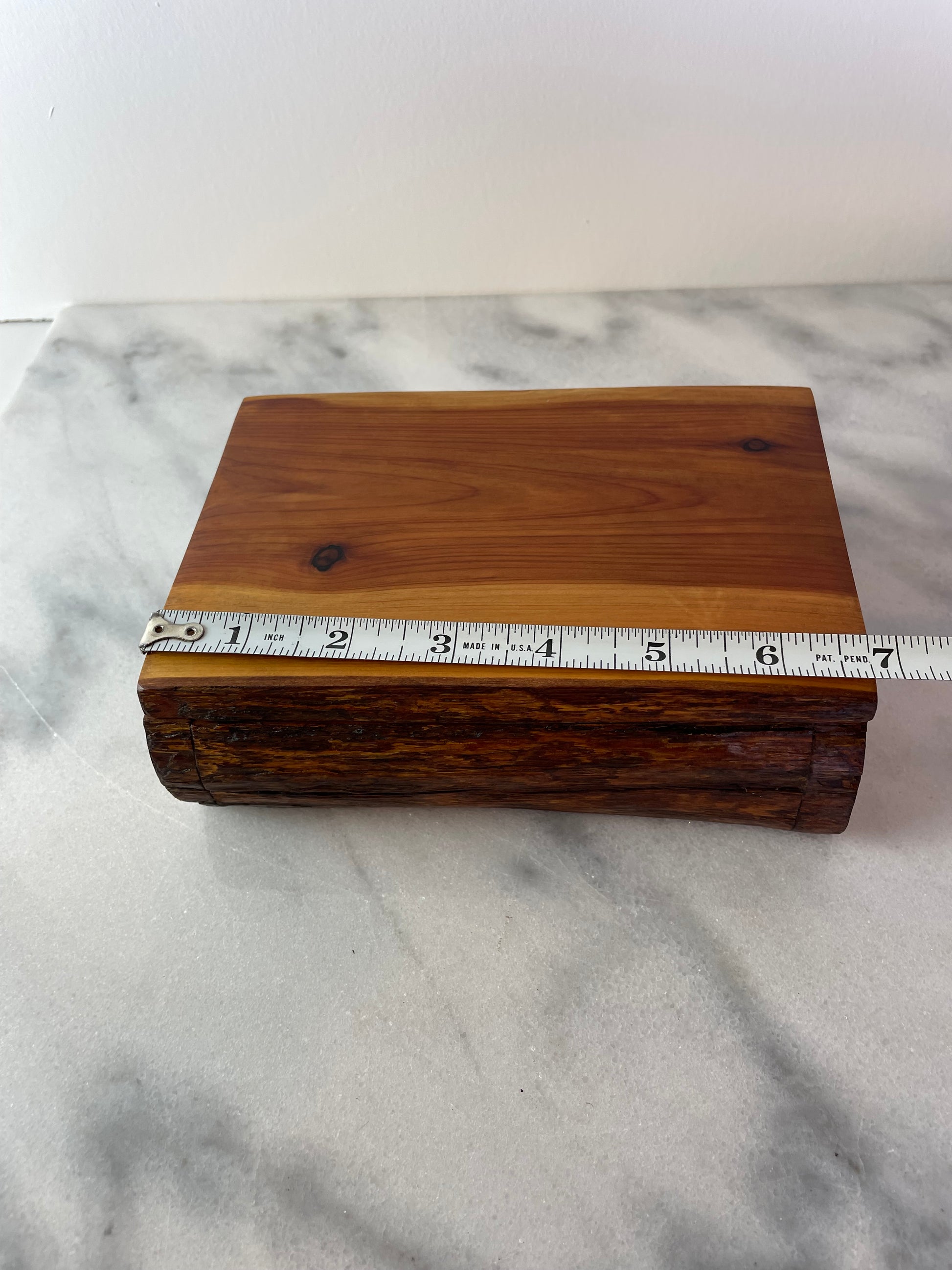This vintage wood jewelry or stash box features hand made craftsmanship that naturally showcases the organic character of the wood with the front face retaining tree bark texture and the top and sides sanded smooth and finished with natural oil to showcase the grain and history of the wood.