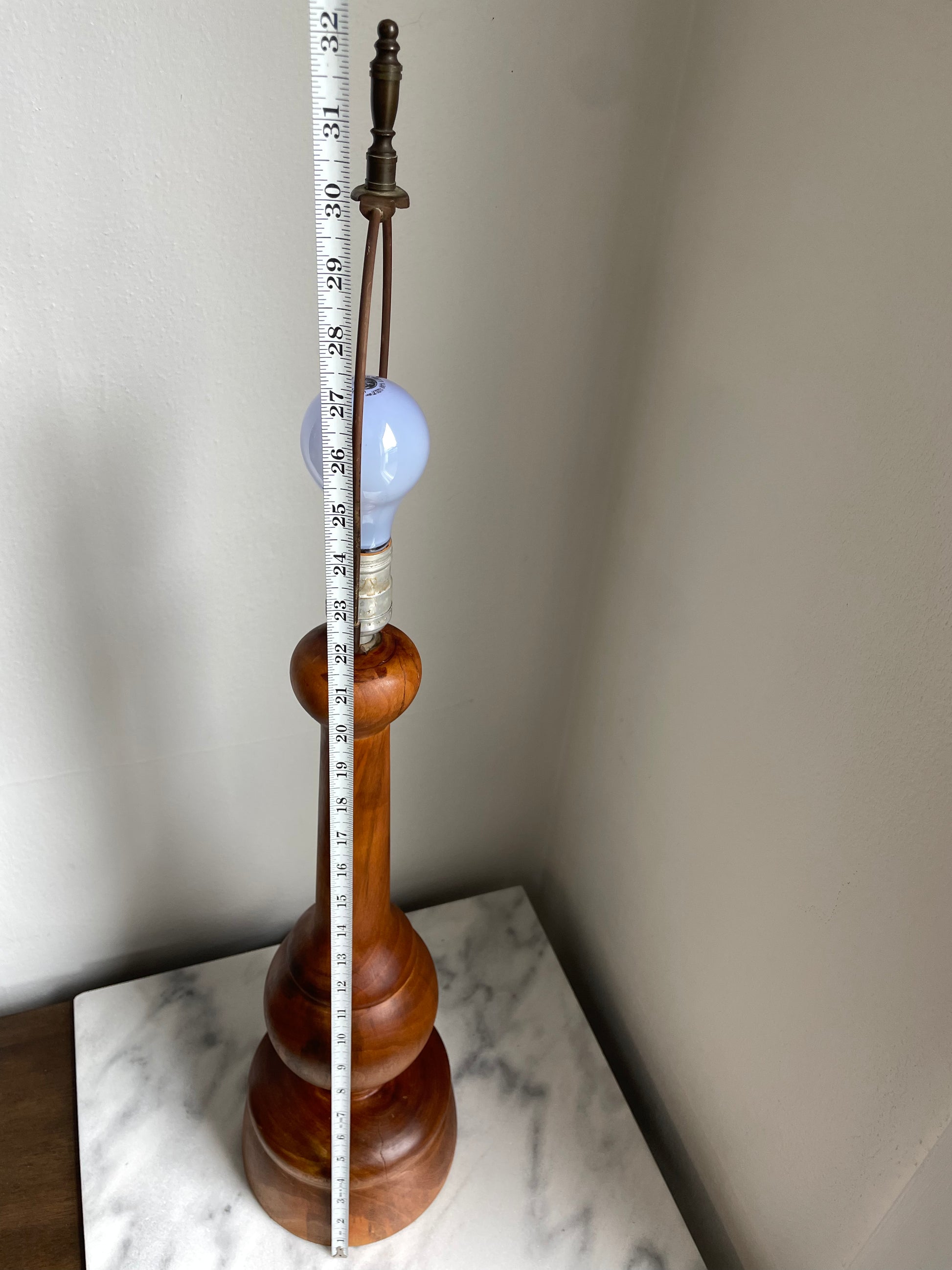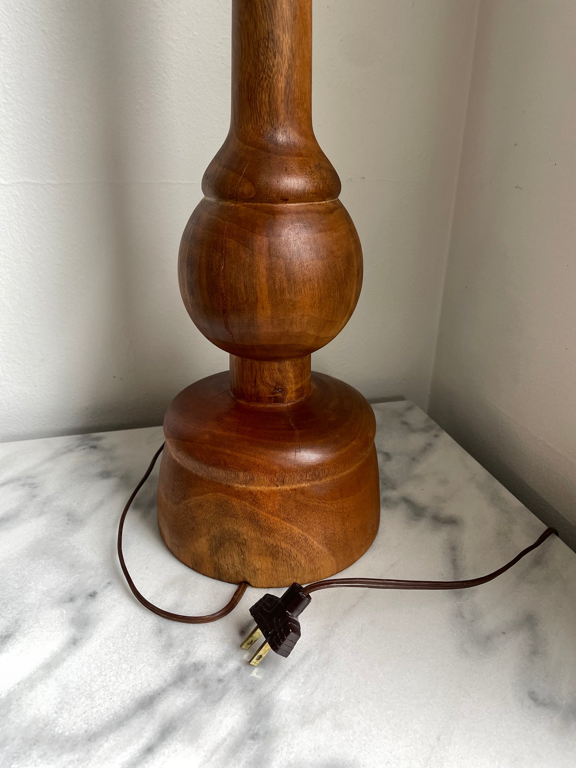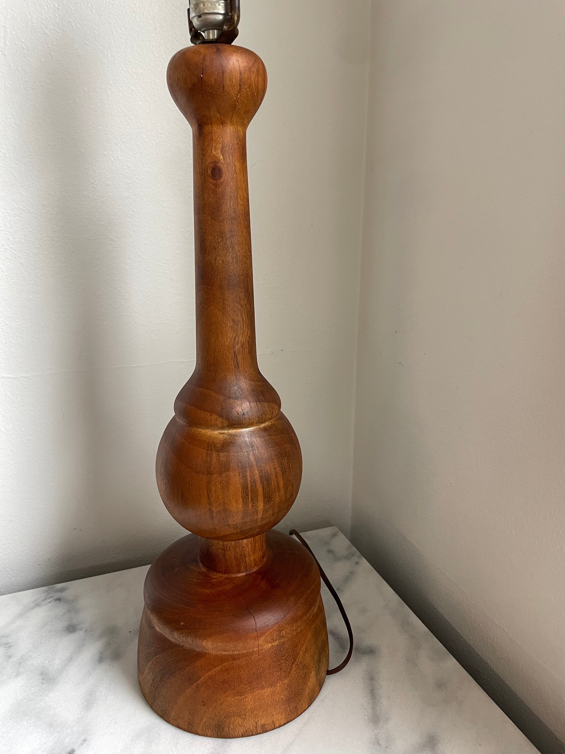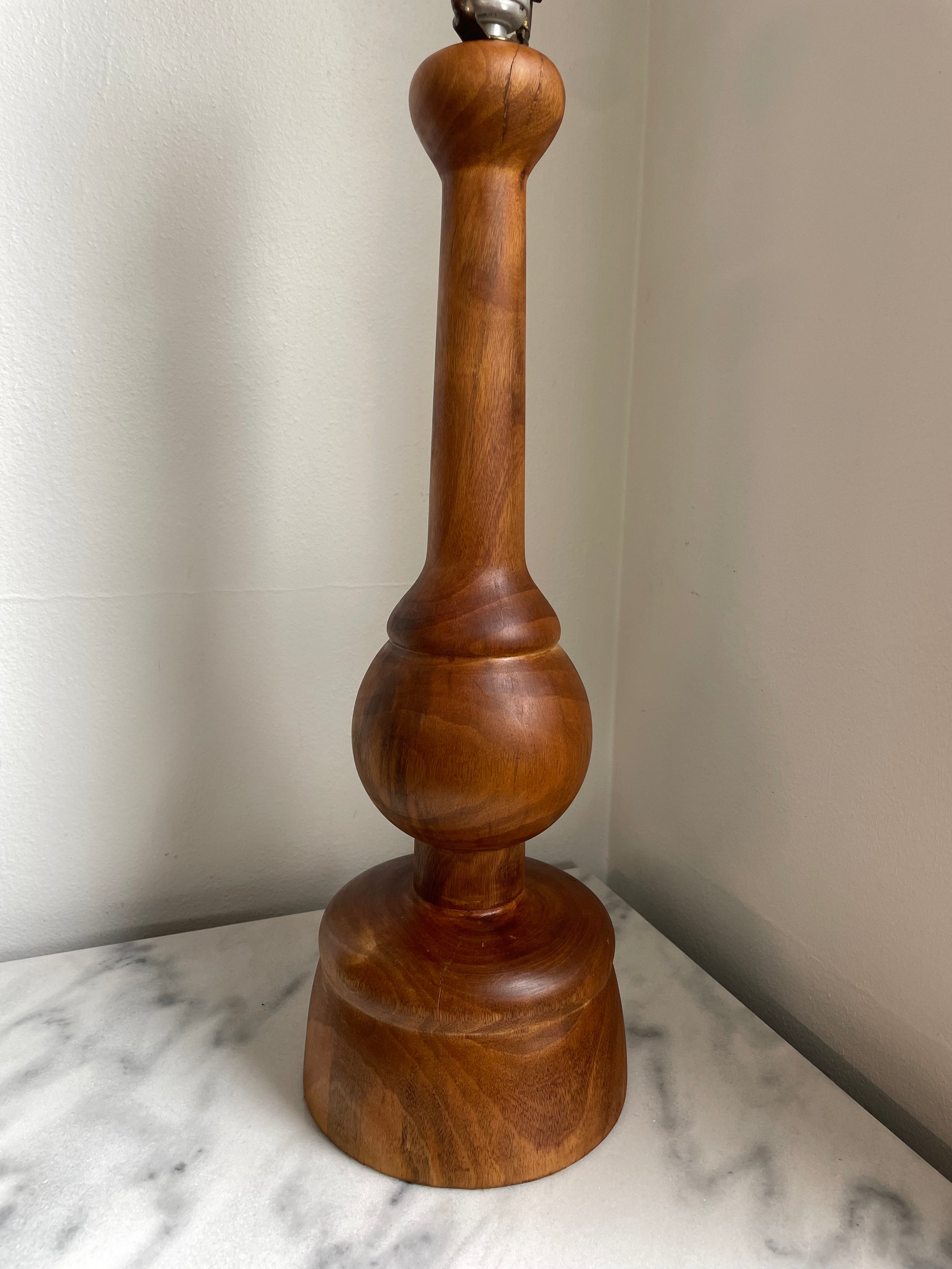 A vintage hand turned wood craft lamp featuring bulbous design and a tapered form.