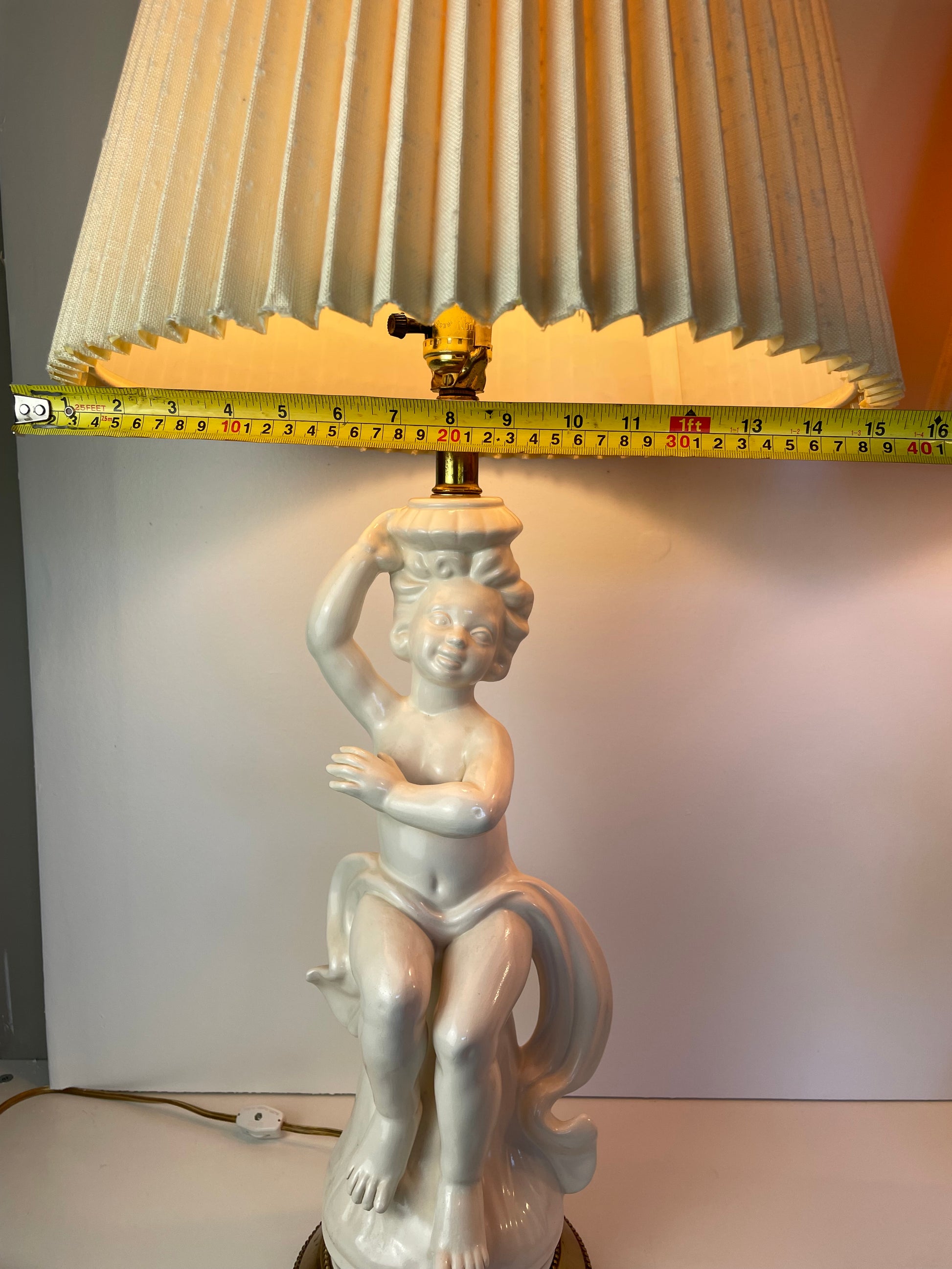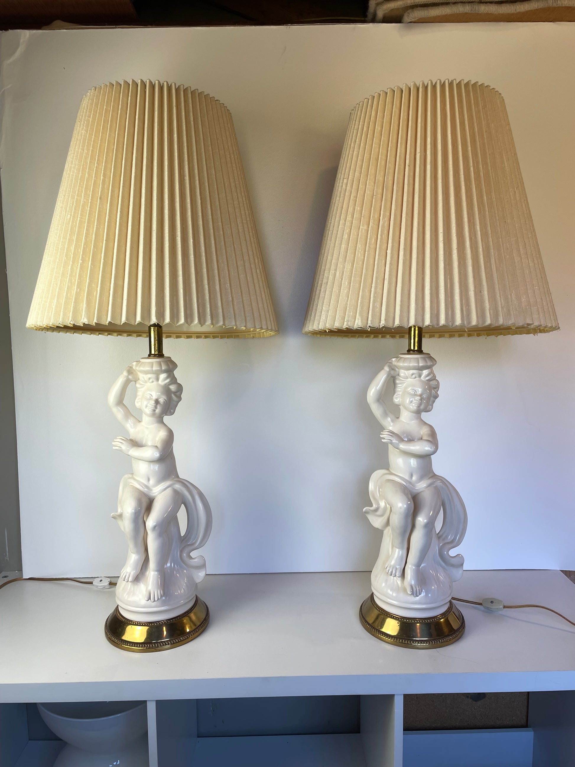Mid 20th Century Hollywood Regency White Porcelain Cherub Lamps - A Pair