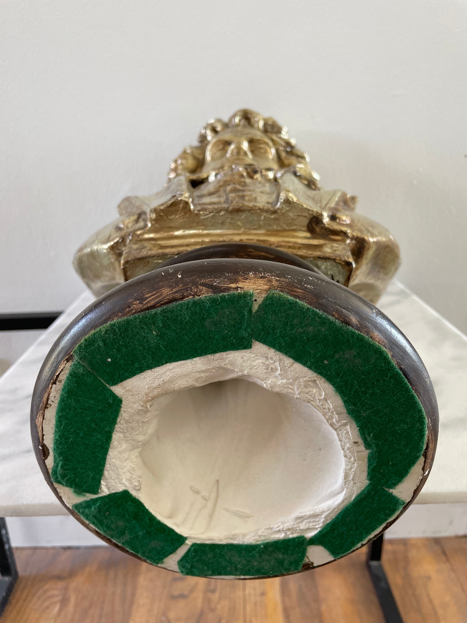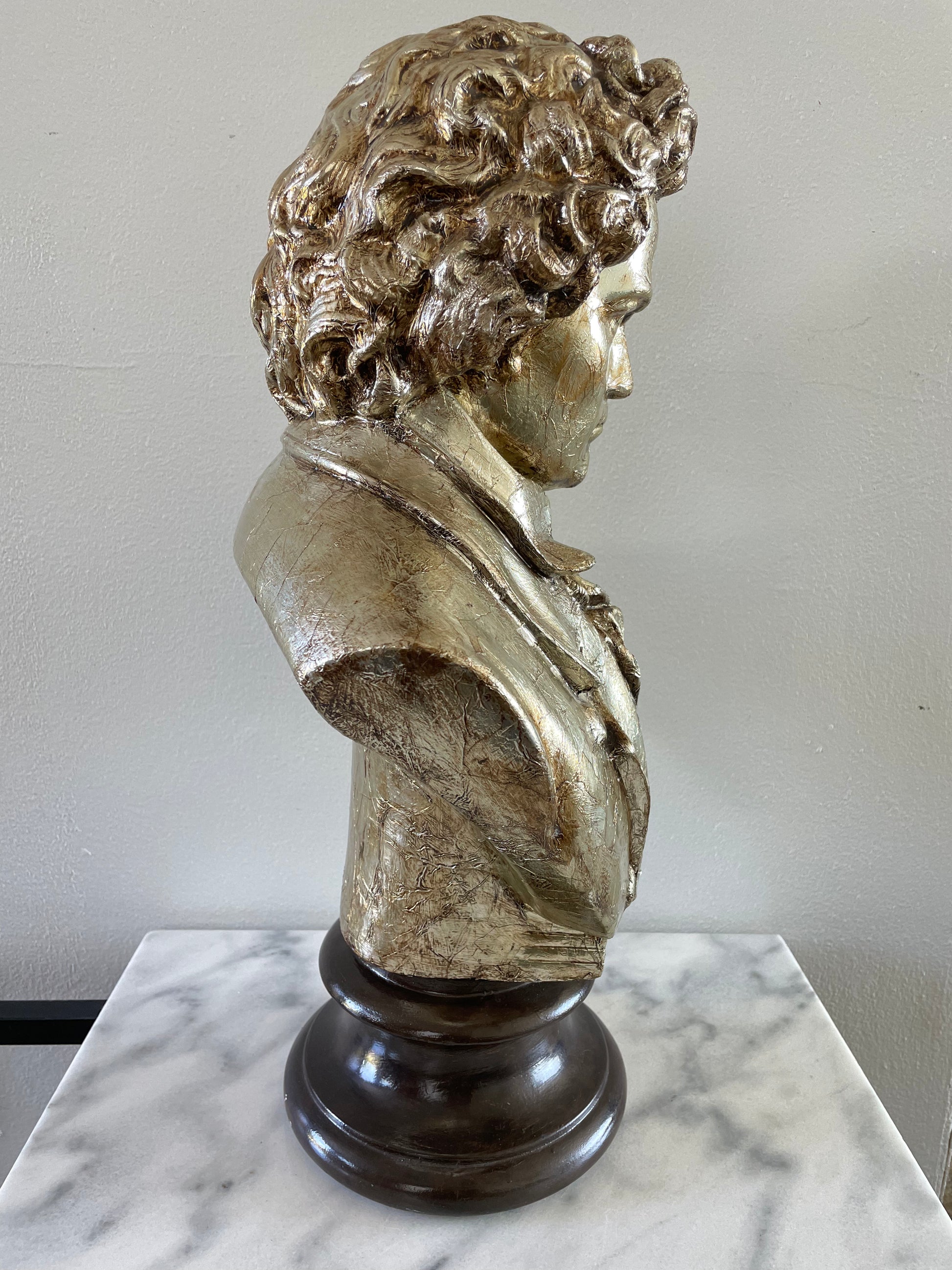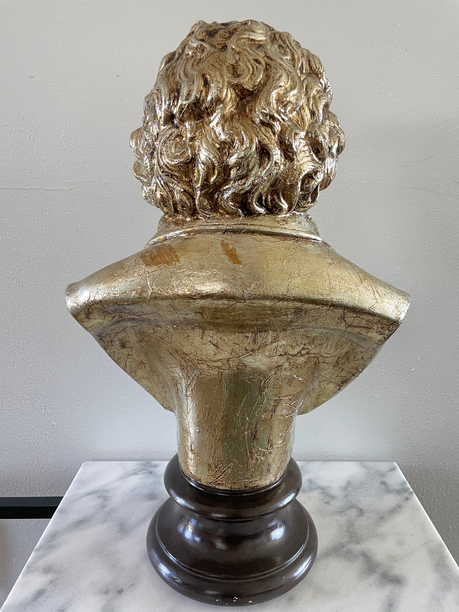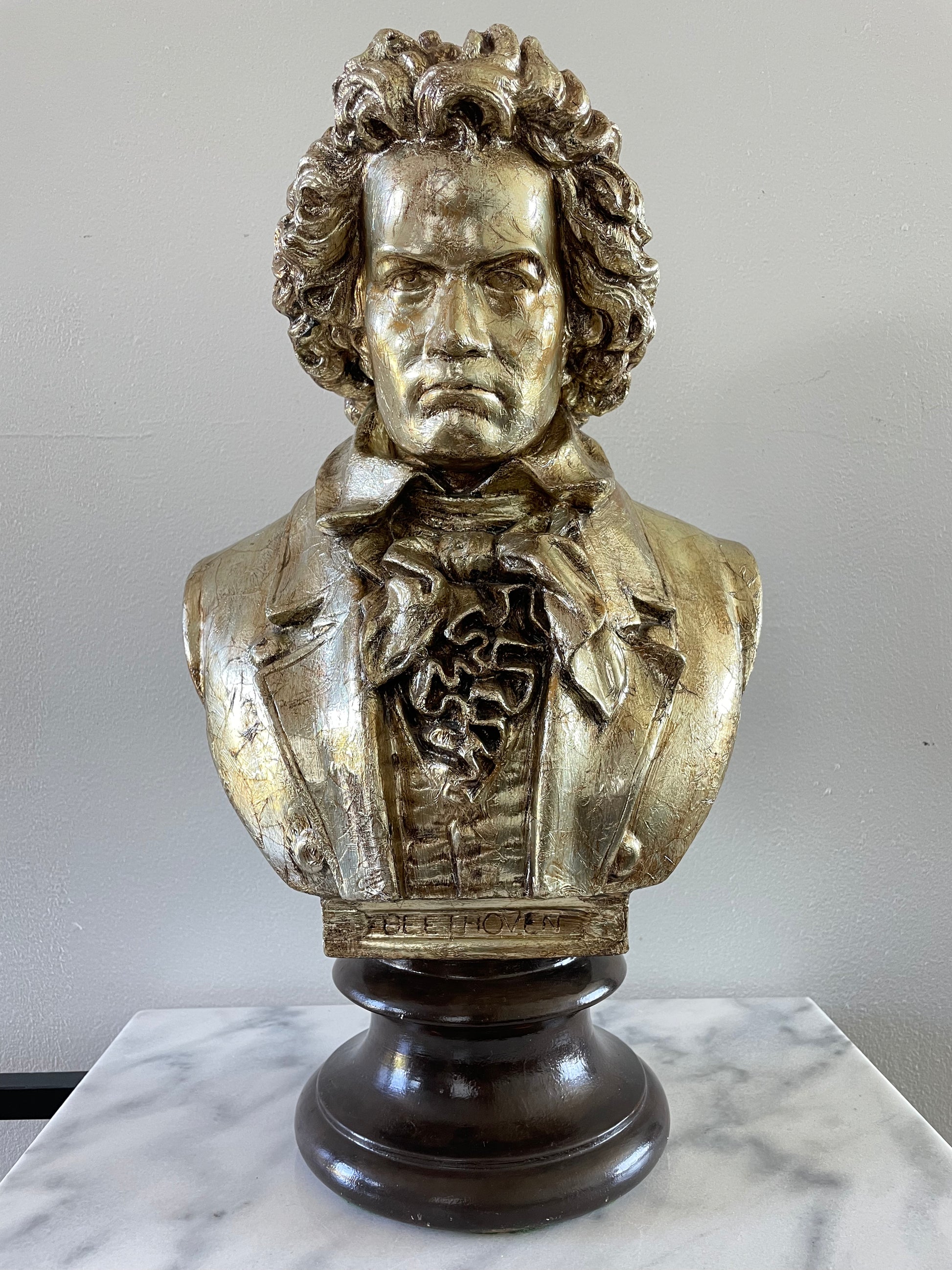 A large bust of Ludwig van Beethoven, a German composer and pianist who lived from 1770 to 1827. This sculpture is made of plaster with a painted and gilt gold leaf surface.