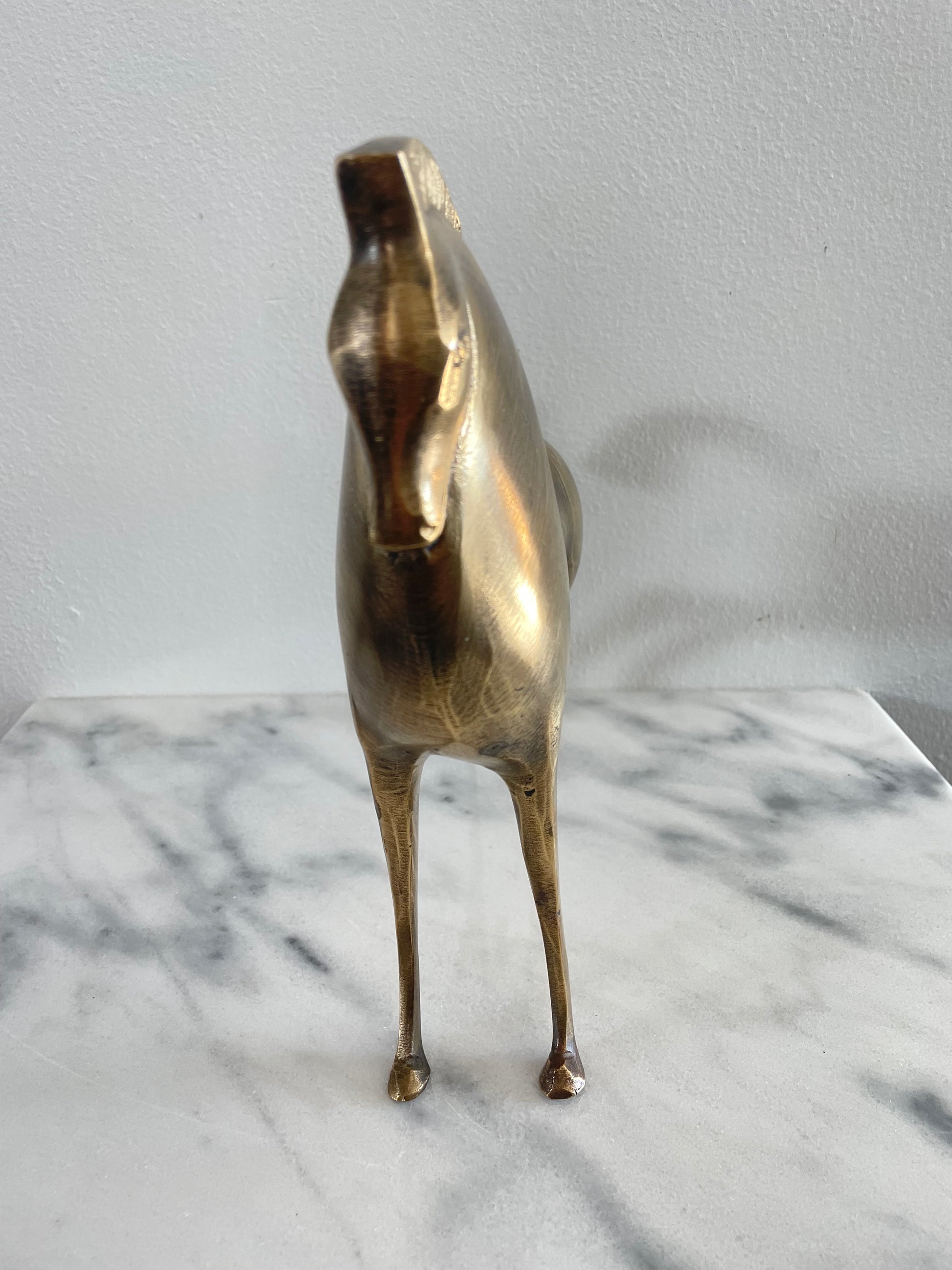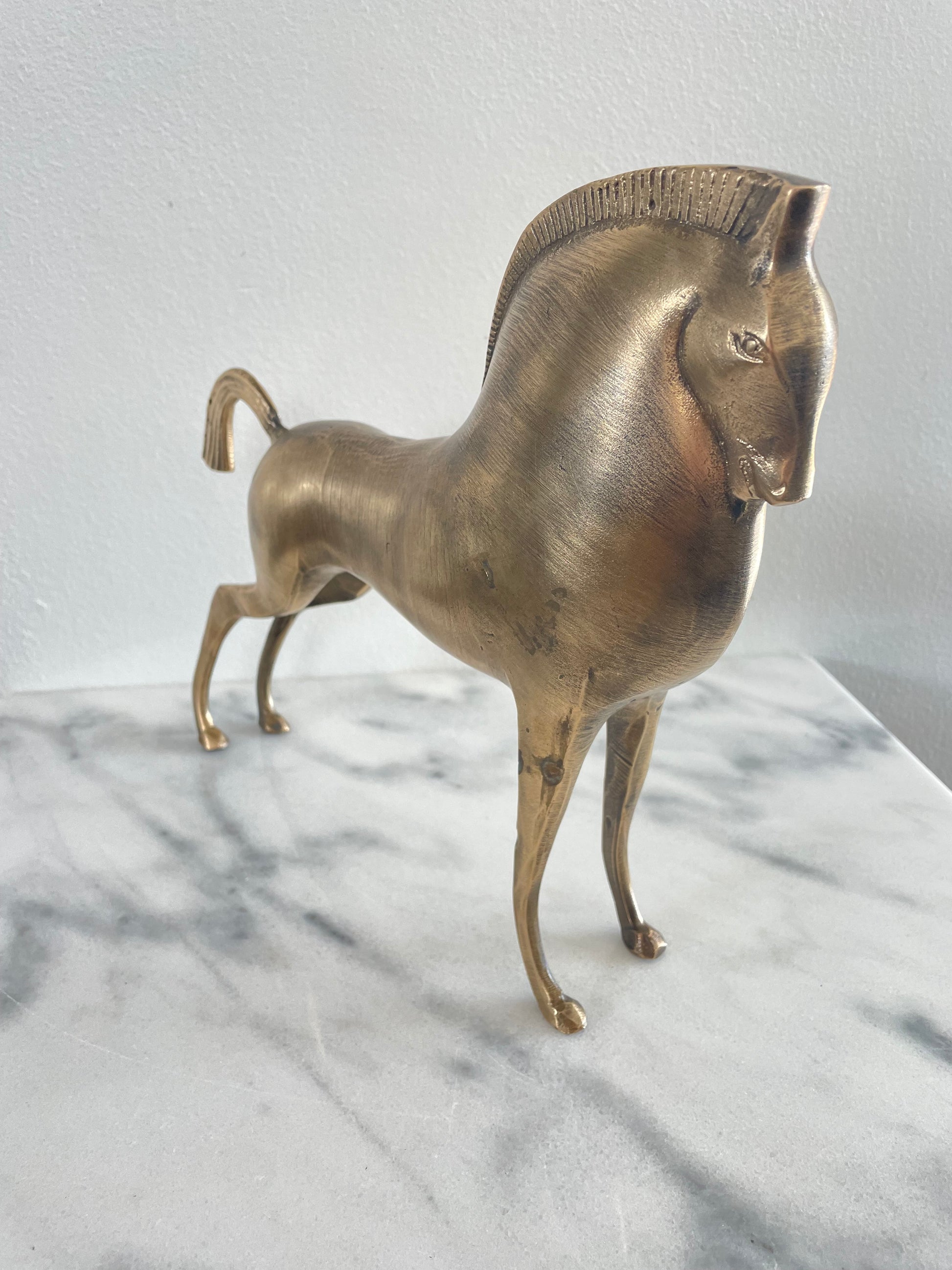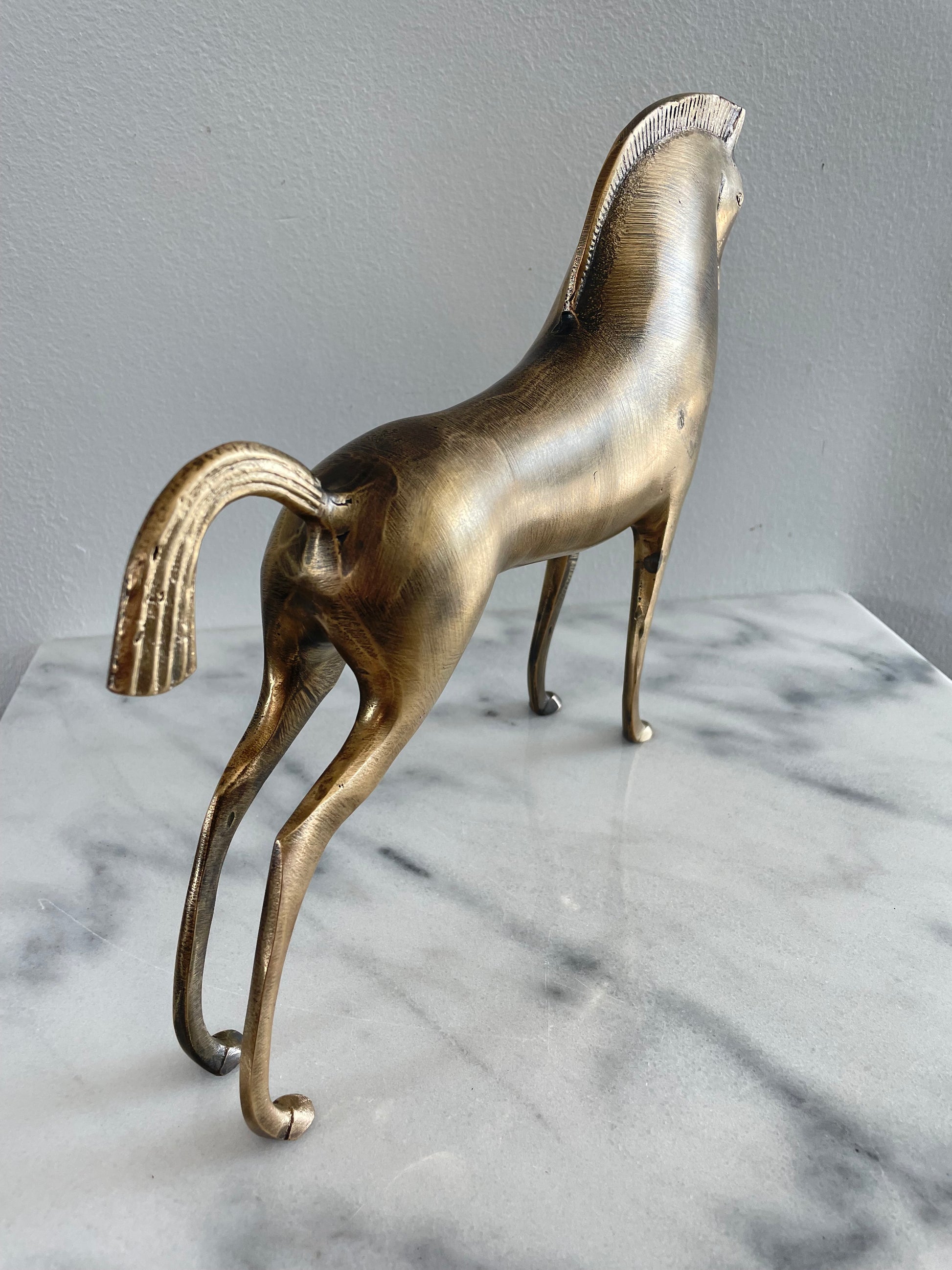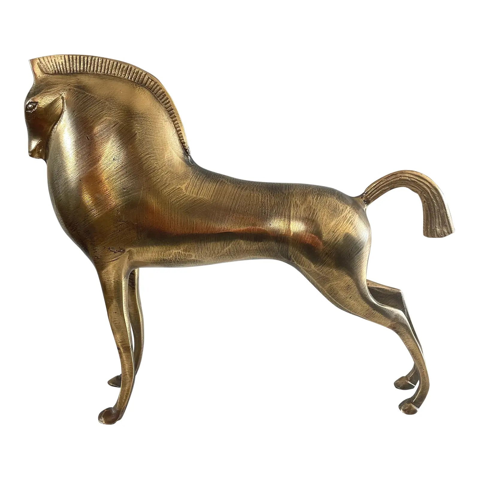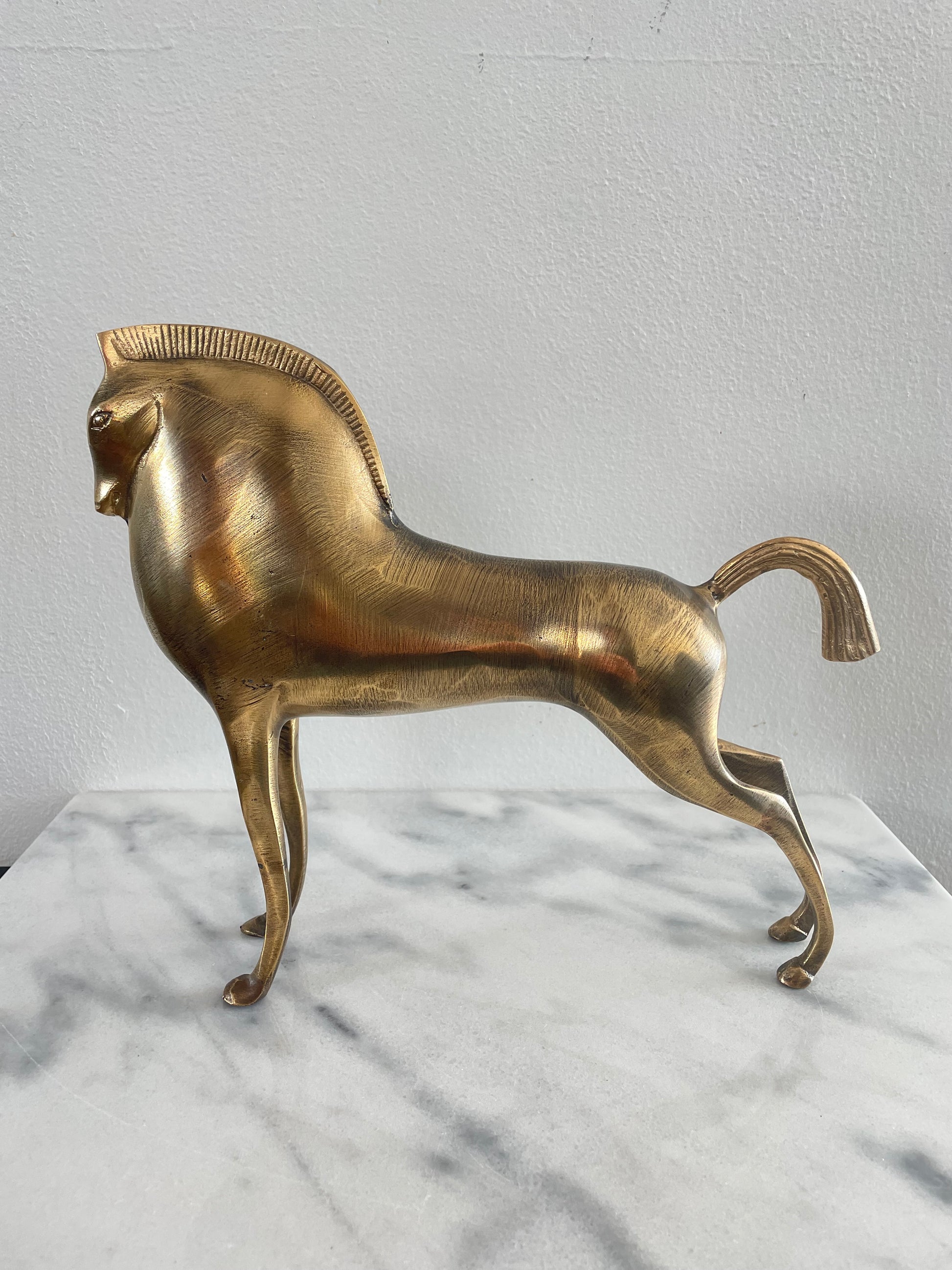 A sculpture of a Etruscan style standing horse in brass toned metal in the manner of Boris Lovet-Lorski.