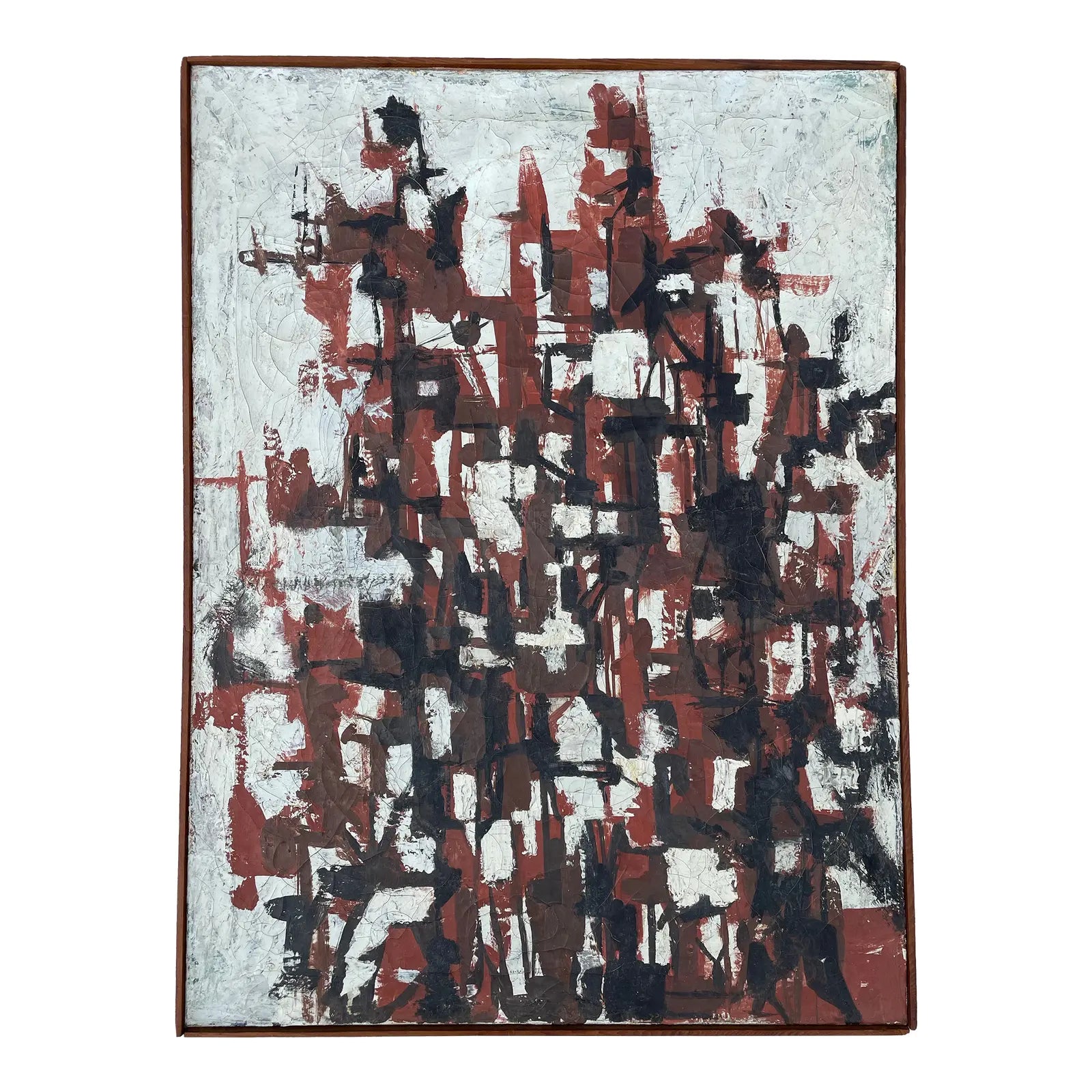A signed vintage painting on canvas. This painting has a great aged character with original artist thin wood frame. The painting has noticeable cracking throughout, but it is all still intact. The work features a minimal palette of grey, red, and black in an abstract composition. Painting is signed on the back and has remnants of a paper label as pictured.