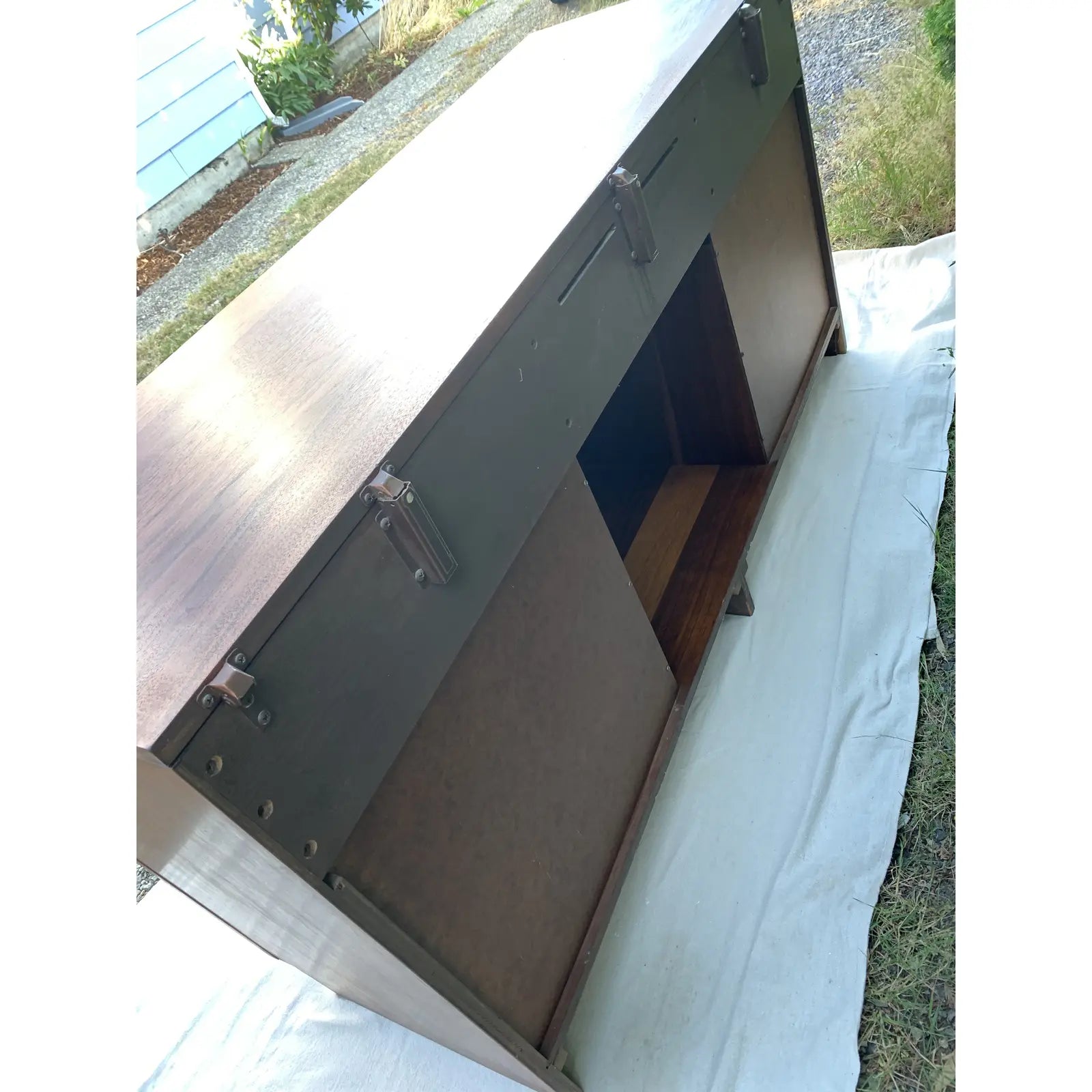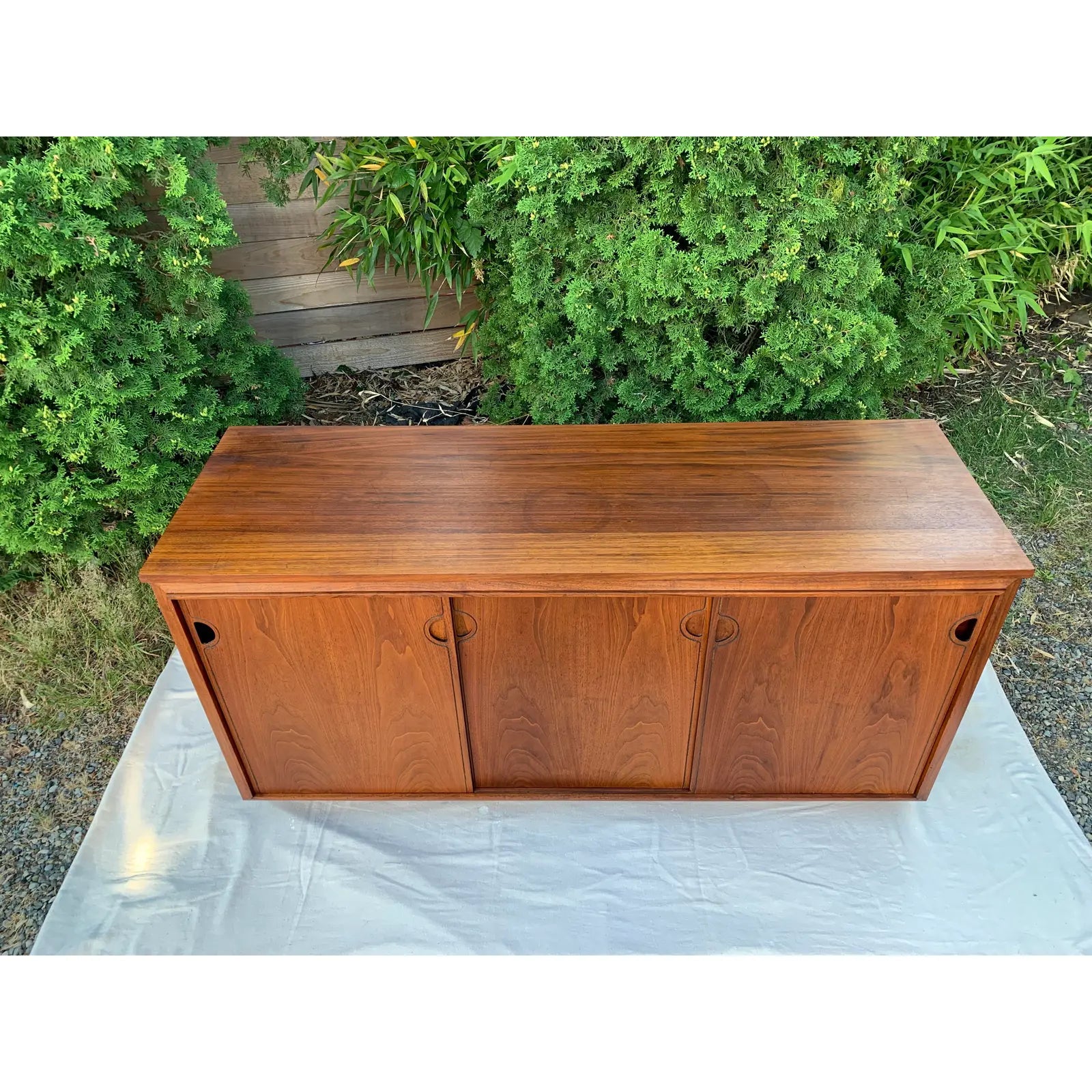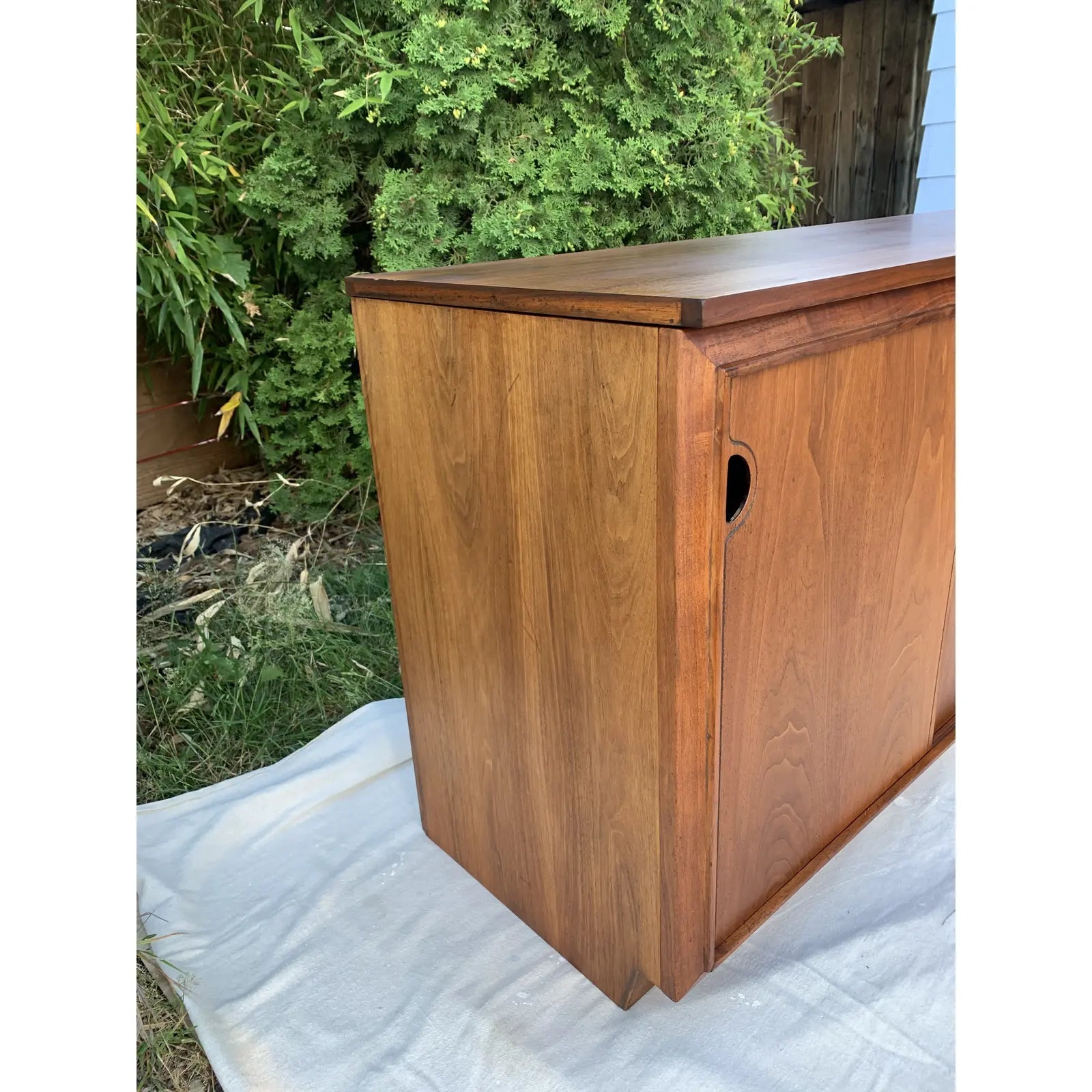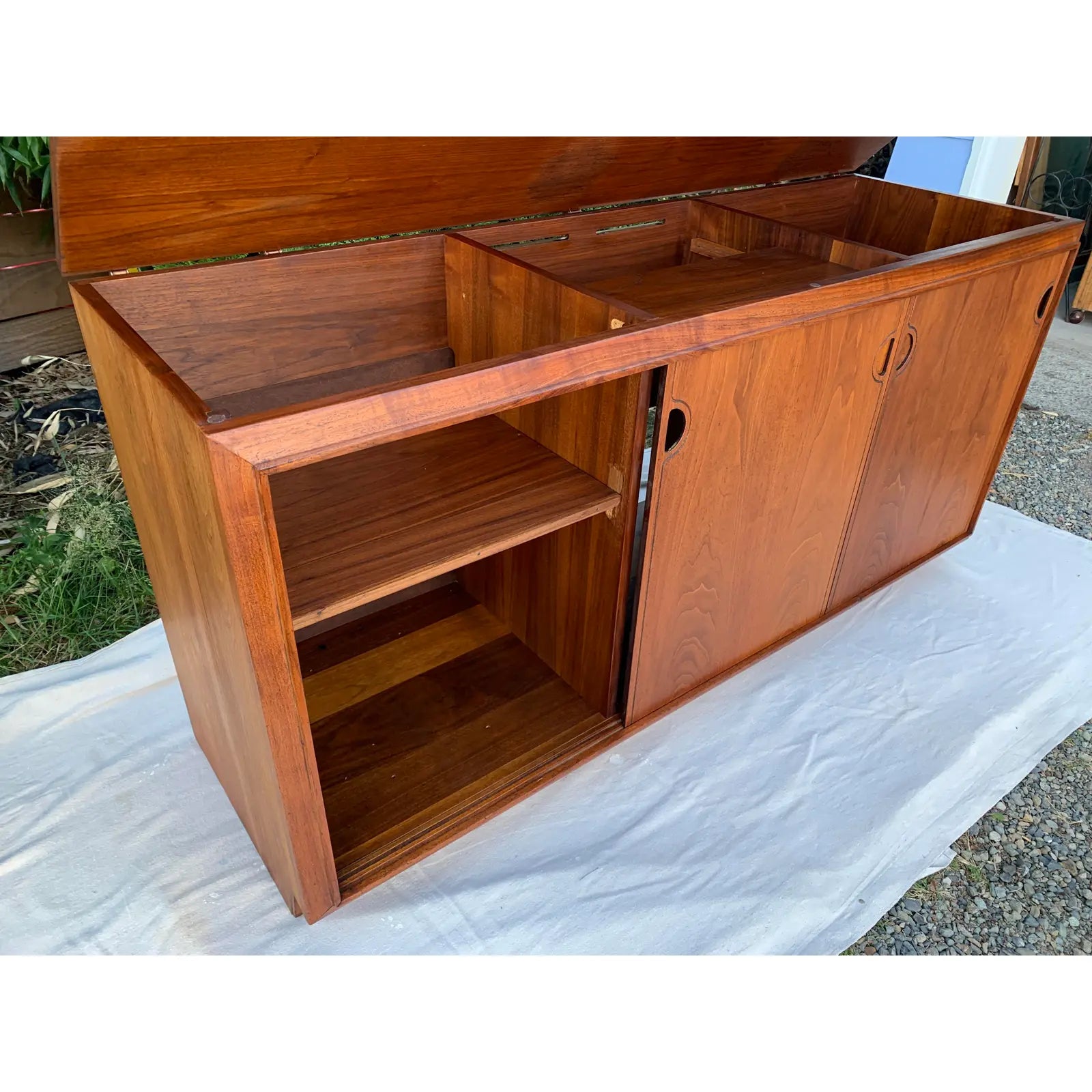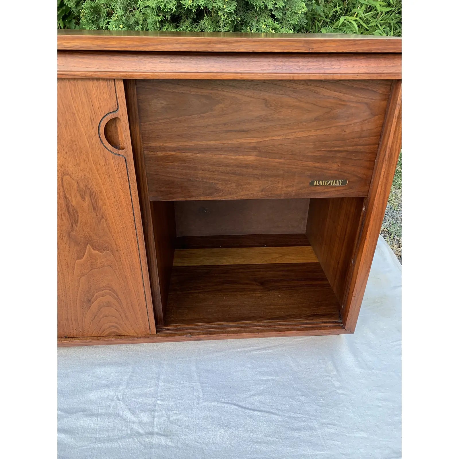 Vintage Mid-Century Modern walnut credenza with sliding panel doors by Barzilay. This cabinet originally housed a stereo unit, so it has an open back.