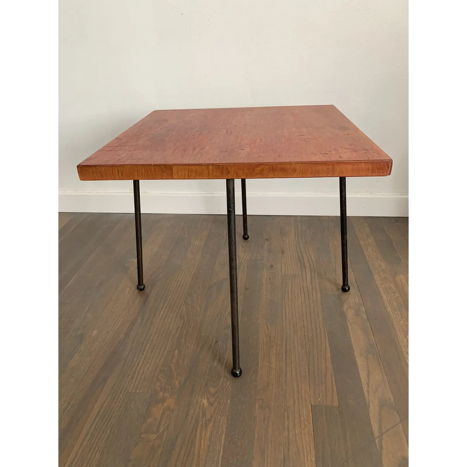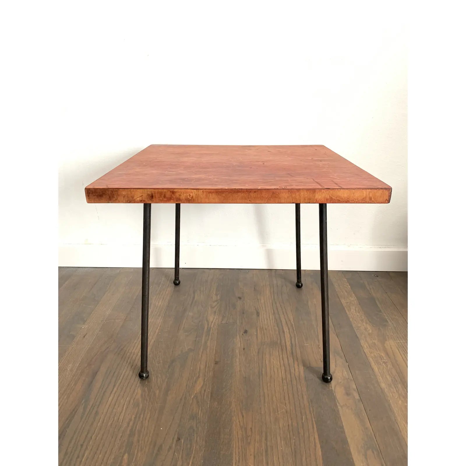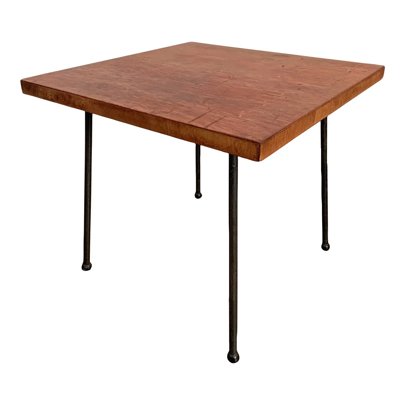 A vintage mid-century California modern style side table featuring heavy iron legs with ball feet and a red-toned plywood top that swivels around. This table is in the style of Arthur Umanoff or Tony Paul, but it has no markings.