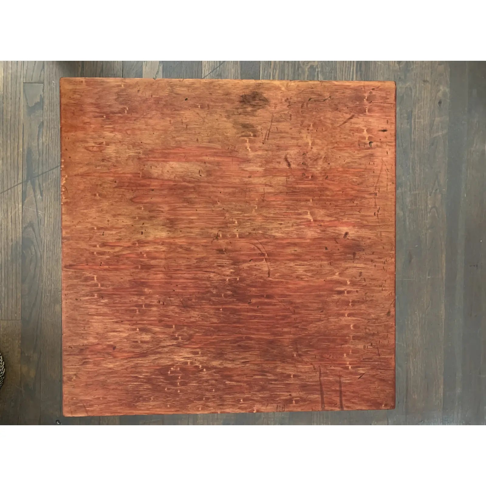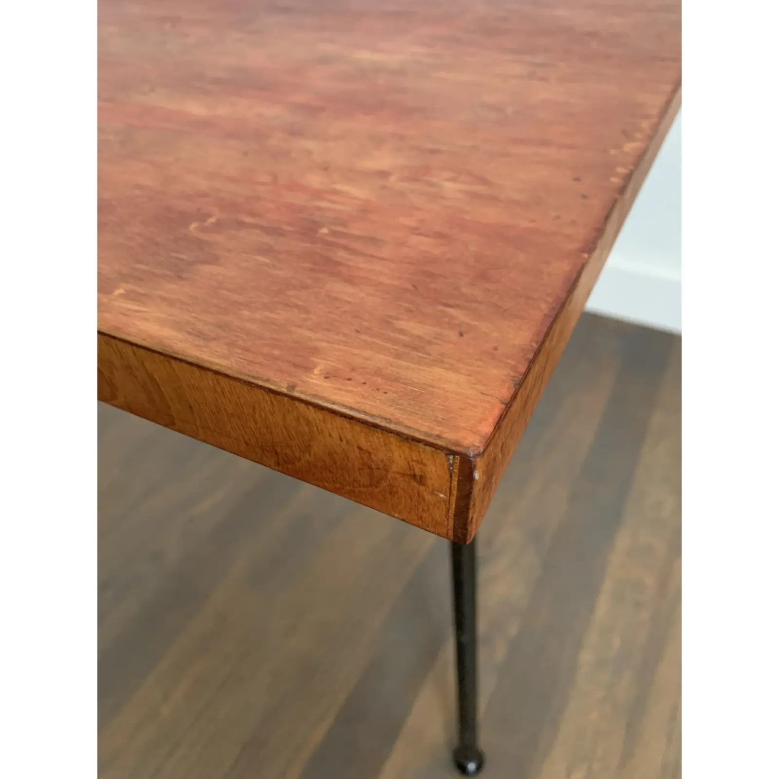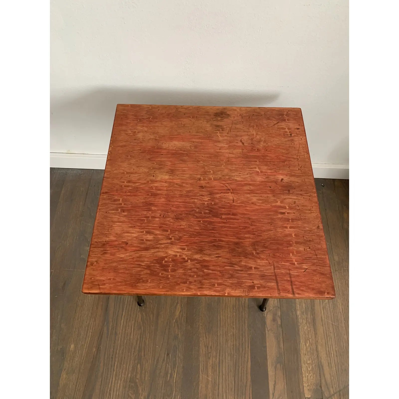 Lightly restored, but the table has some character - light scratches and gauges on the wood and some chips and rust on the base metal.
