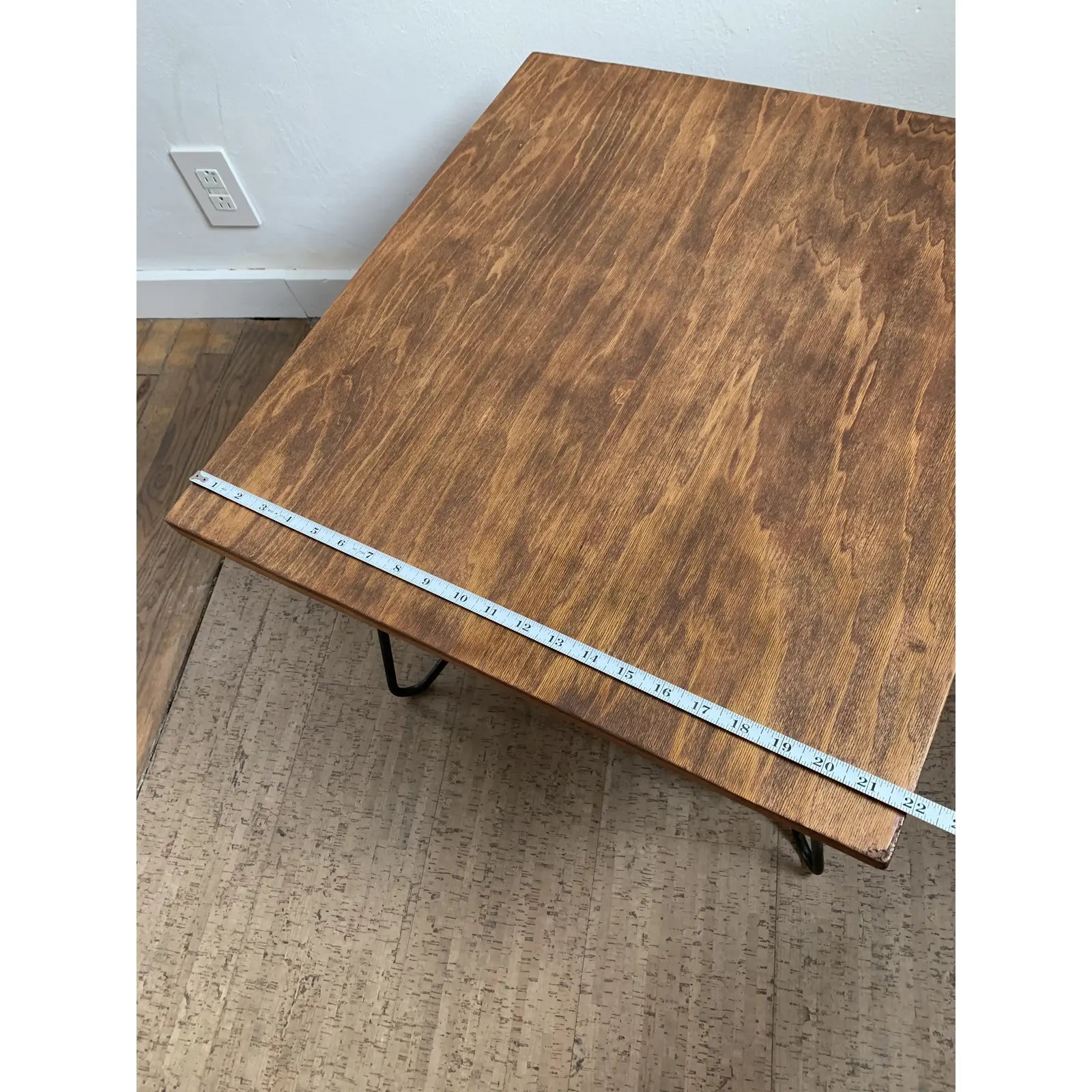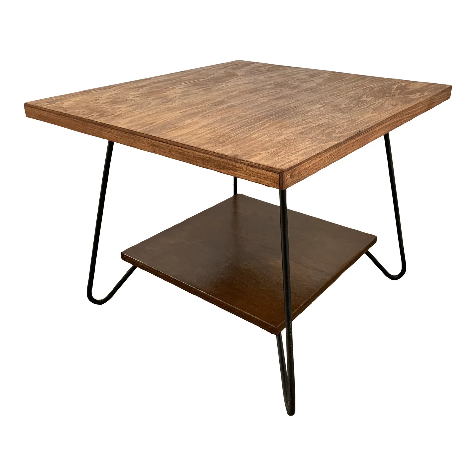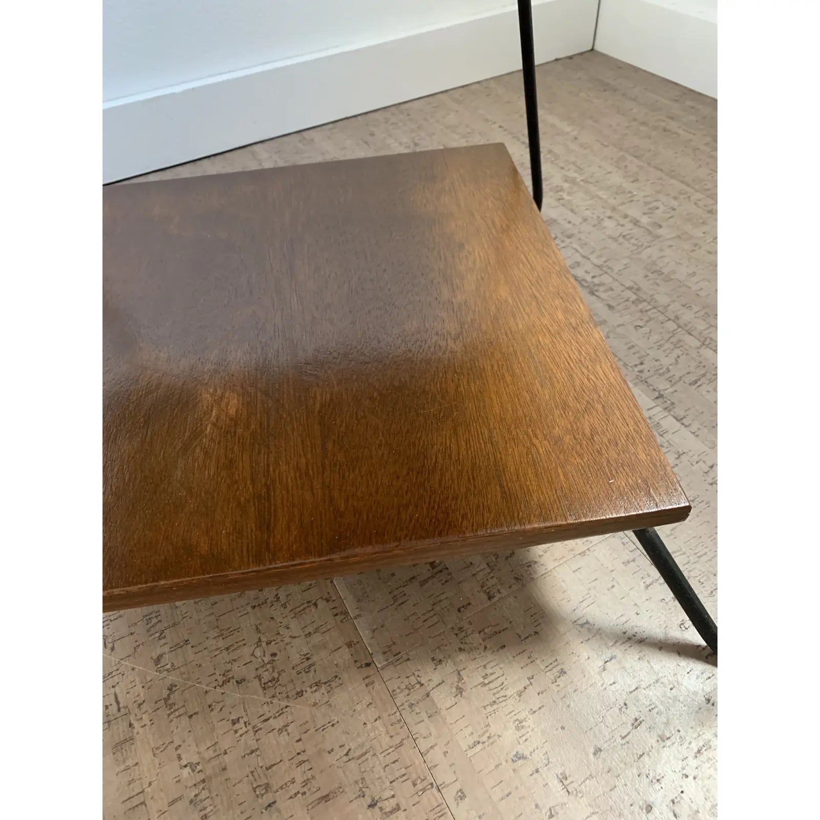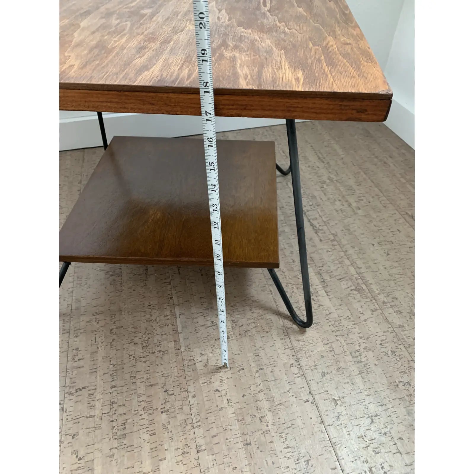 A vintage mid-century modern wood side table with two tiers and a swivel top. The table features hairpin style iron legs and medium-dark stained wood.
