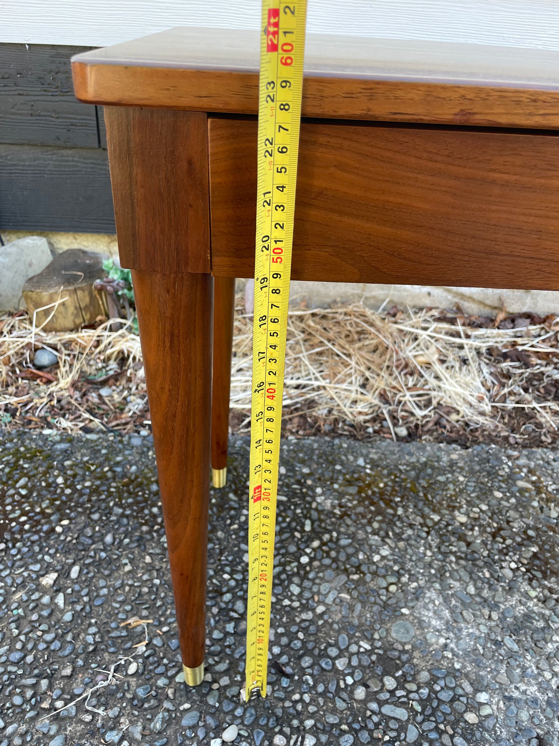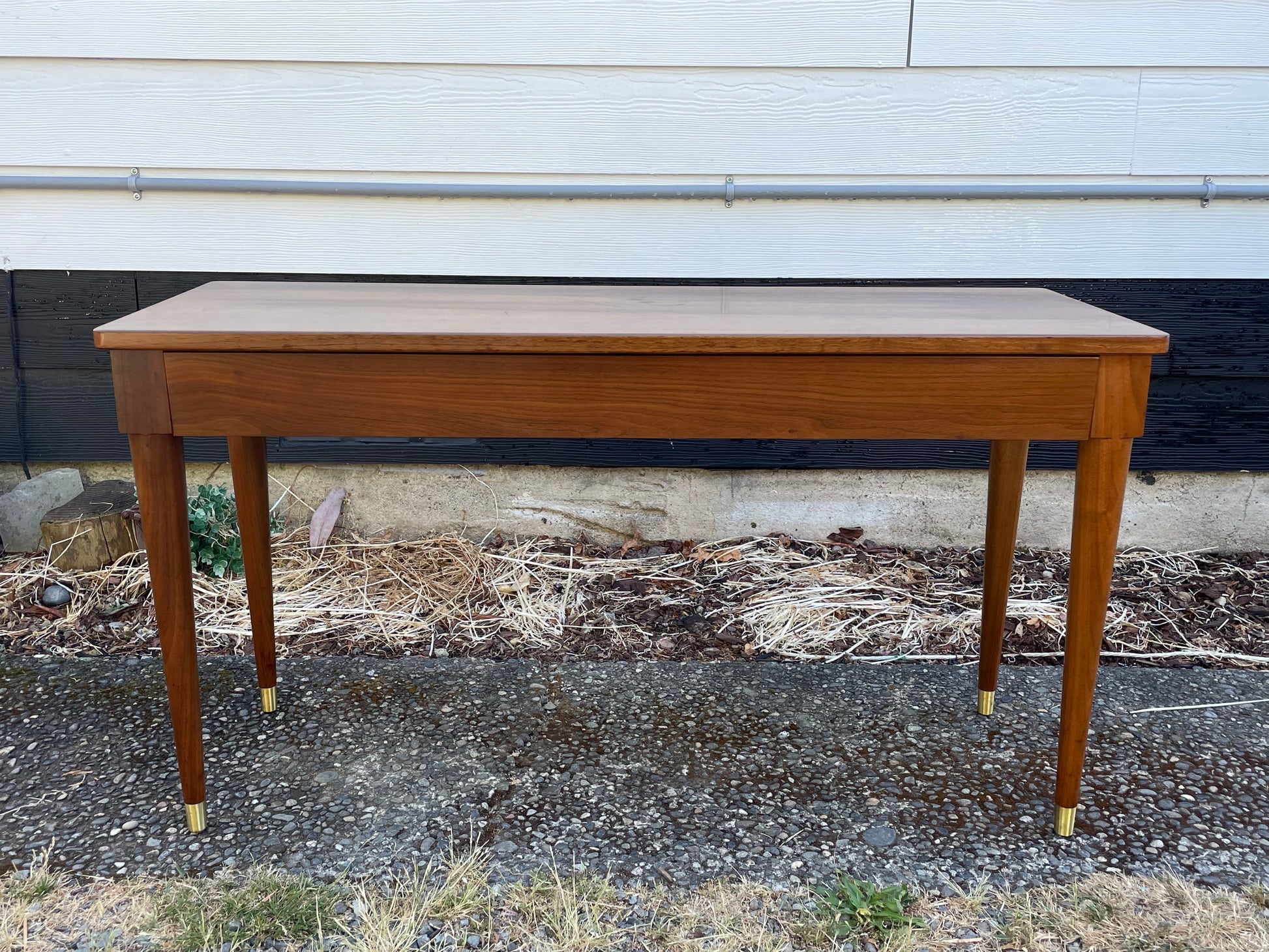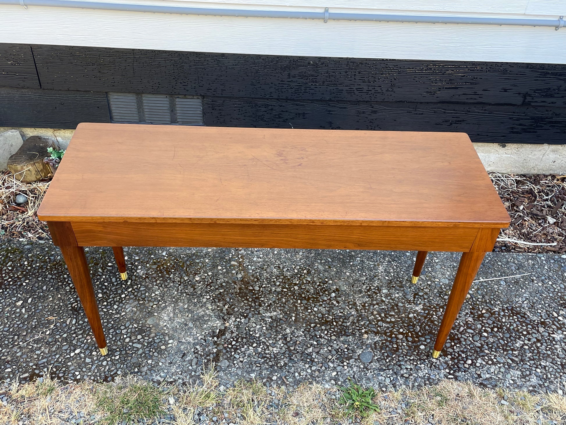 A vintage walnut piano bench with storage. The bench features tapered legs with brass capped