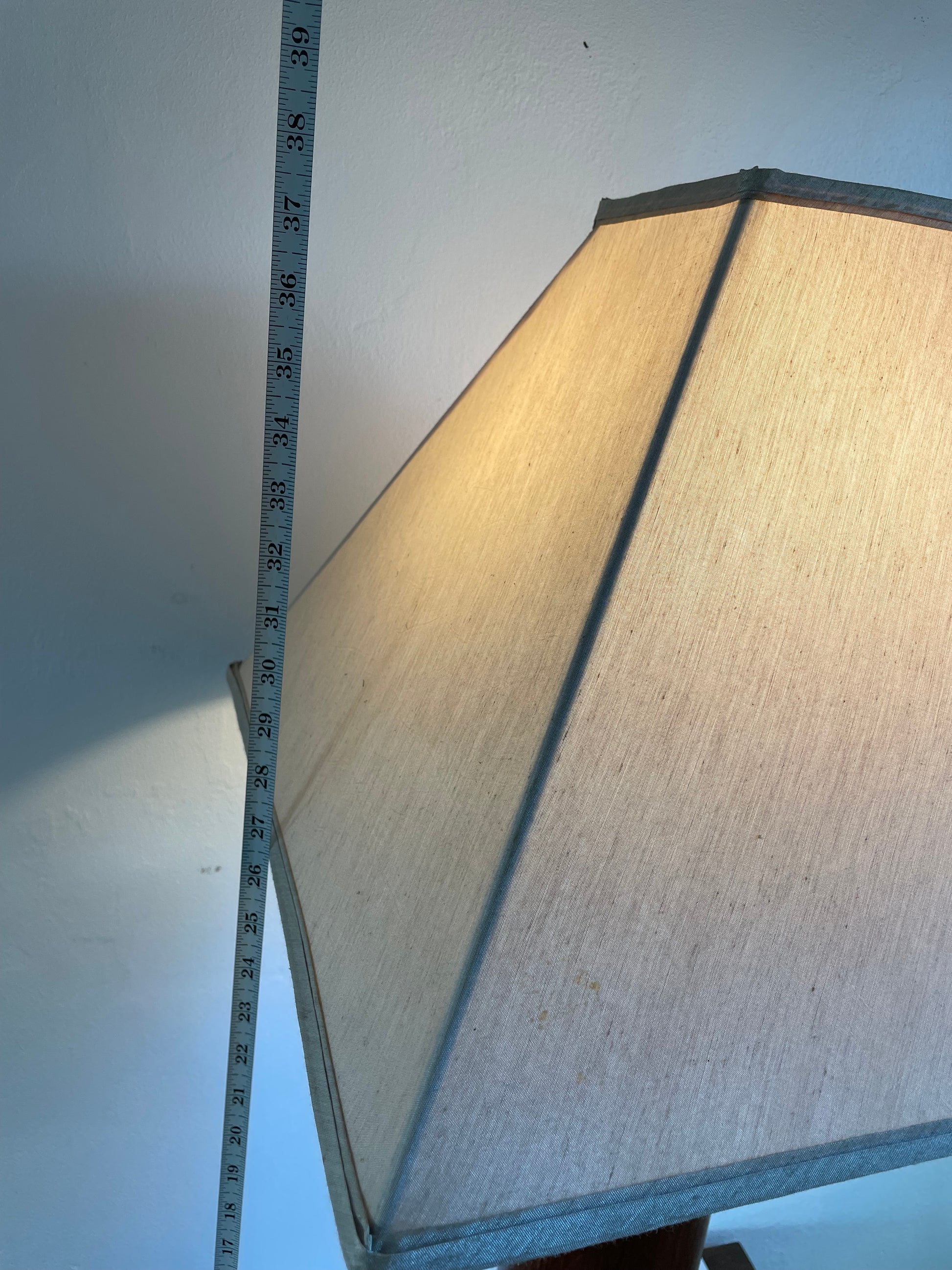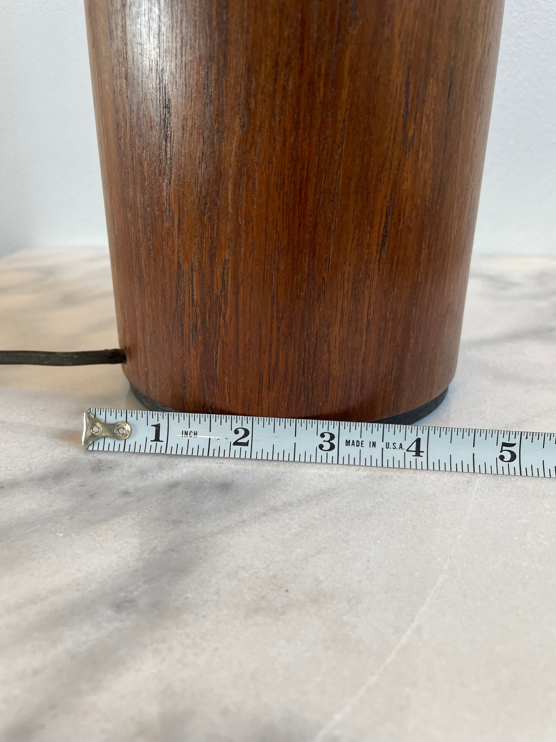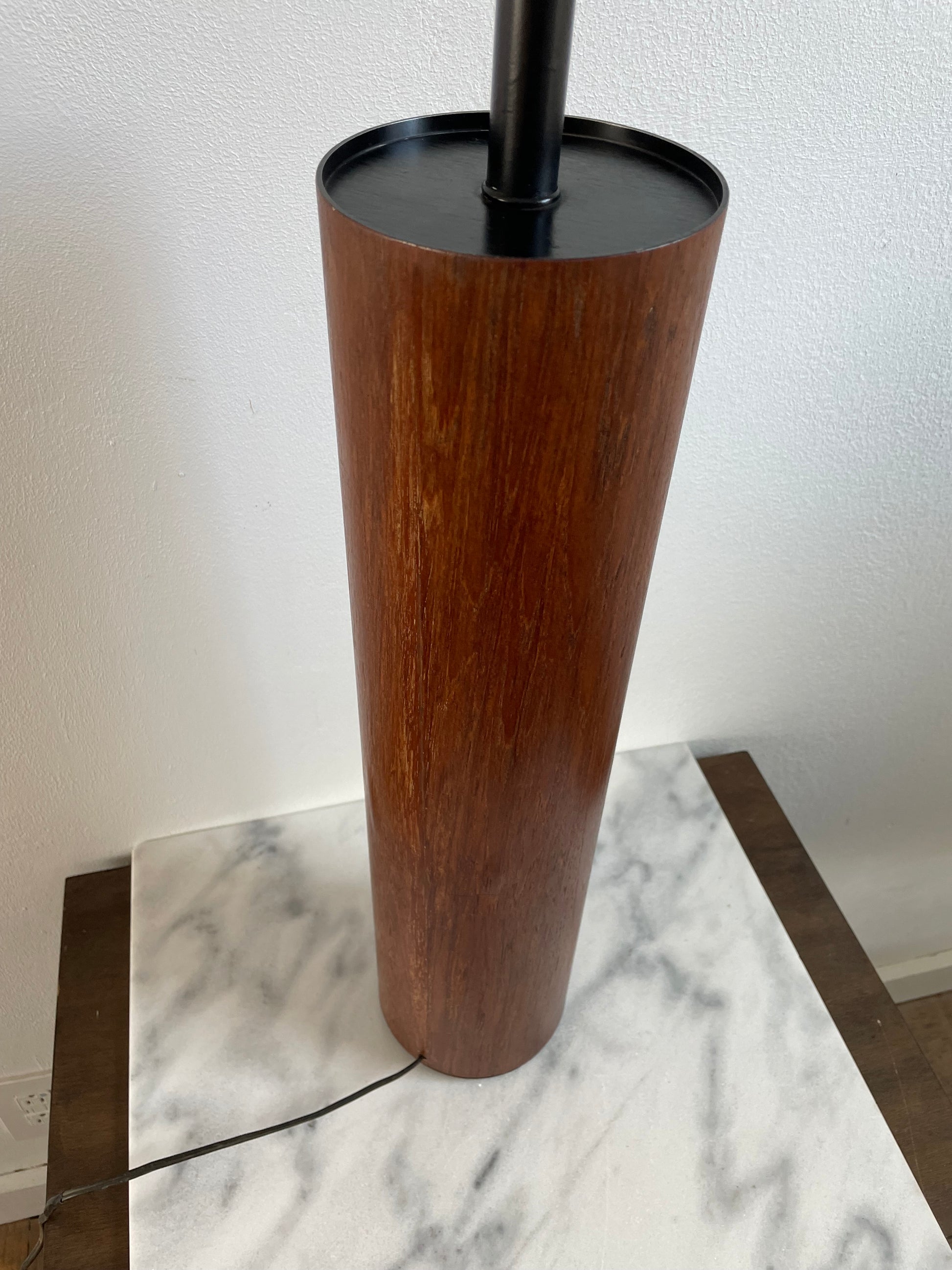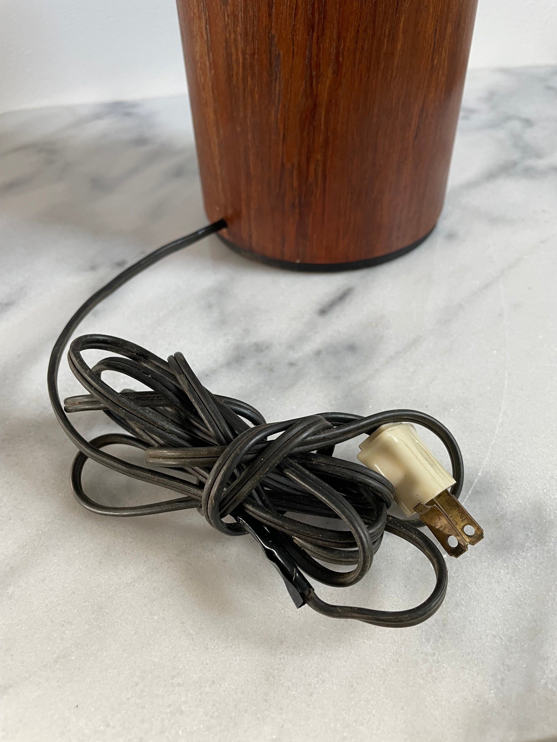 Good condition, lightly restored and oiled. The lamp has some areas where the texture feels raised but the veneer is in tact and it is barely visible. Original cord has a repair as pictured - rewiring may be recommended.