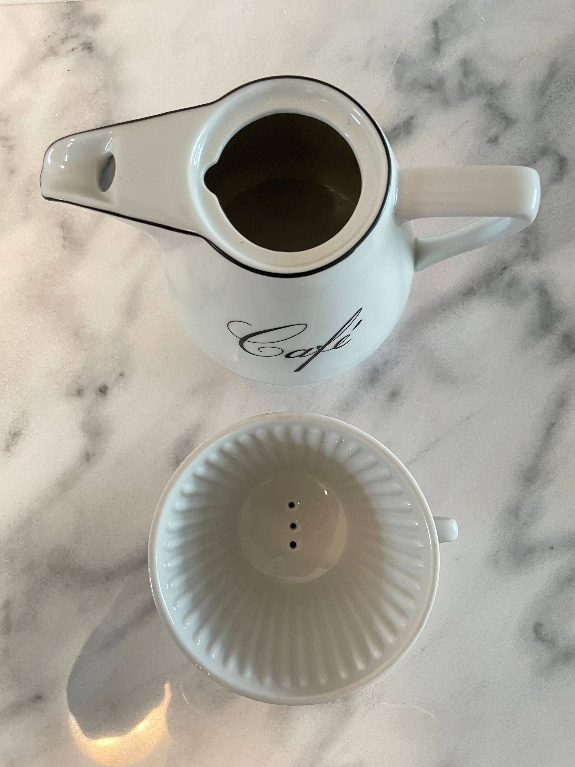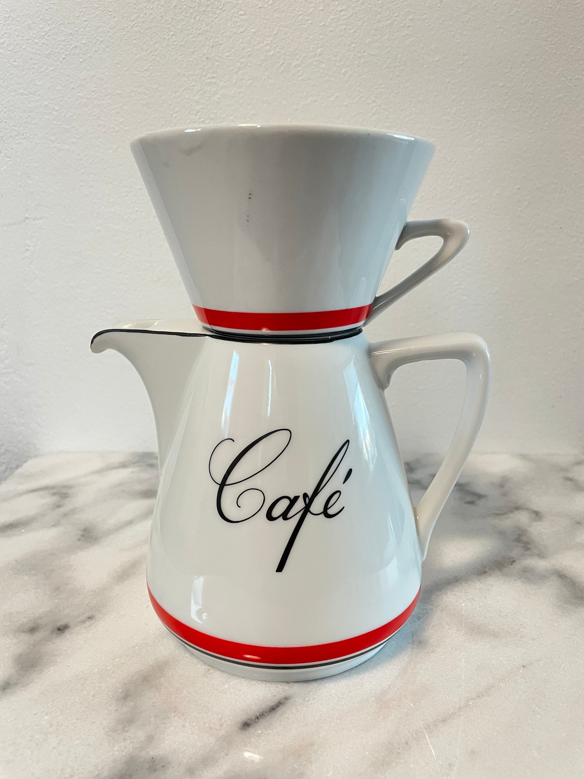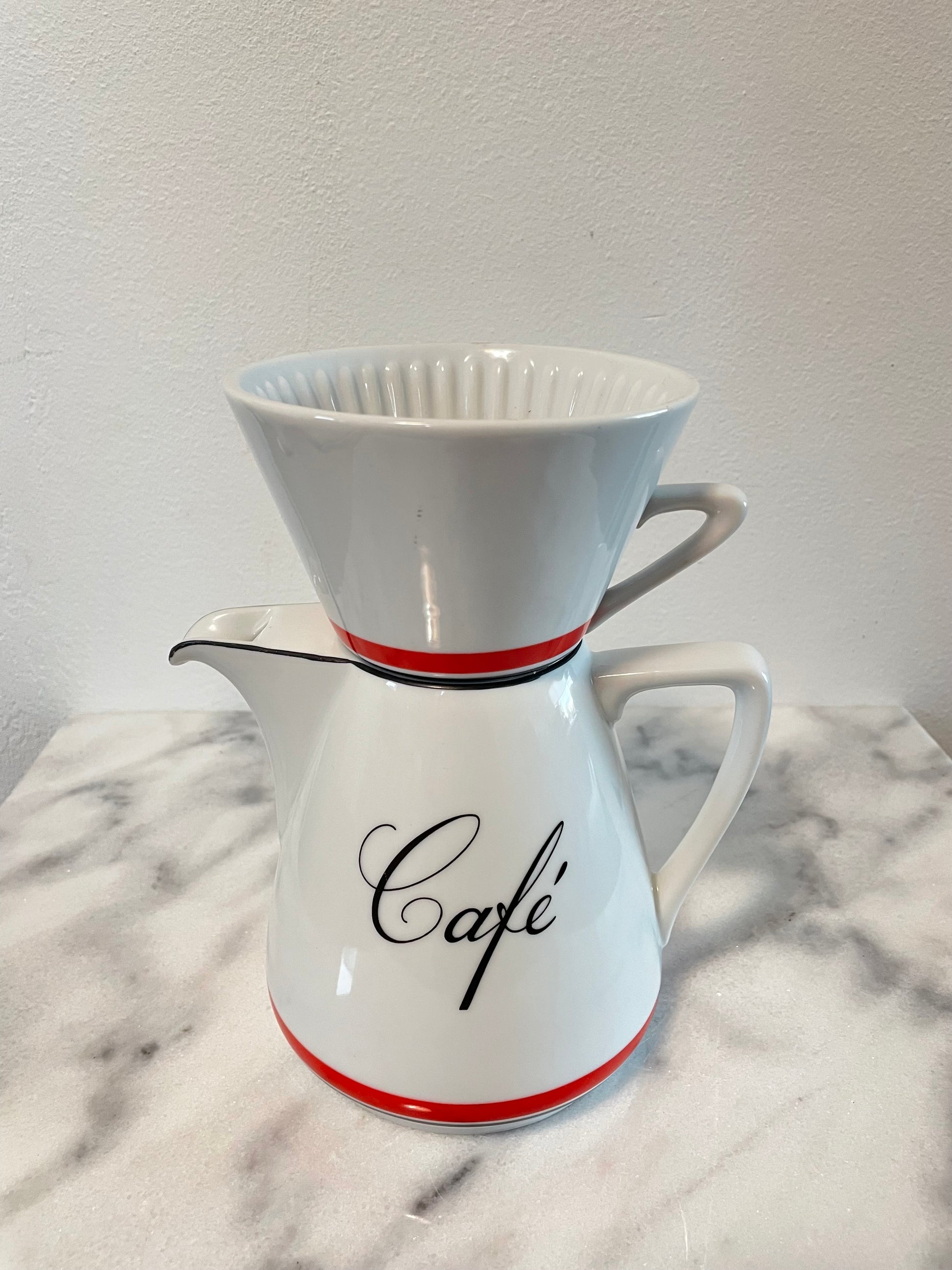 A vintage porcelain coffee carafe with pour over topper. This stylish set was made for Bon Appetit in Japan.