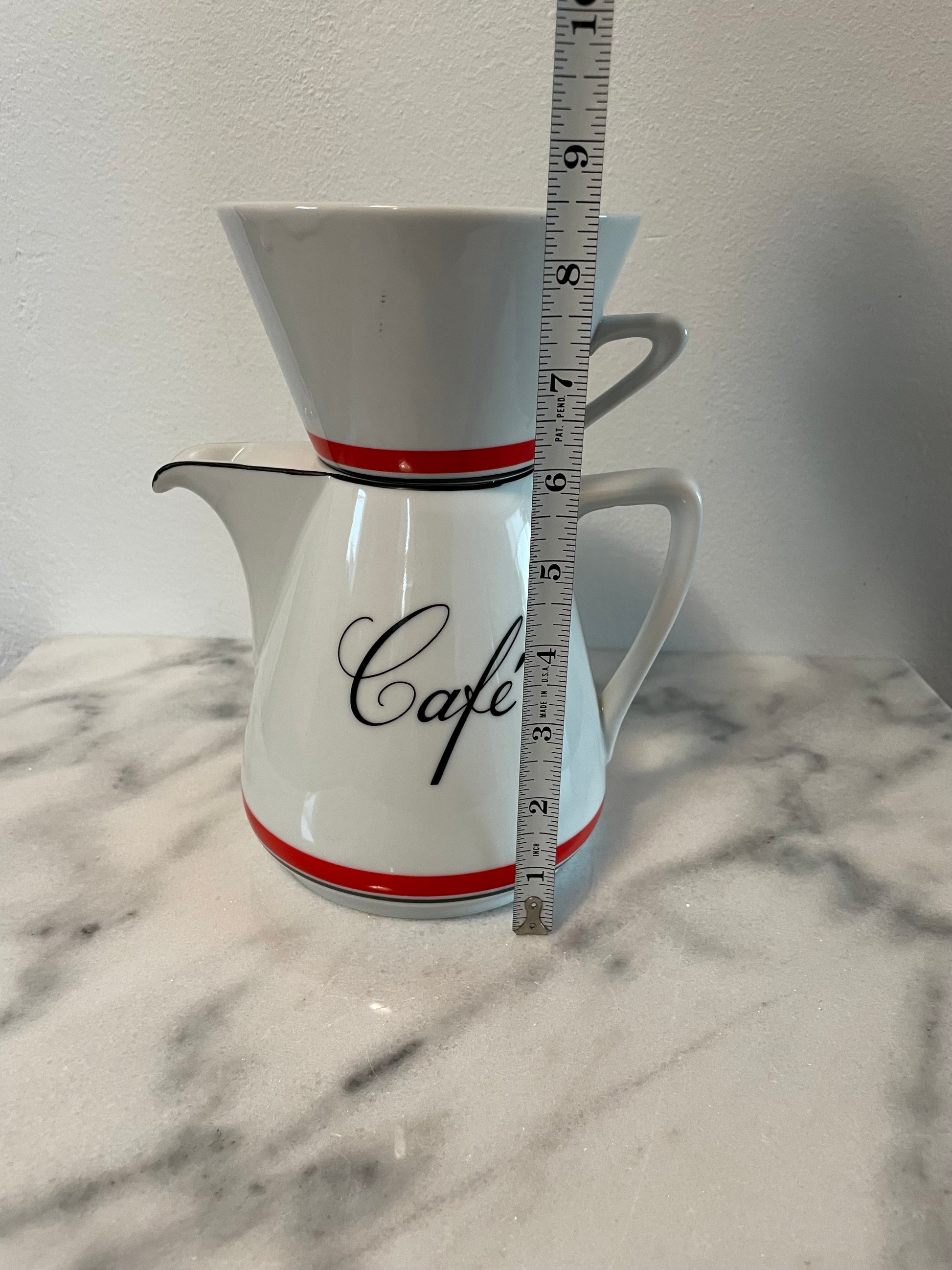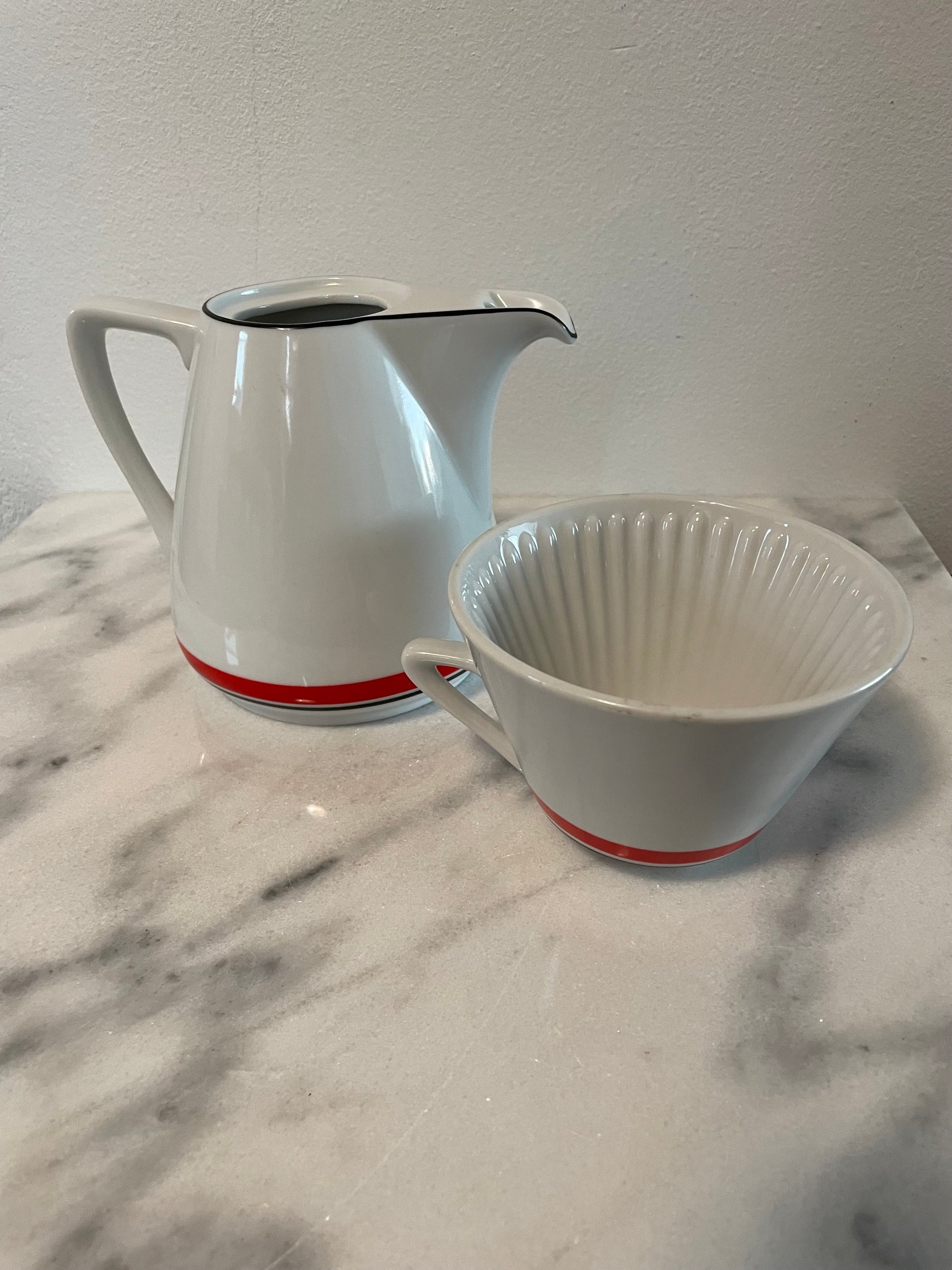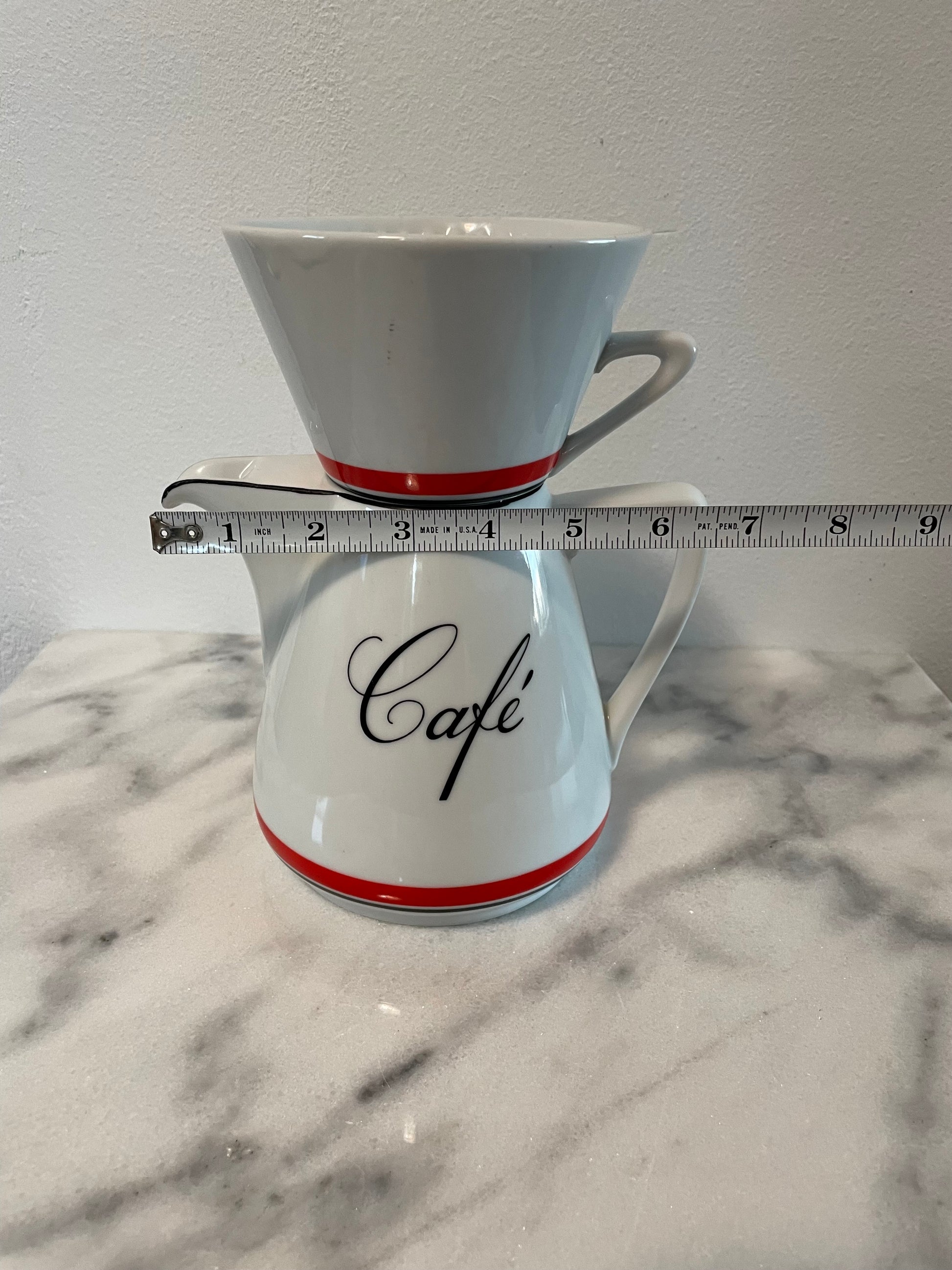 A vintage porcelain coffee carafe with pour over topper. This stylish set was made for Bon Appetit in Japan.