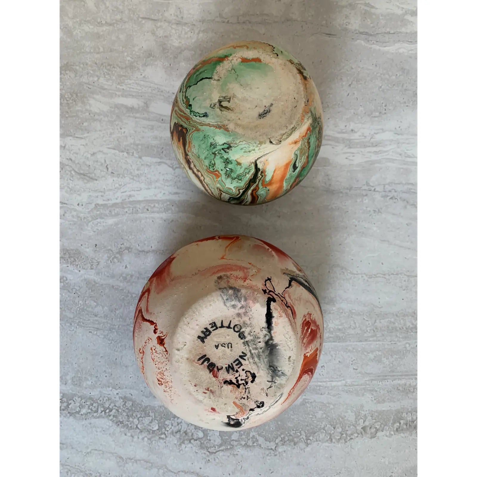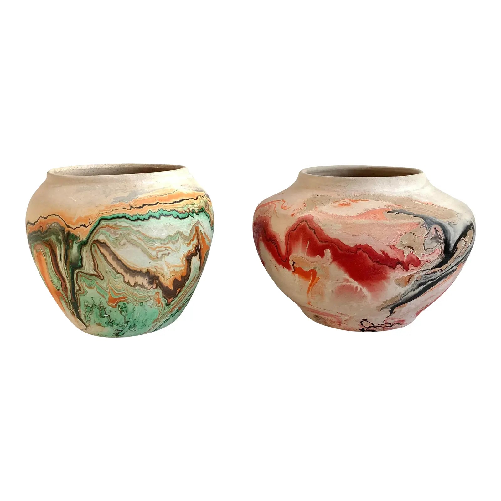 An instant collection of two vintage Nemadji Pottery roadside vases - one with green, orange and dark brown coloring, and another with vibrant red, tan, and black coloring. These pots look great together on a shelf display.