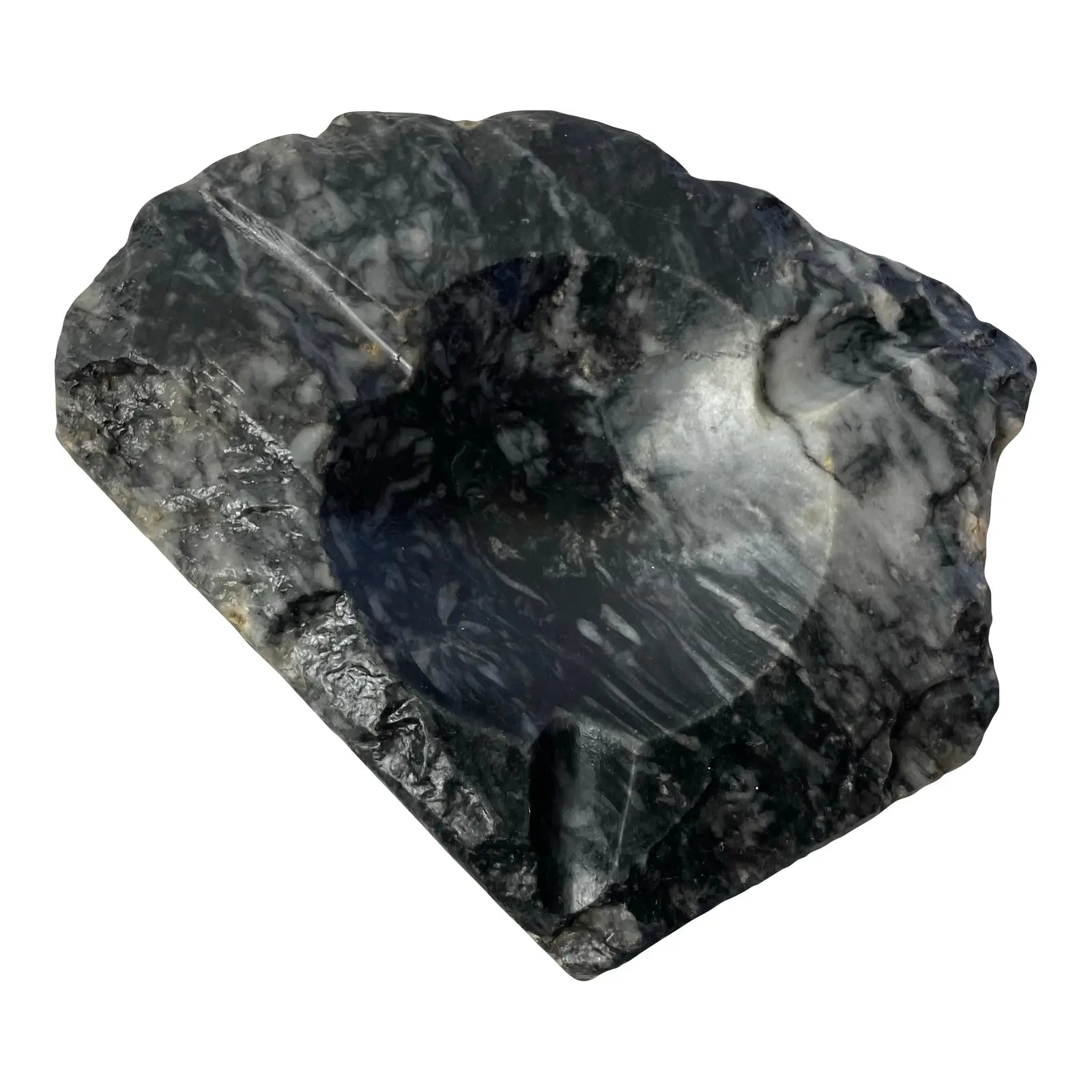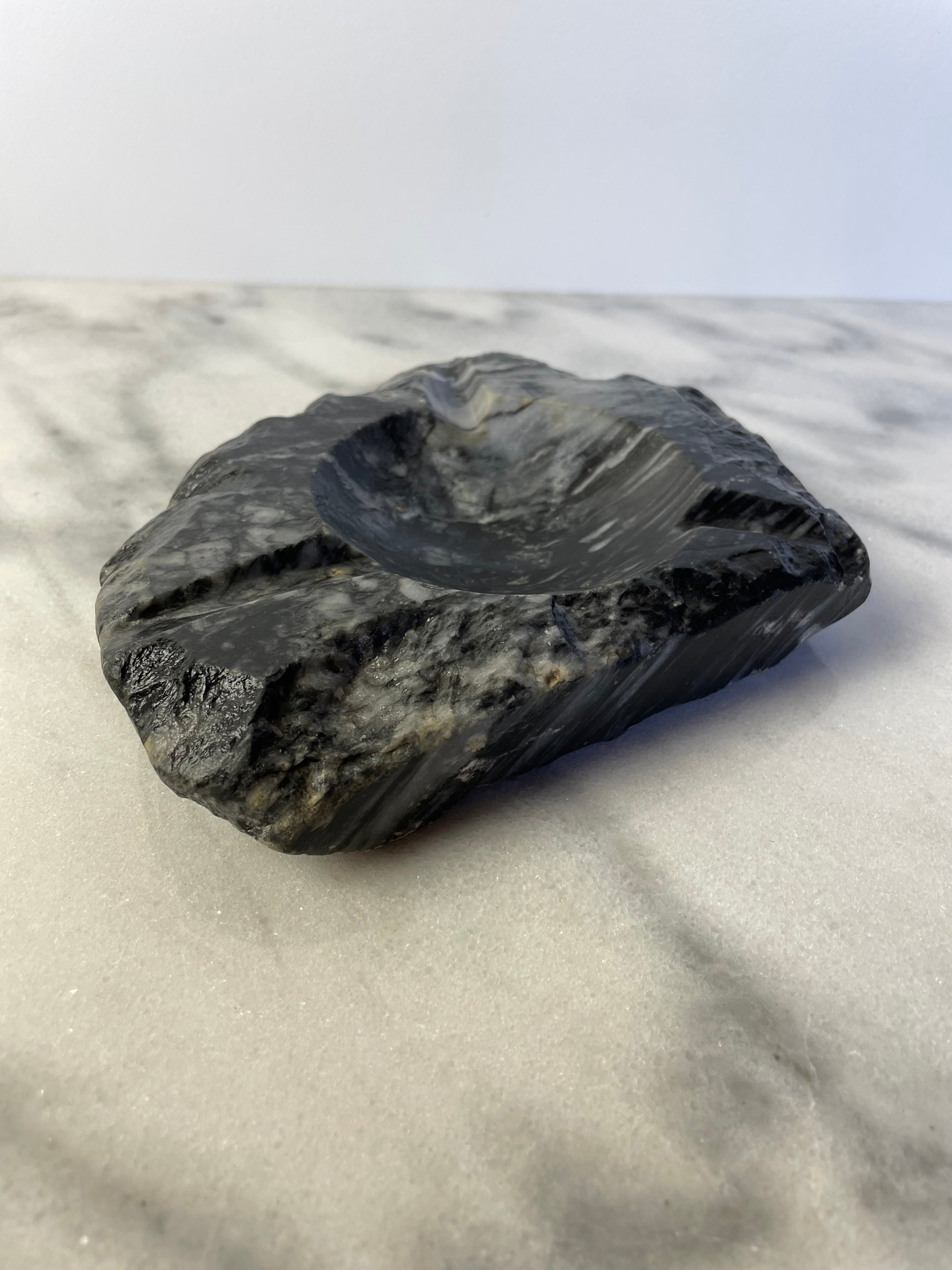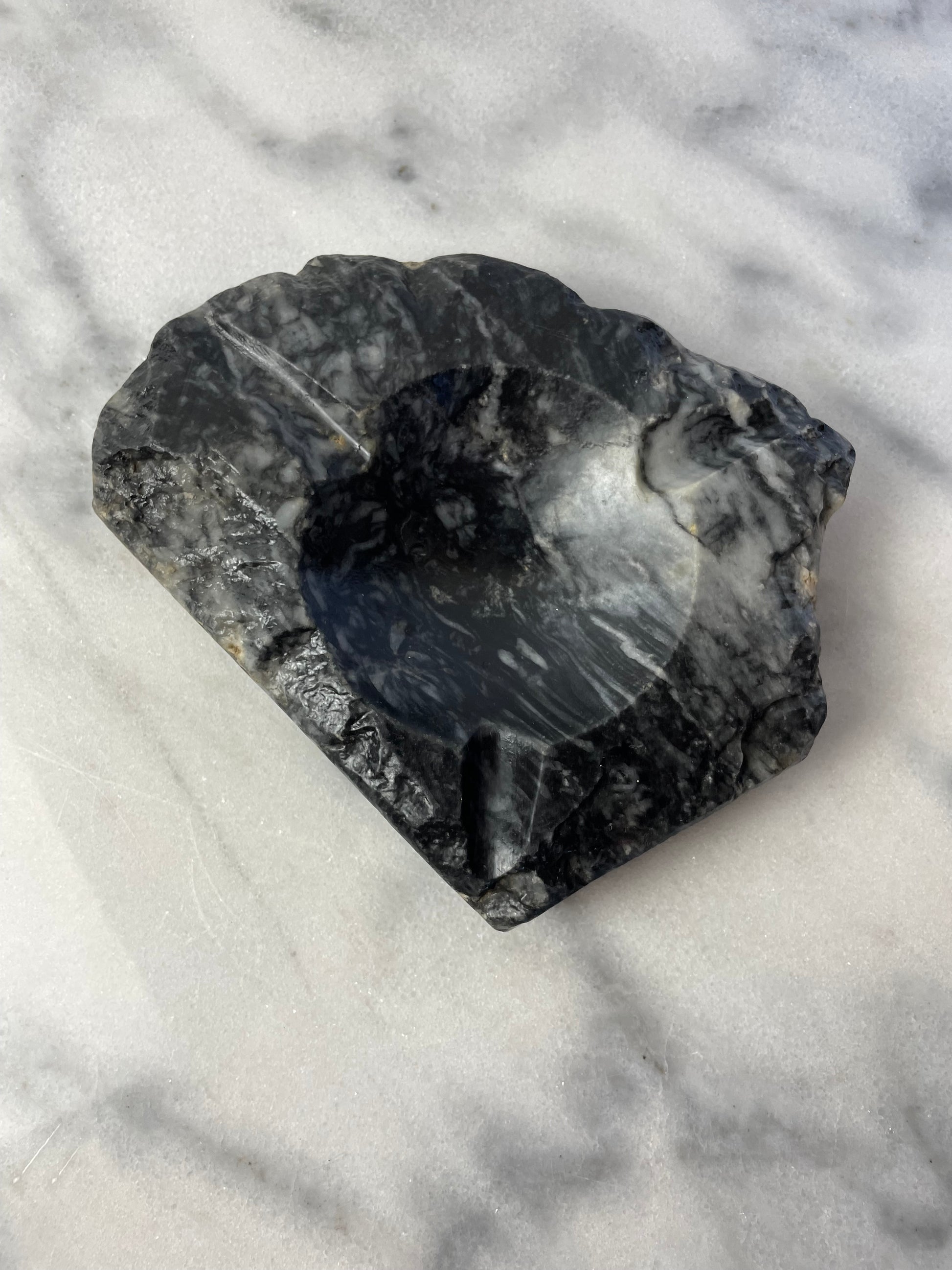 A heavy and unique vintage ashtray crafted in solid marble with a concave bowl surface and organic natural rough edges.