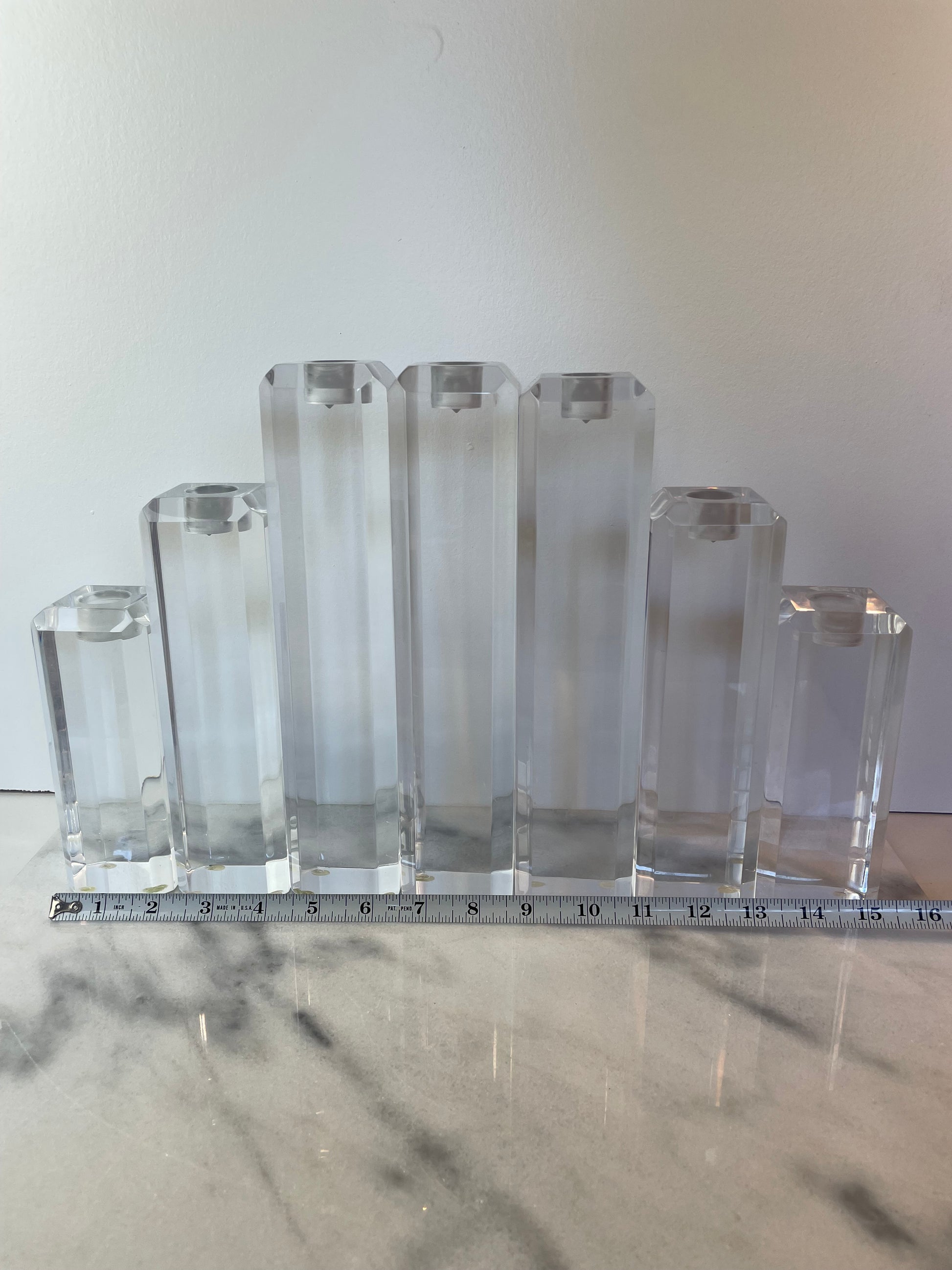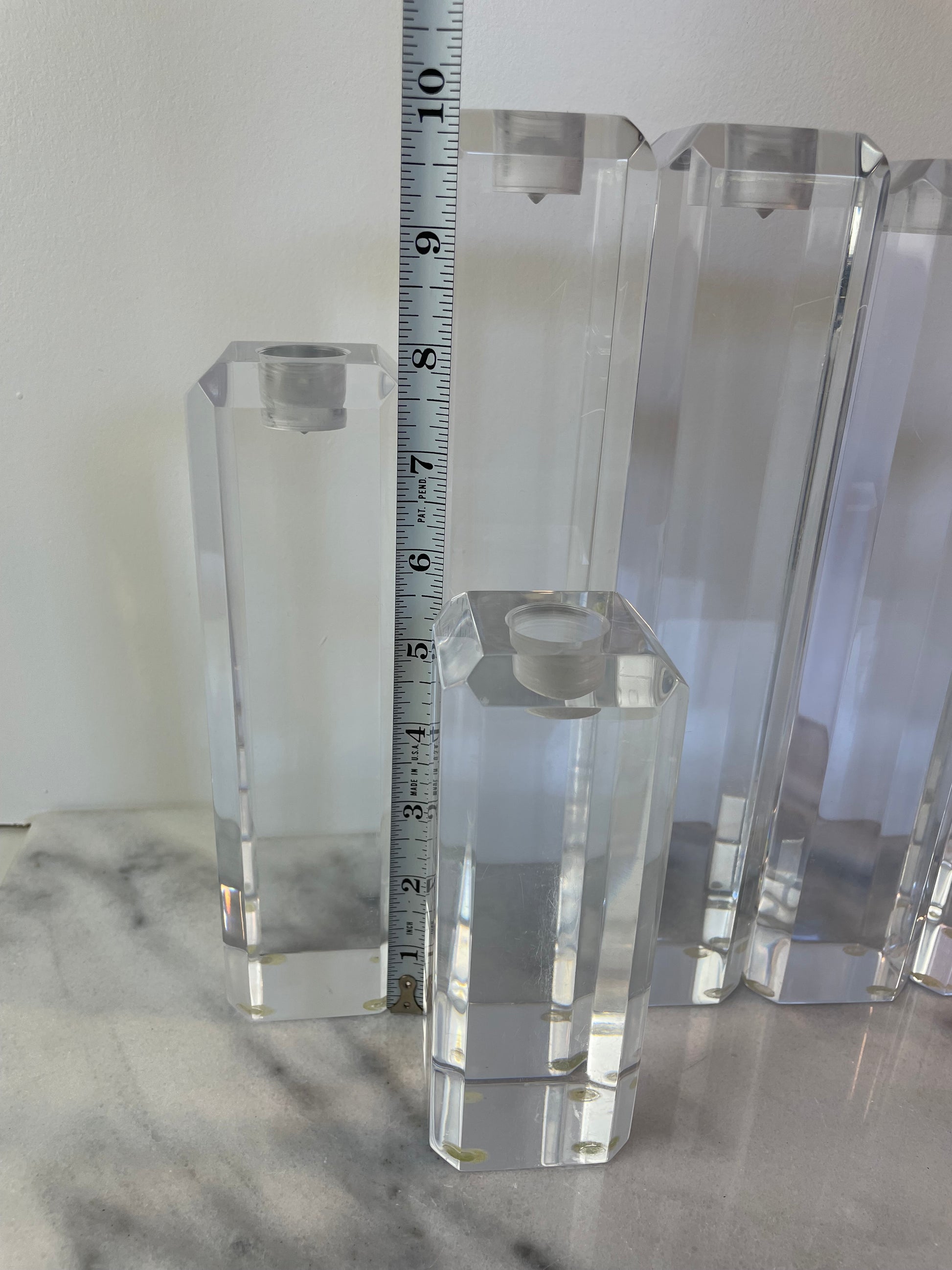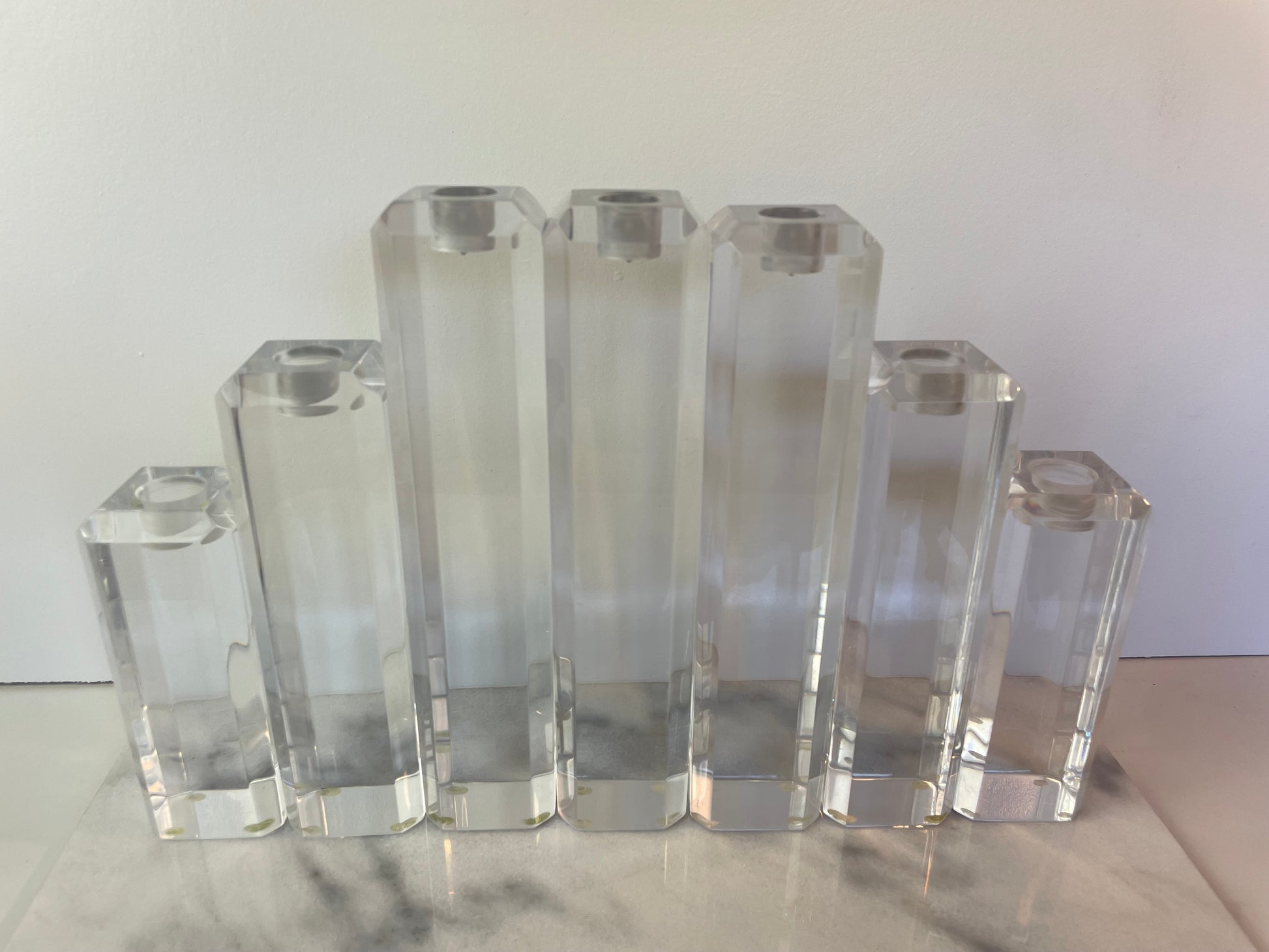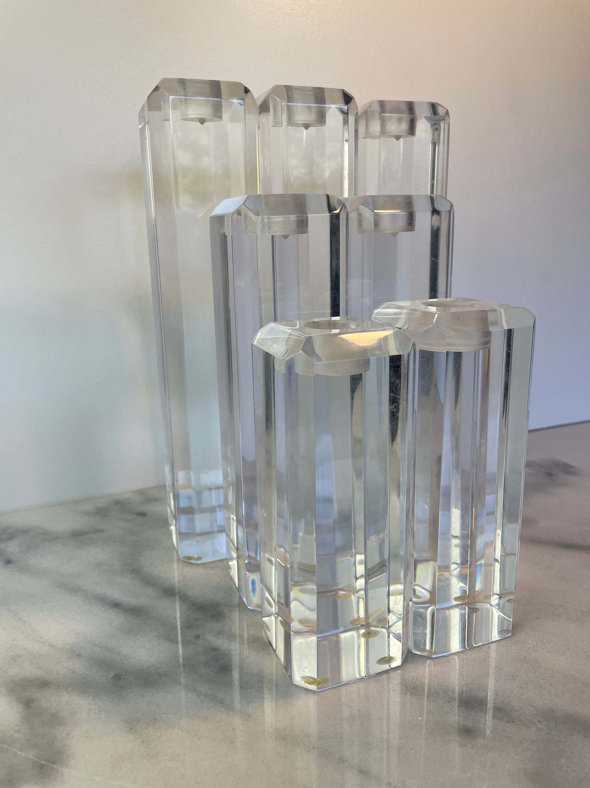 A set of 7 mid-century modern Ritts of Los Angeles faceted lucite column candlestick holders. This impressive set can be arranged in a variety of ways on a tabletop or shelf to add interesting depth with their transparent architectural forms.