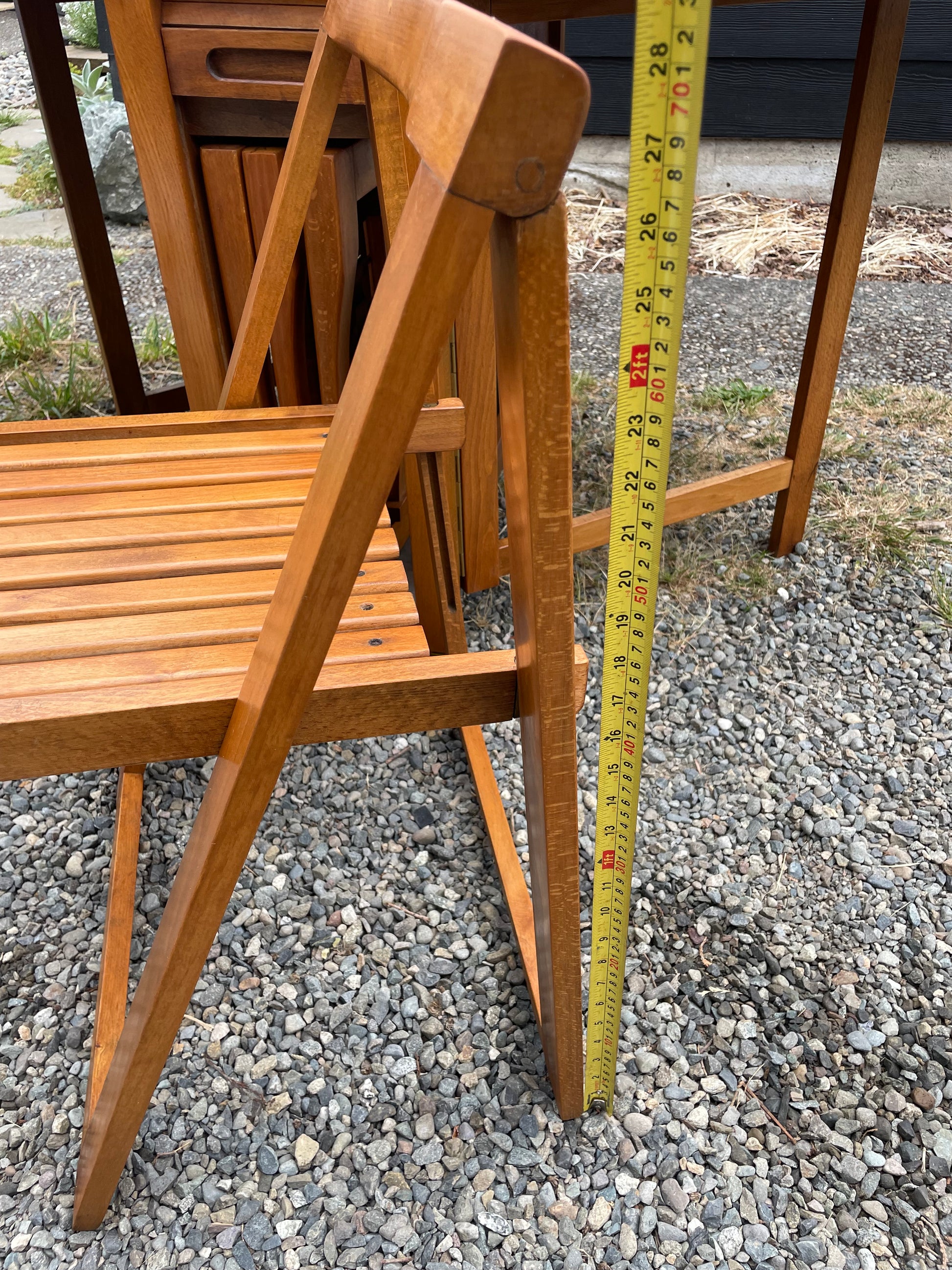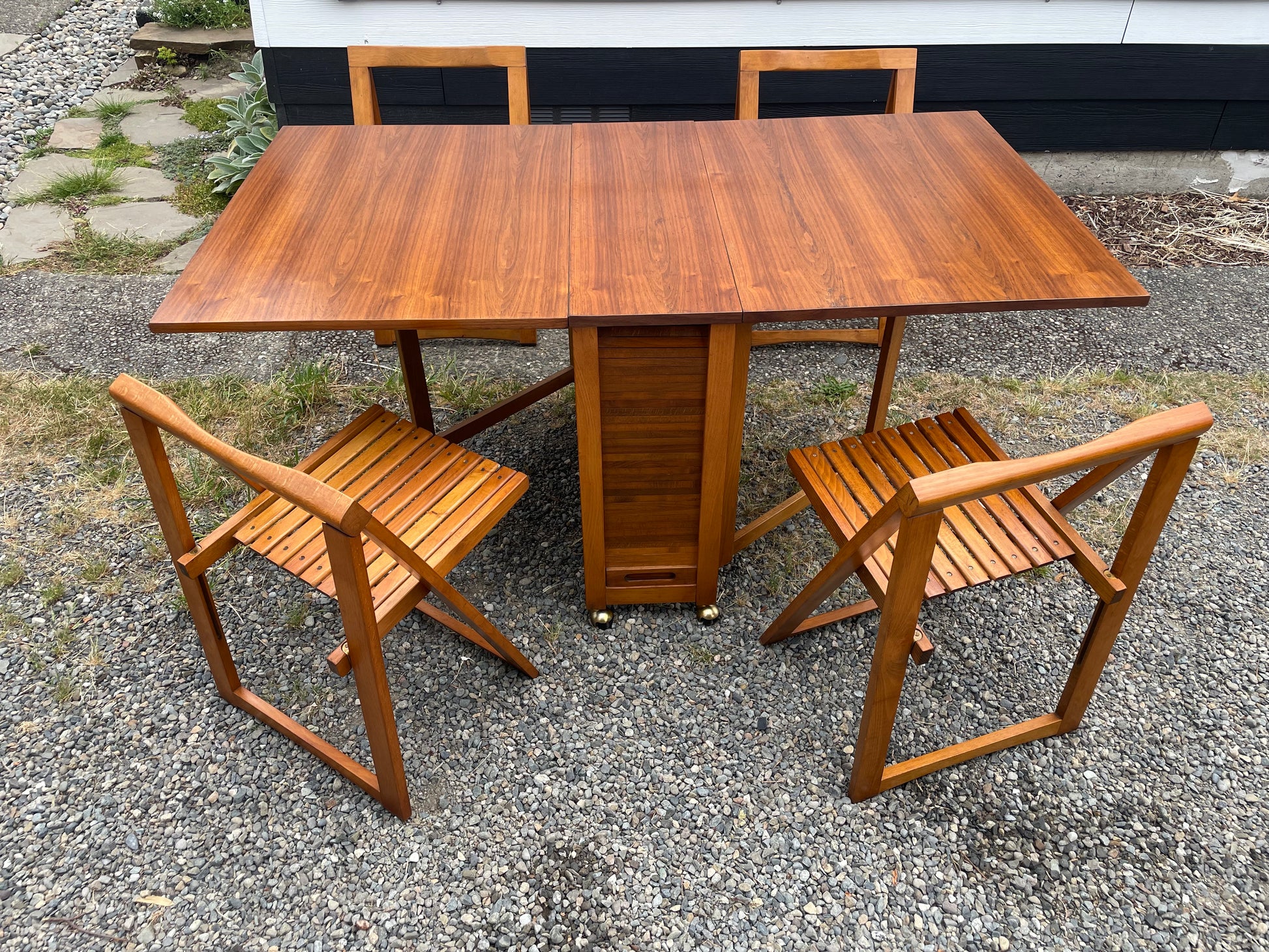 A practical and stylish dining table that contains four folding chairs. Designed in the mid 60s.