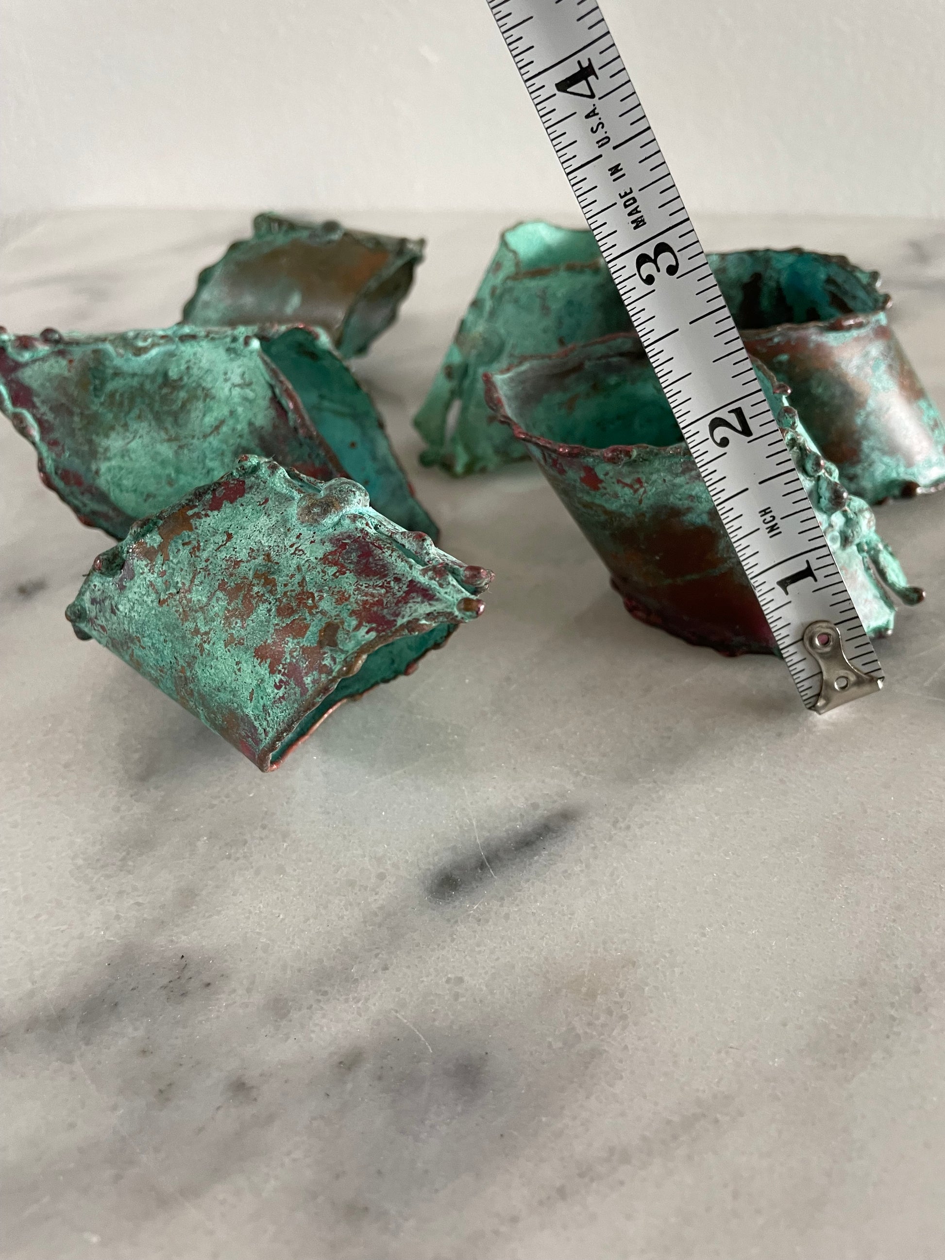 A set of six copper napkin rings with verdigris patina and rustic handmade character.