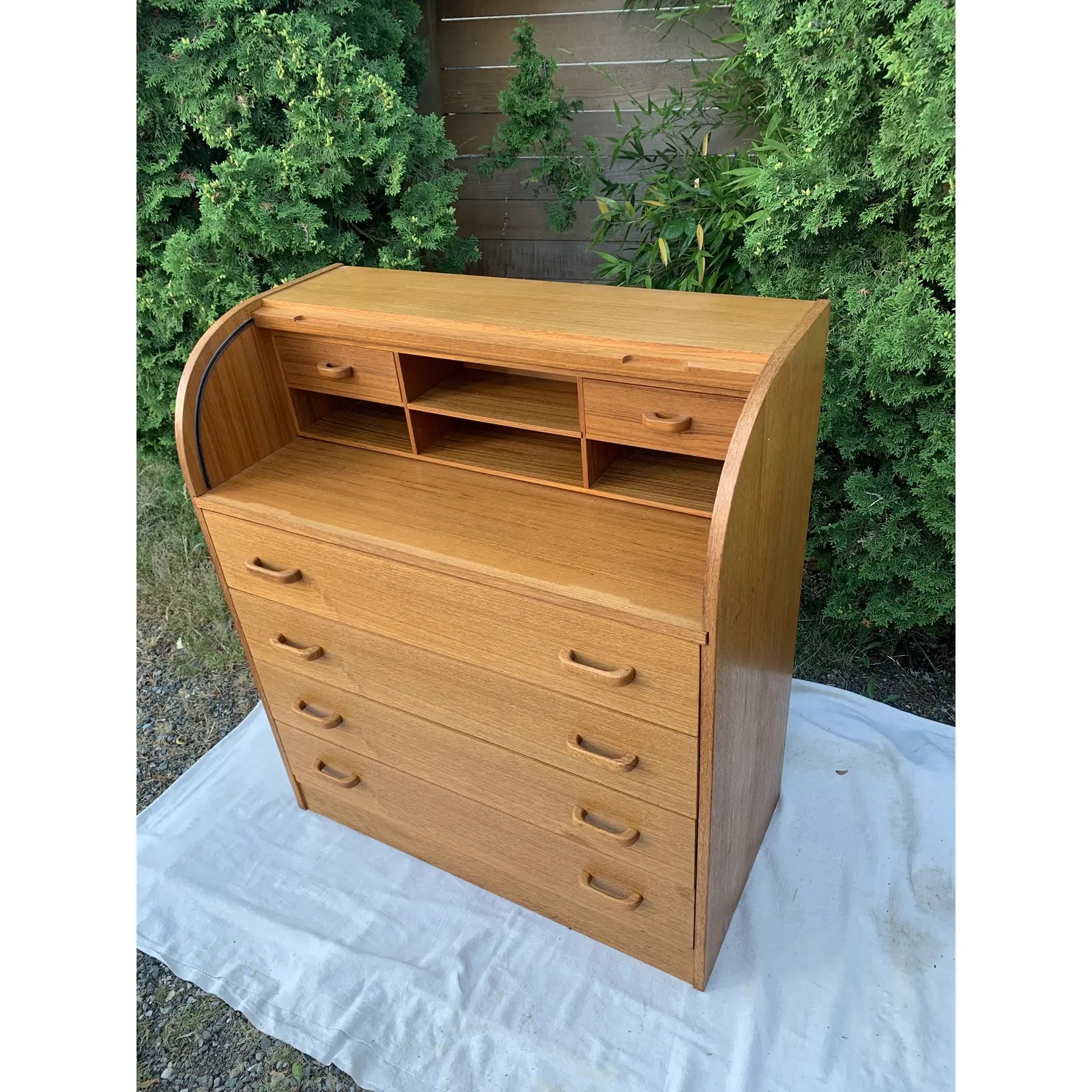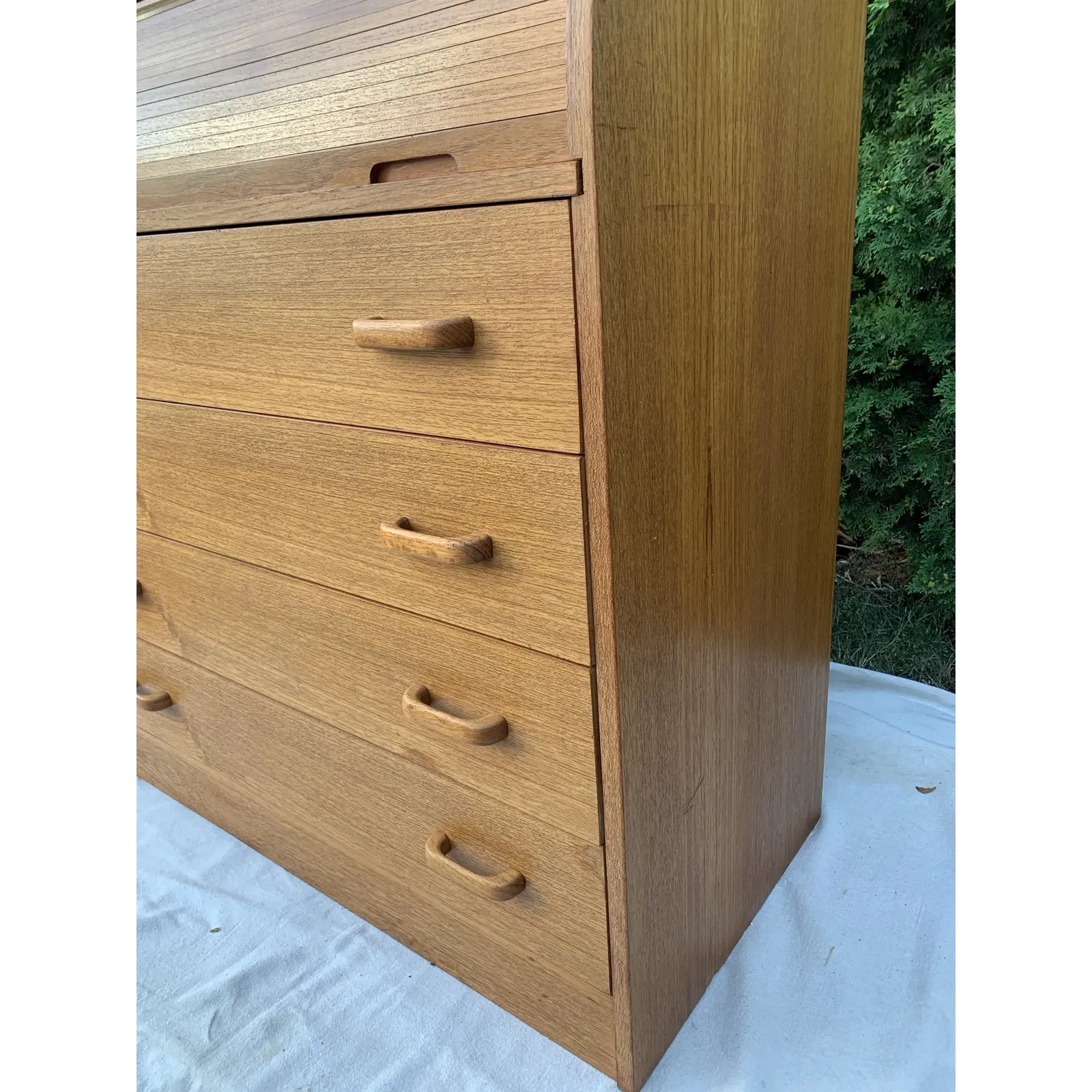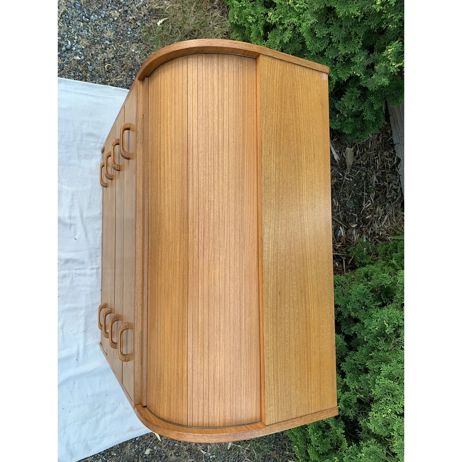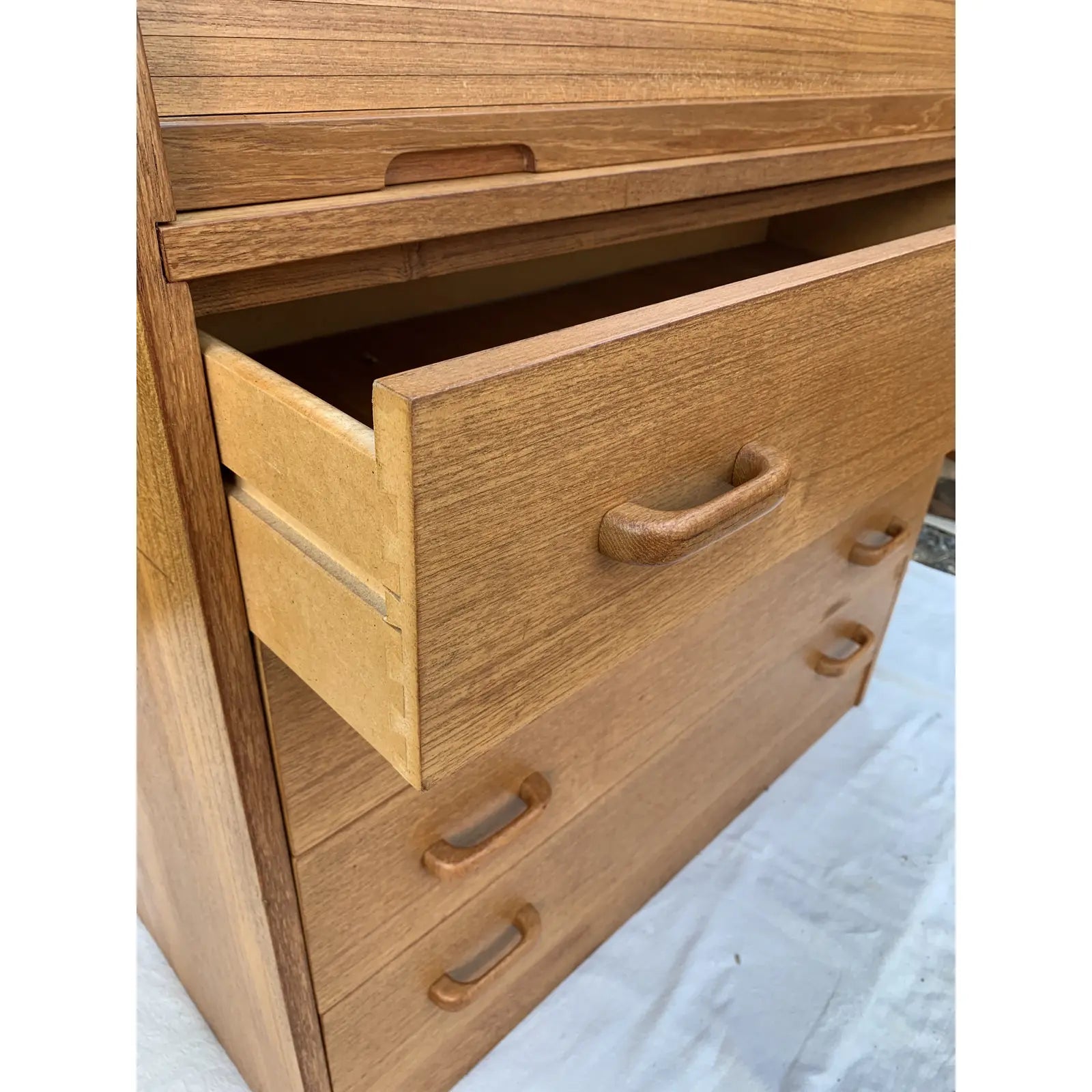 Scandinavian mid-century modern teak secretary desk dresser unit with a tambour roll top style closure housing two small drawers, shelves, and a pull out desk surface. The unit features four drawers with dovetail joinery.