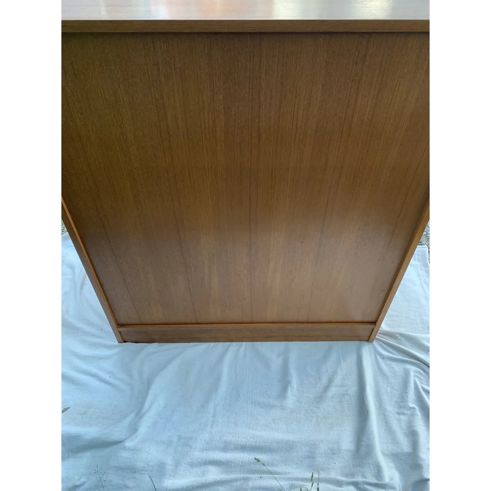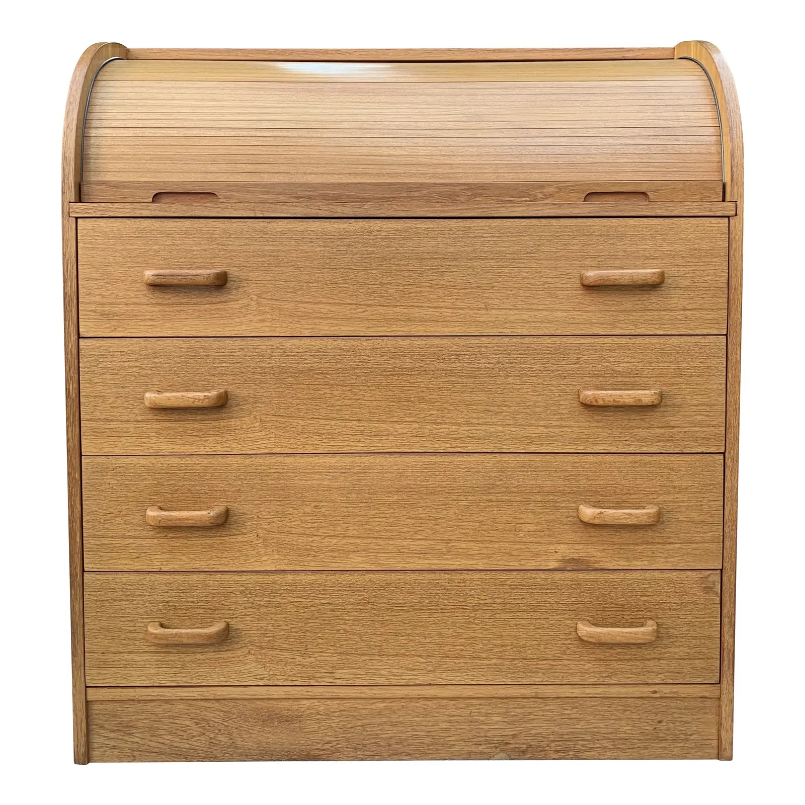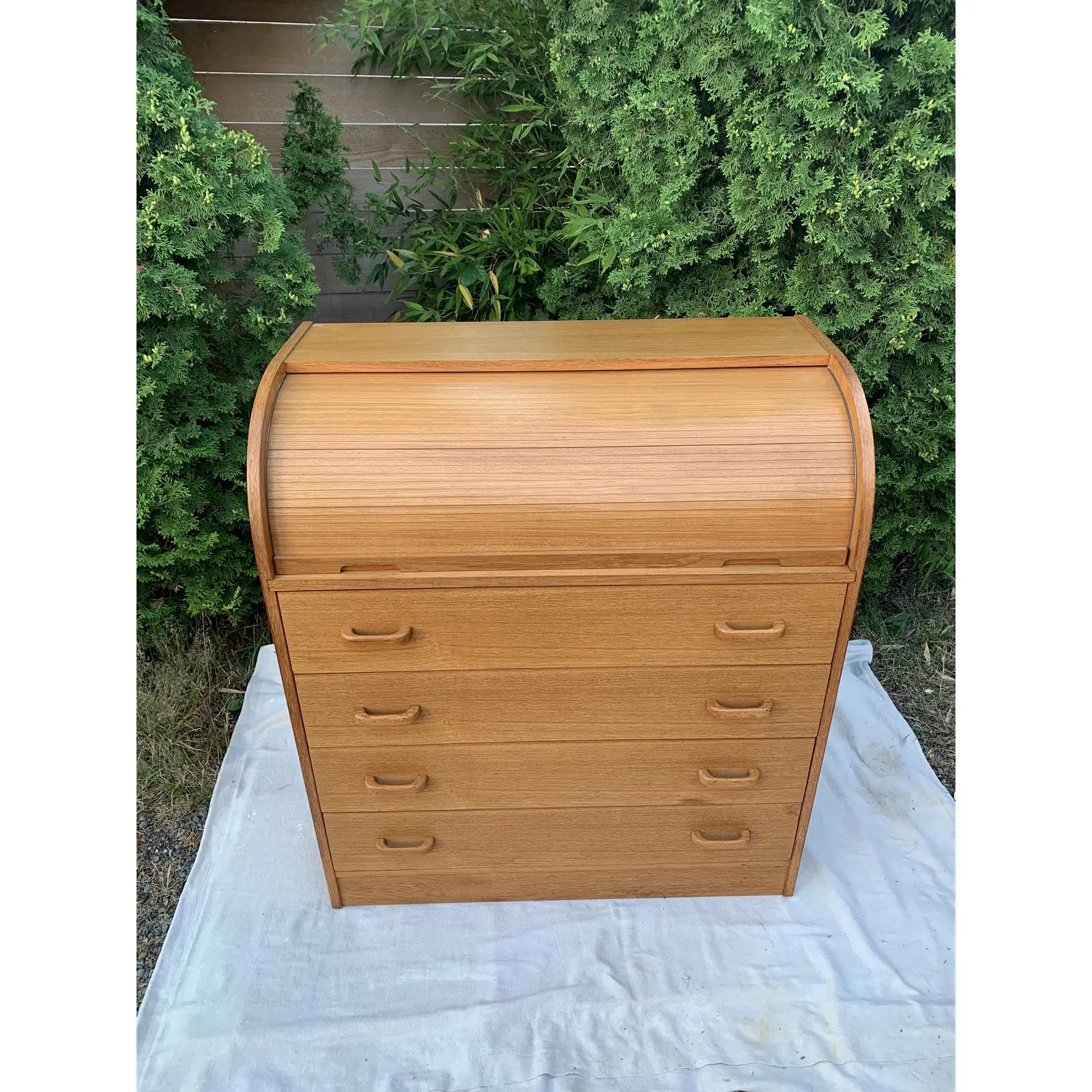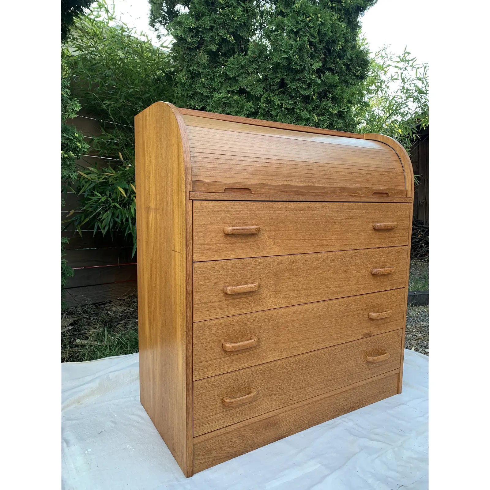 Scandinavian mid-century modern teak secretary desk dresser unit with a tambour roll top style closure housing two small drawers, shelves, and a pull out desk surface. The unit features four drawers with dovetail joinery.
