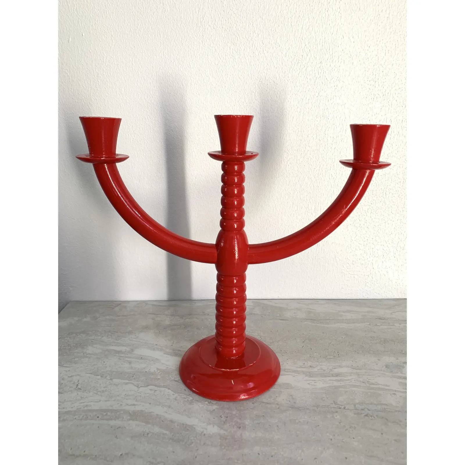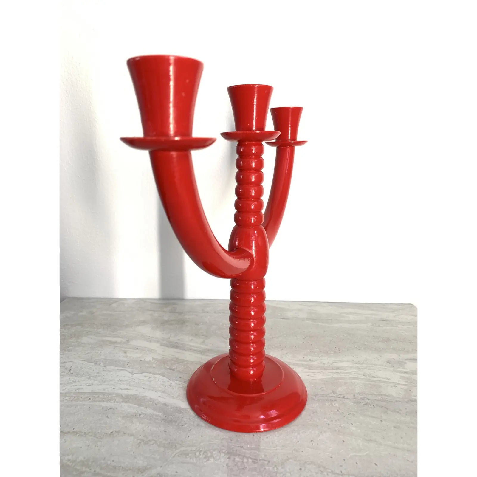 Mid 20th Century Scandinavian Red Lacquered Wood Candelabra Made in Finland