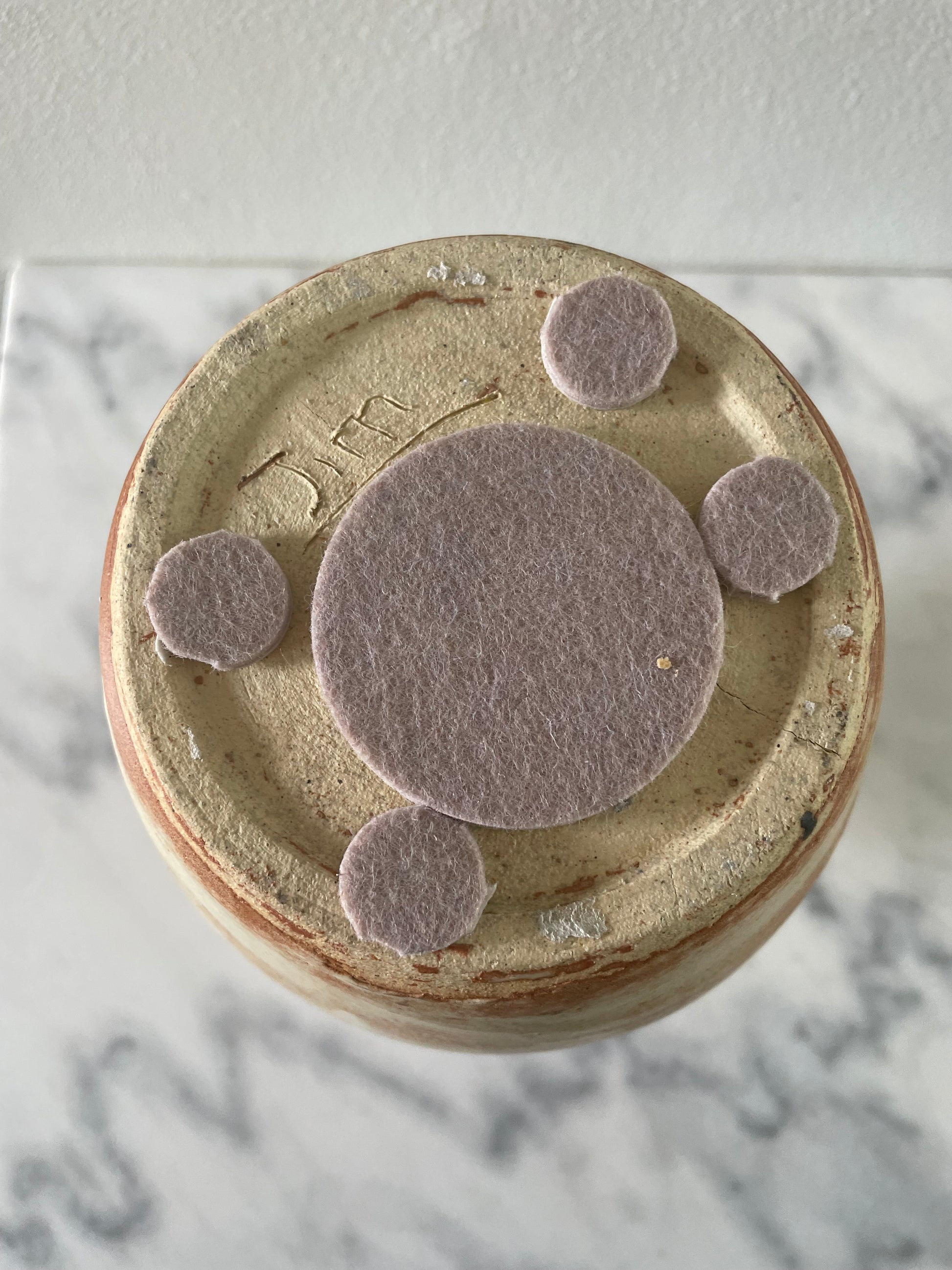 Signed studio pottery in cream and terra cotta colors with figures in black etched into the sides. Heavy 12”h x6.5”w