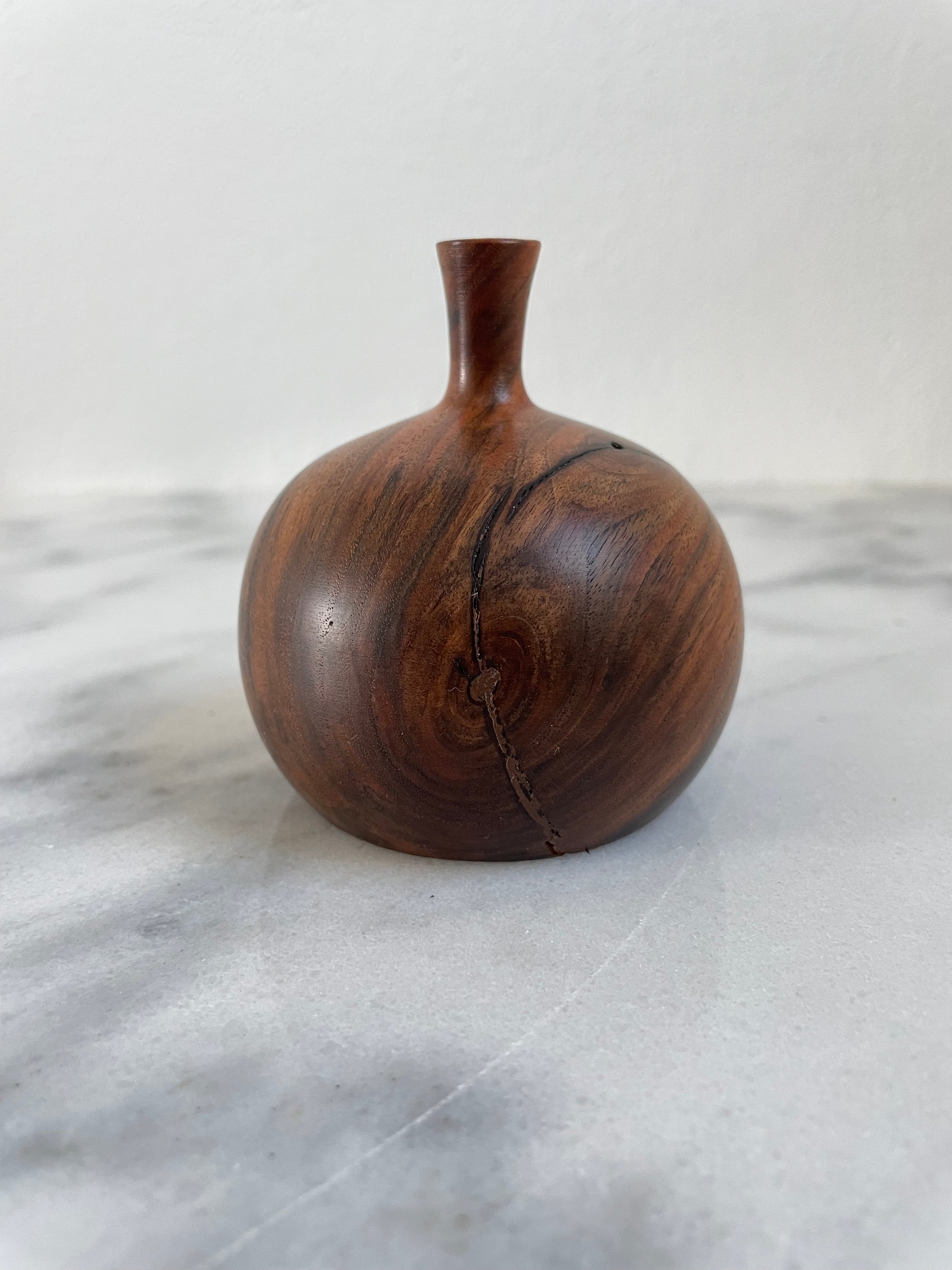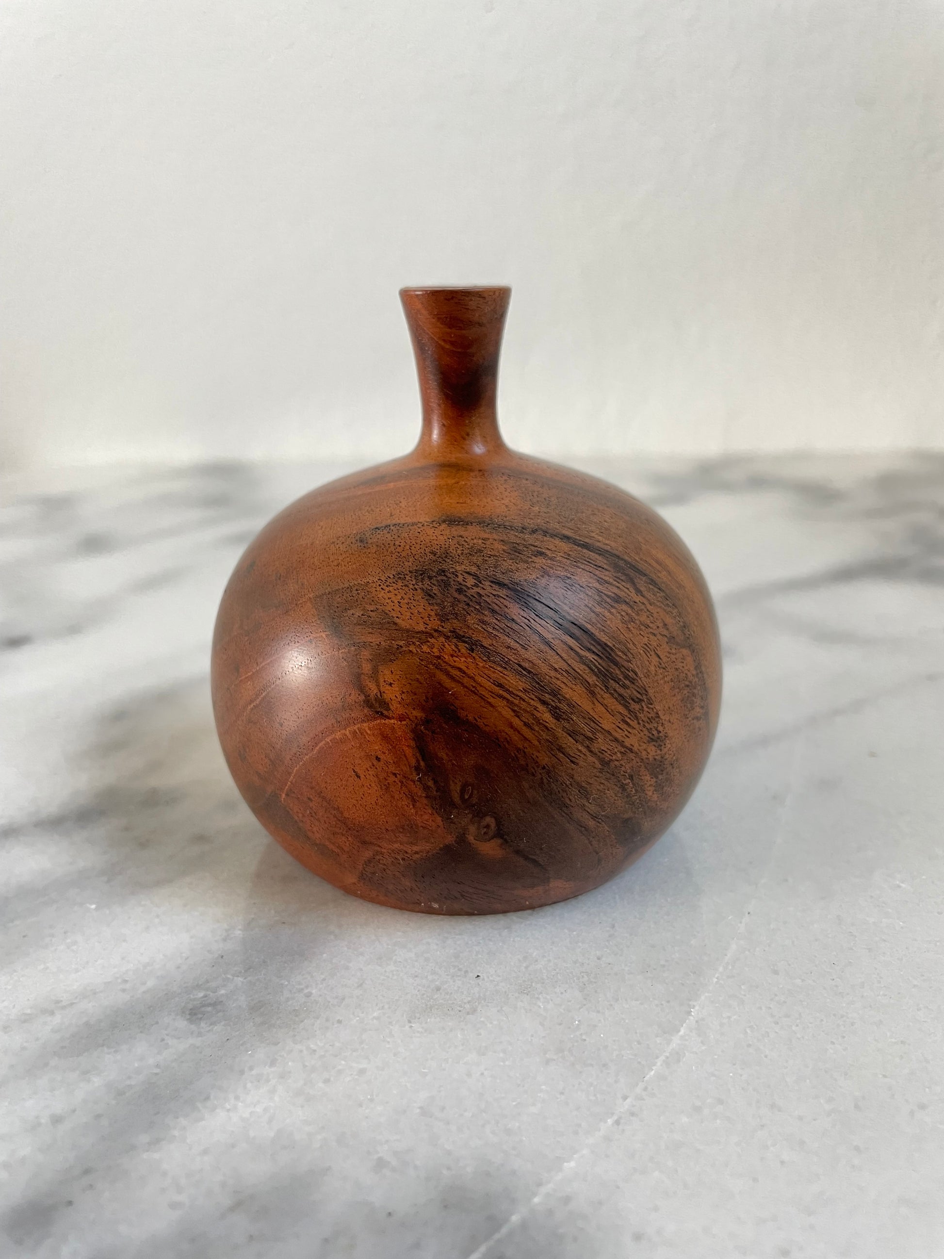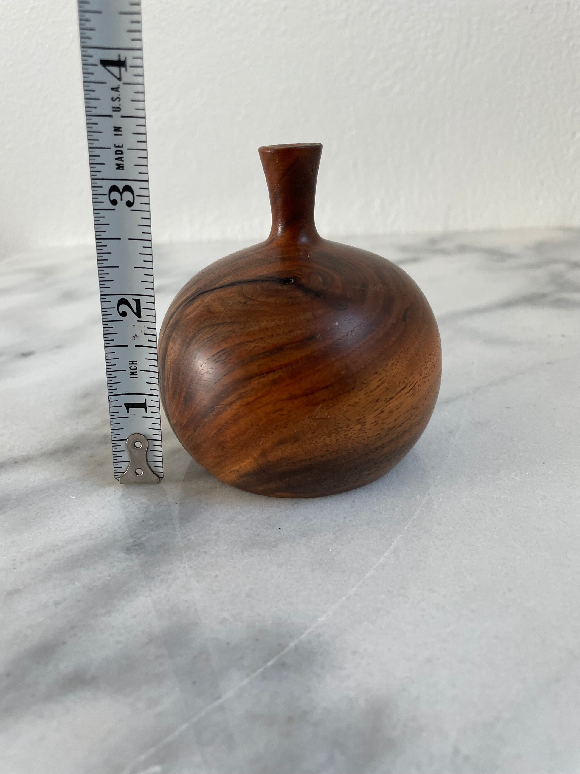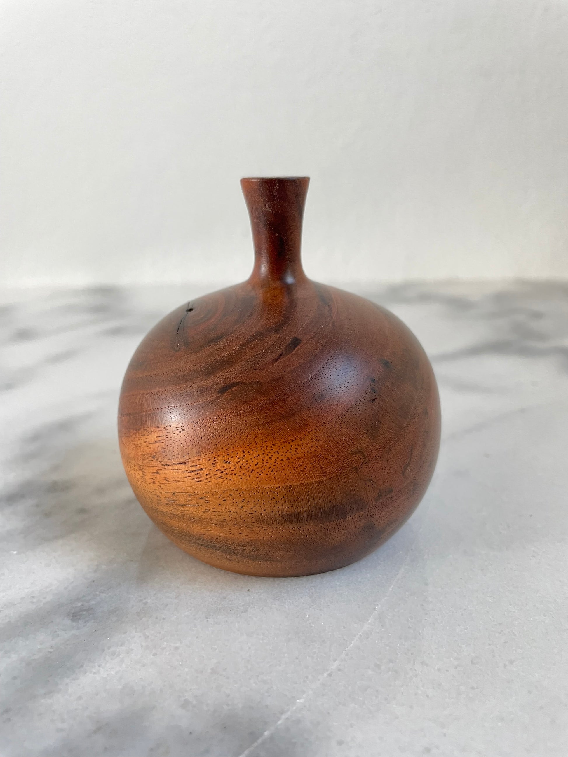 A small but striking Oregon black walnut weed pot with rich grain and a soft polished finish. The piece is marked and signed on the bottom.