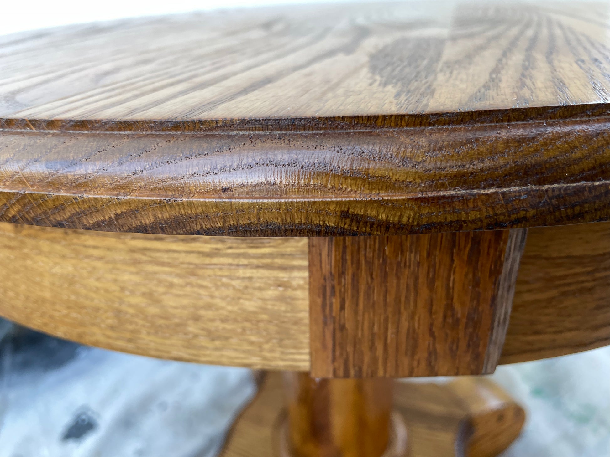 A pair of solid oak antique style pedestal side tables with thick solid oak construction. The tables feature scrolled feet design with a columnar pedestal and a round top with square moldings on the sides. These are sophisticated tables with their classic styling.