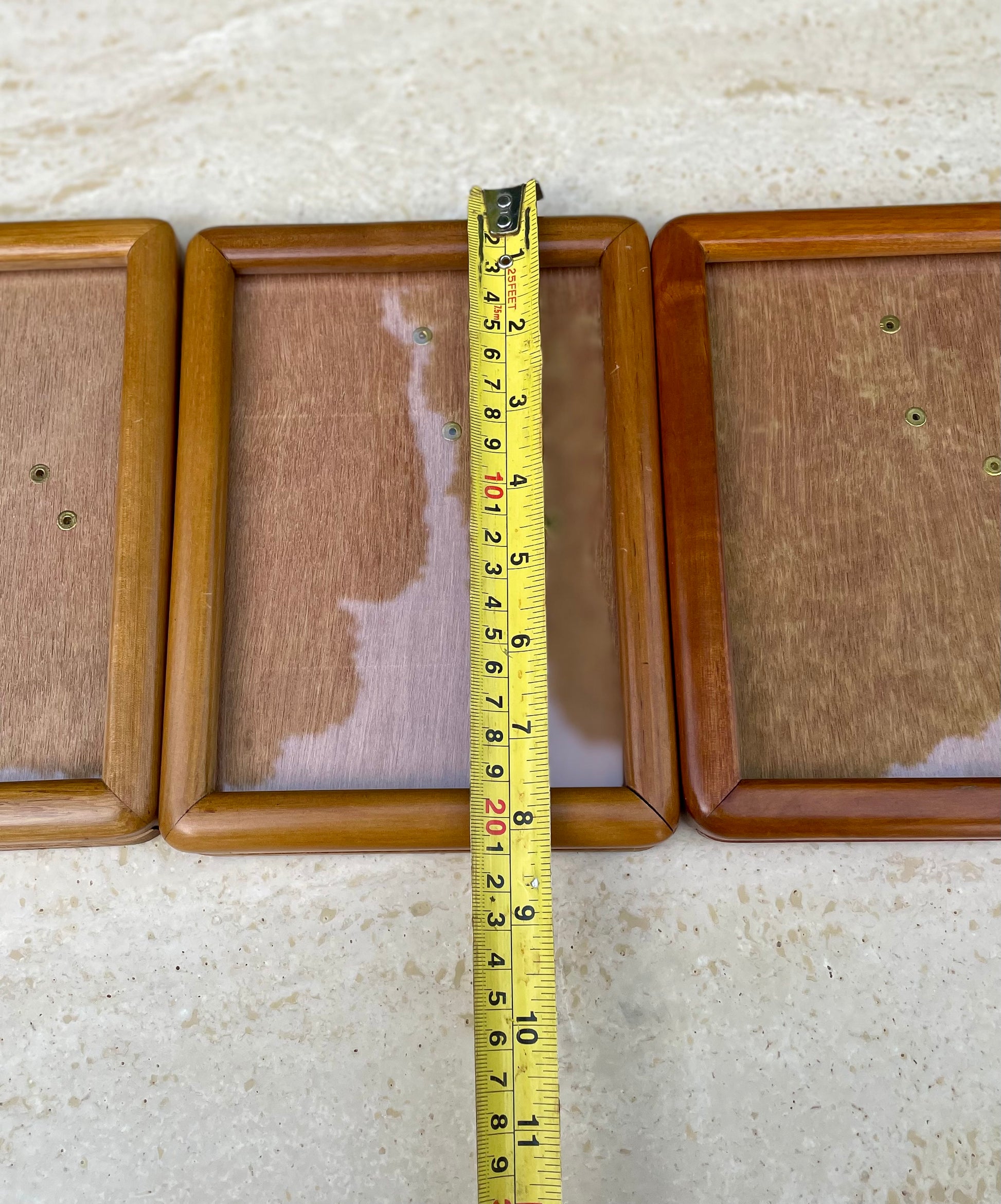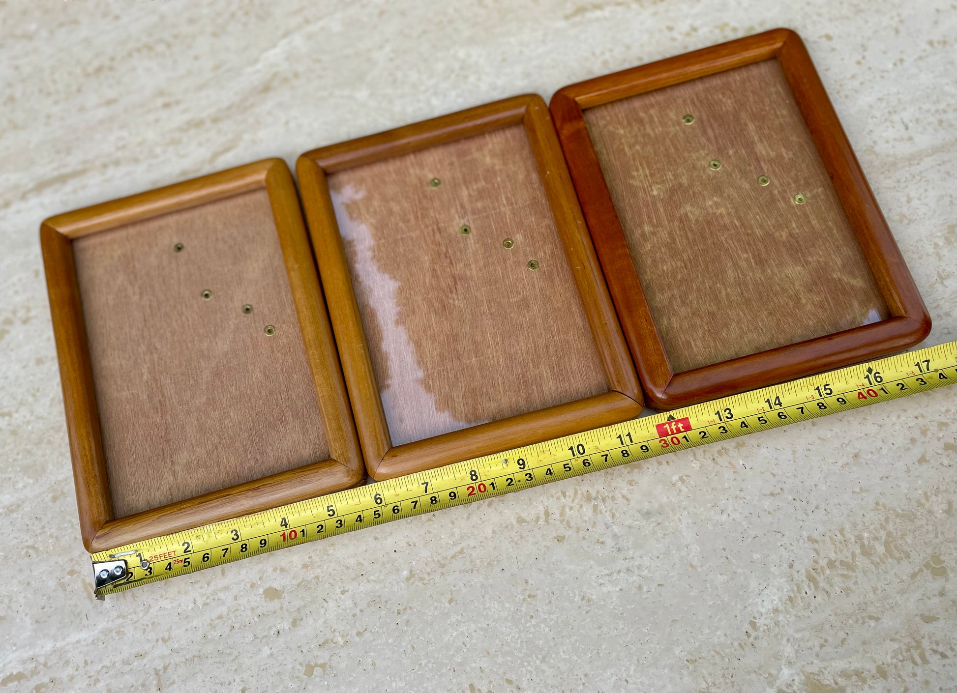 A set of three Danish Modern style teak wood frames with tabletop display or wall hanging option.