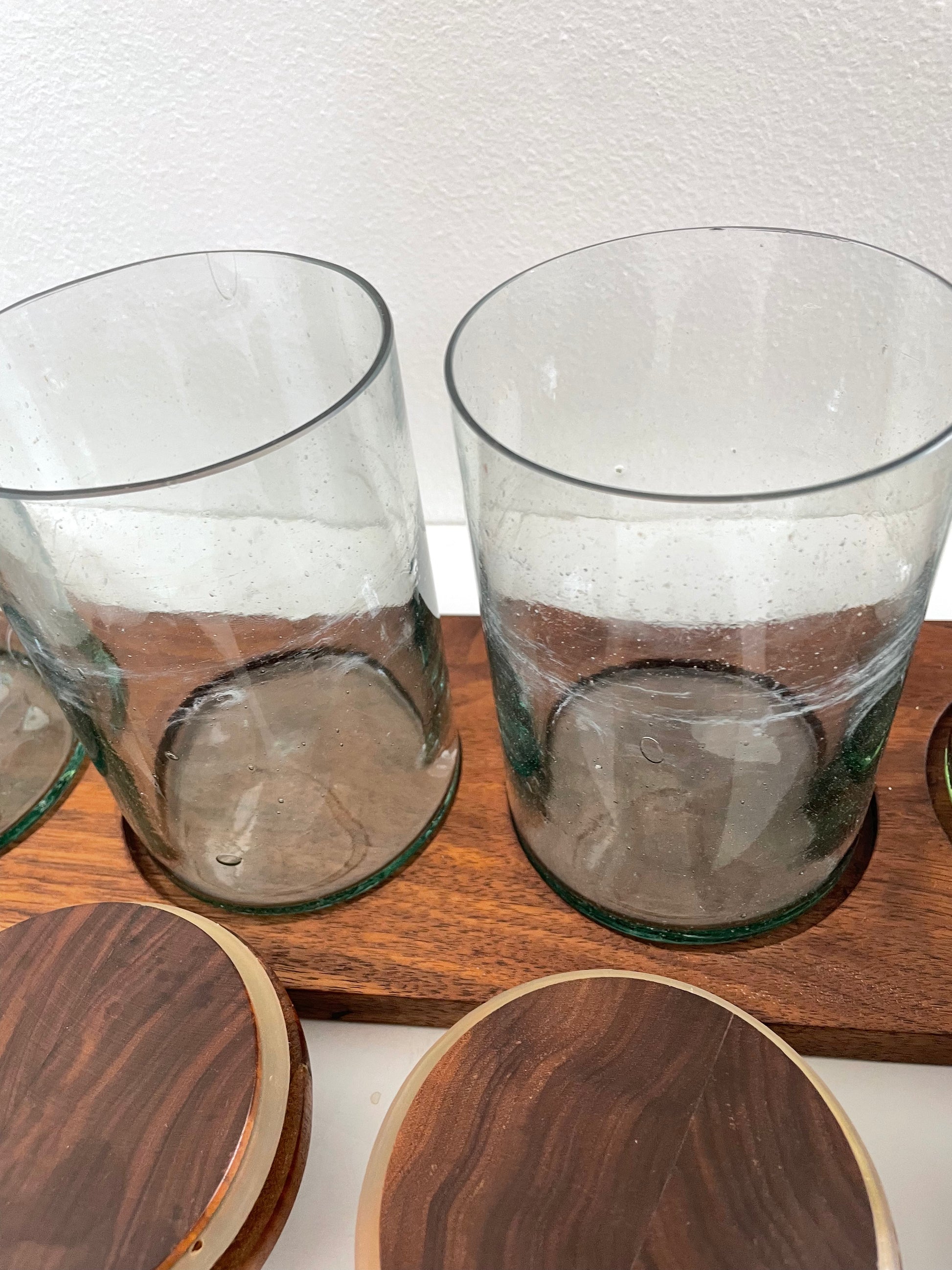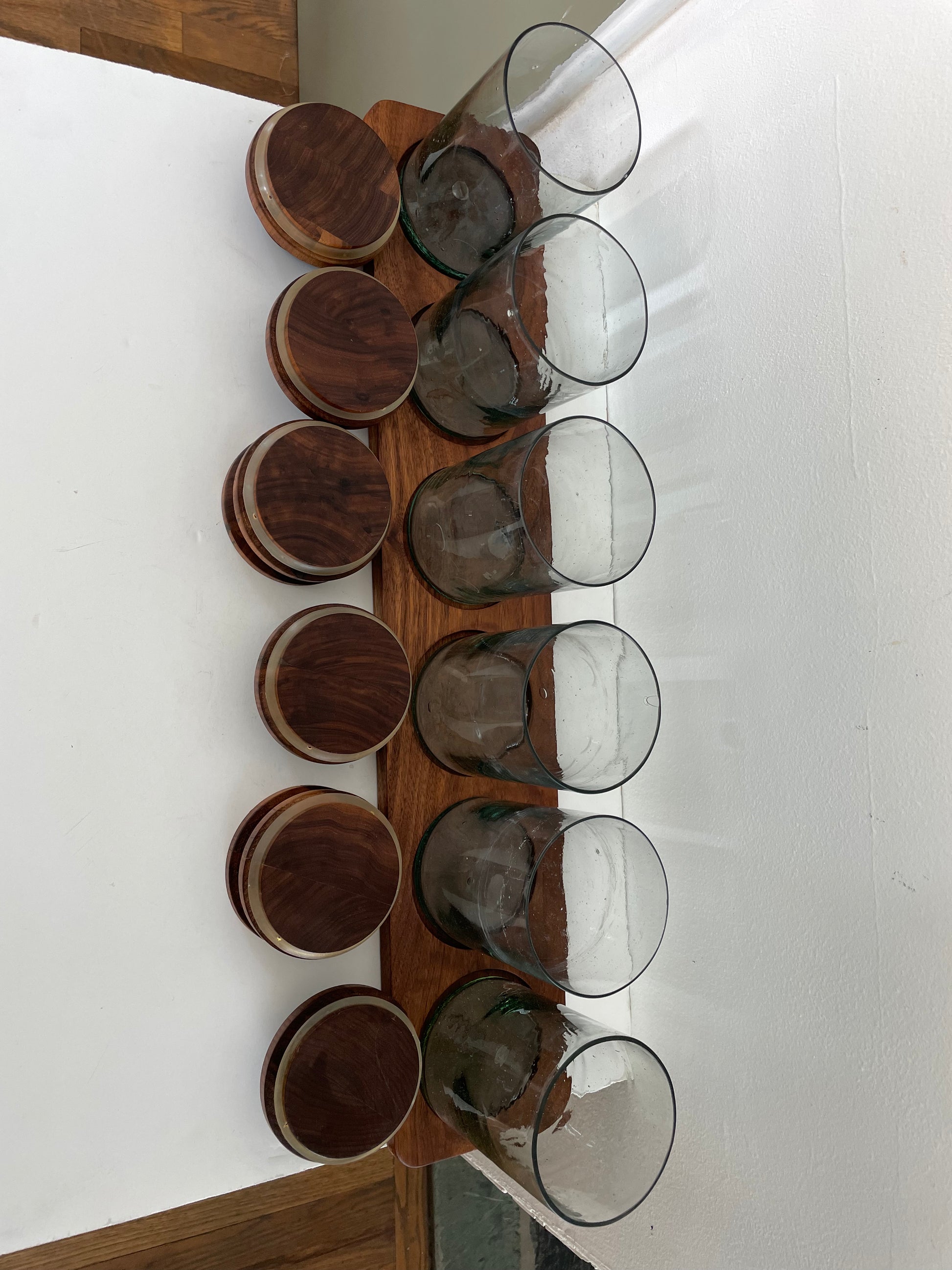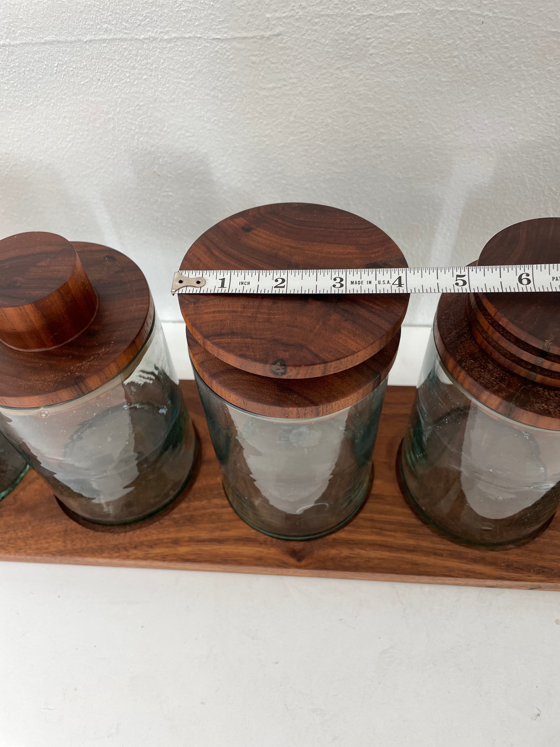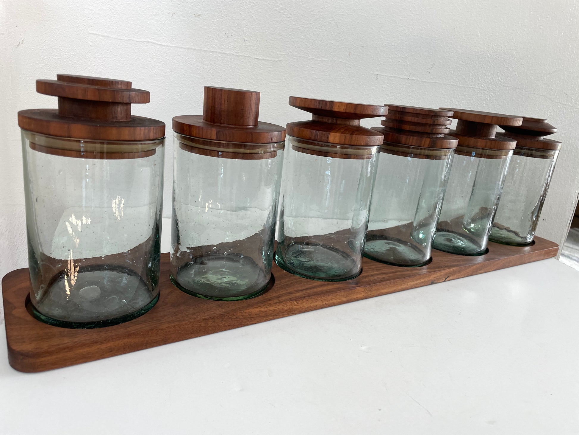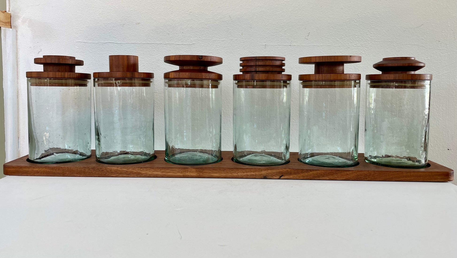 A sculptural set of 6 glass jars with solid walnut lids and a solid walnut stand. Each jar has a unique formed solid walnut lid and the glass has a wonderful bubbled handmade quality. The jars fit into carved cutouts in the solid walnut stand. The jars are not intended for food use.