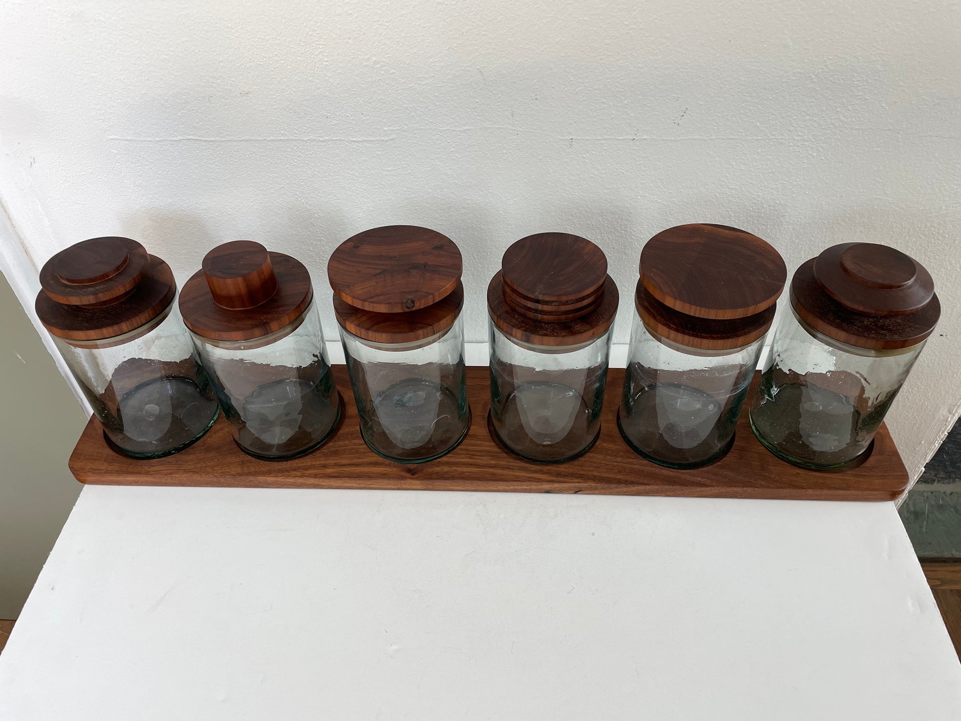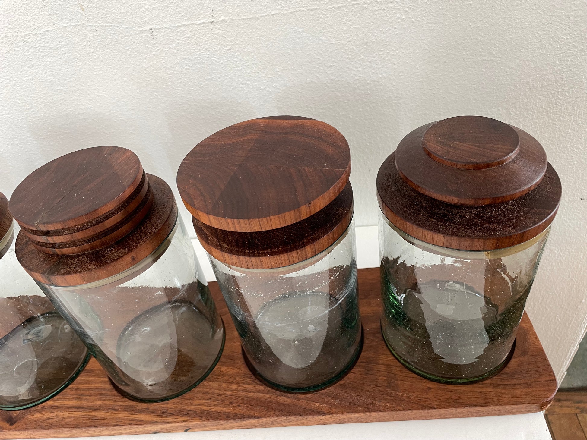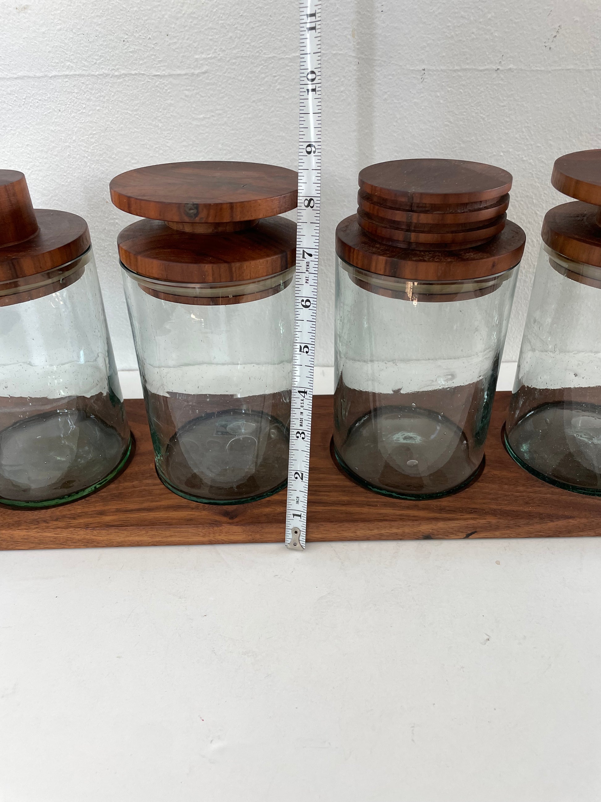 Mid 20th Century Solid Walnut and Blown Glass Canister Jars With Stand- 7 Pieces