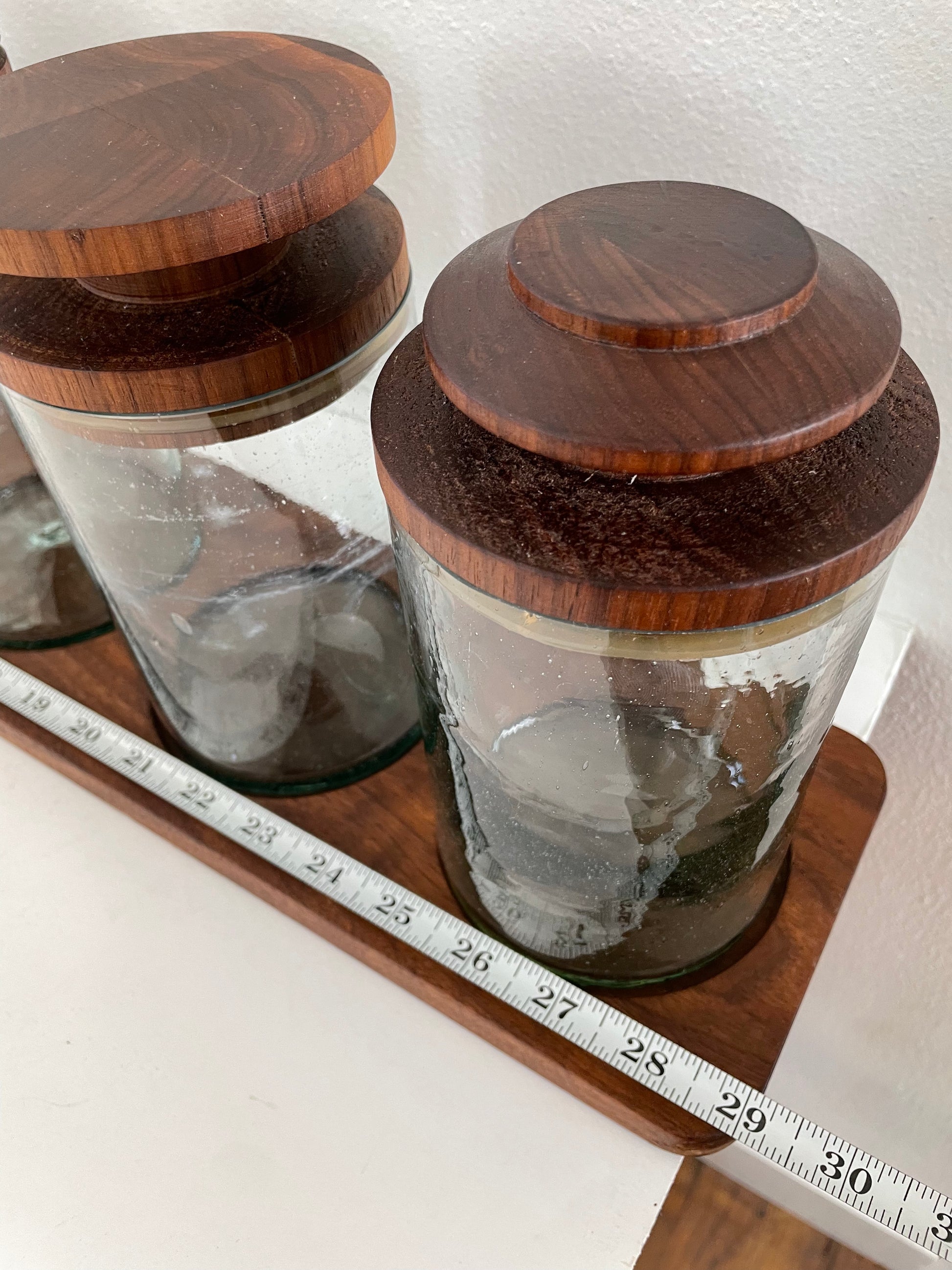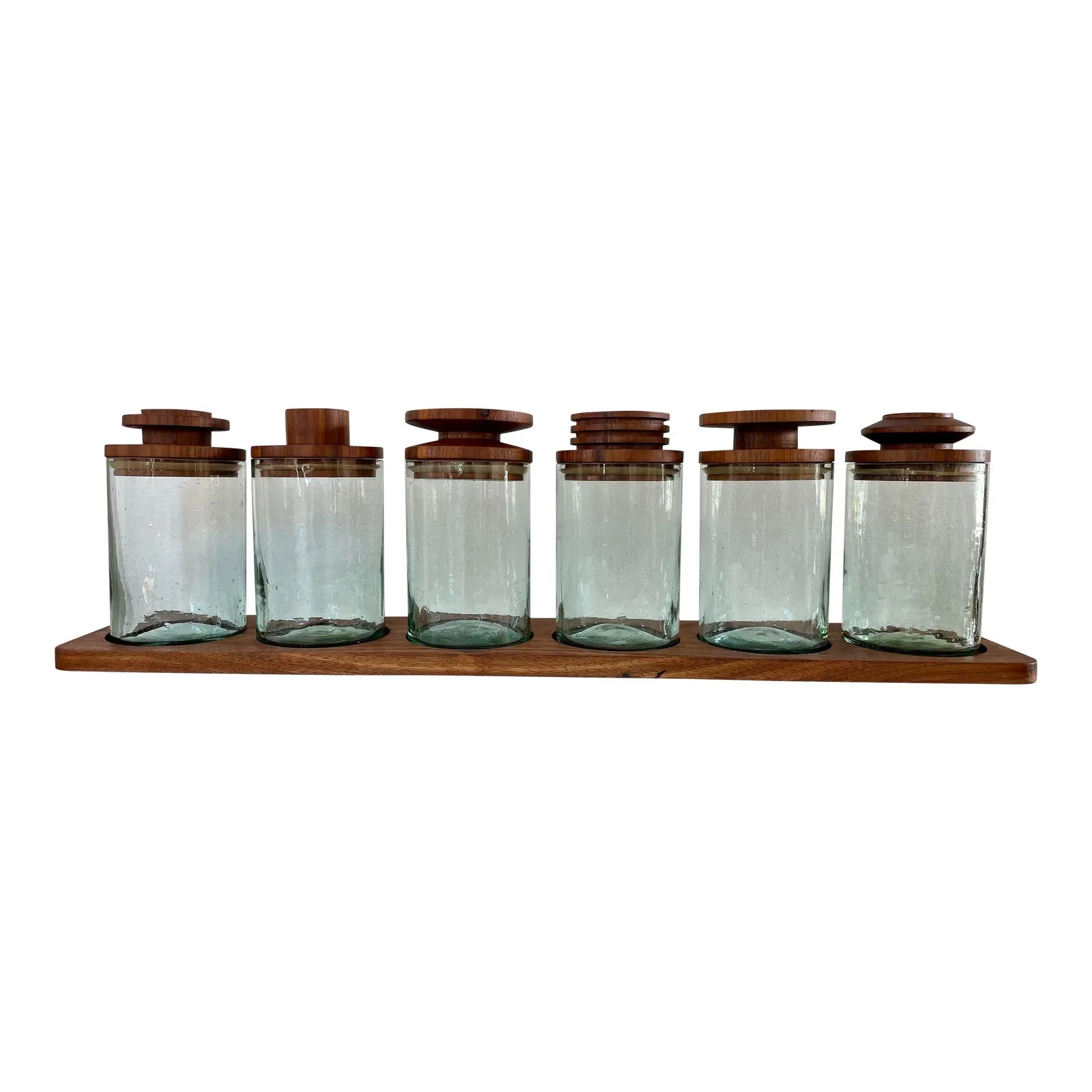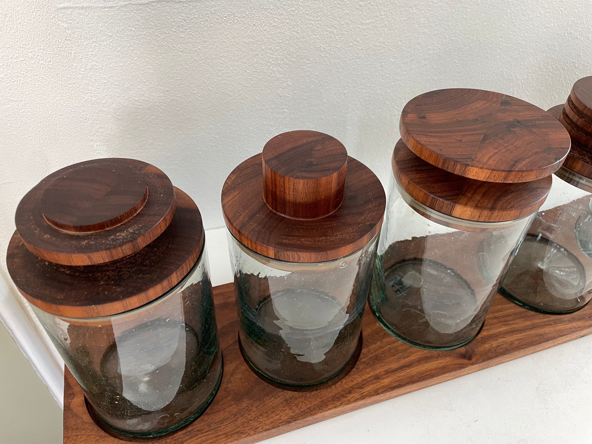 Mid 20th Century Solid Walnut and Blown Glass Canister Jars With Stand- 7 Pieces