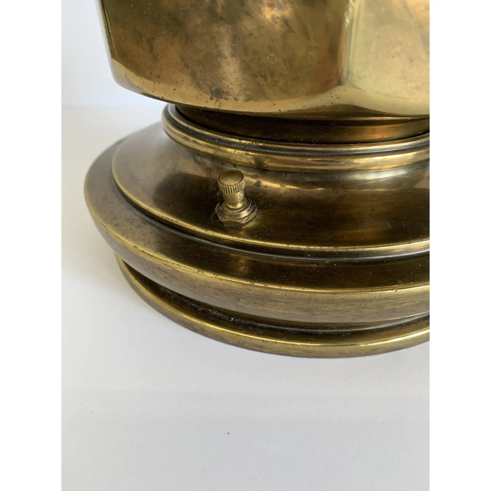 Spots of tarnish from age. The lamps have not been polished, so have some patina. There are a couple of minor blemishes around them but adds overall good aesthetic character to it.