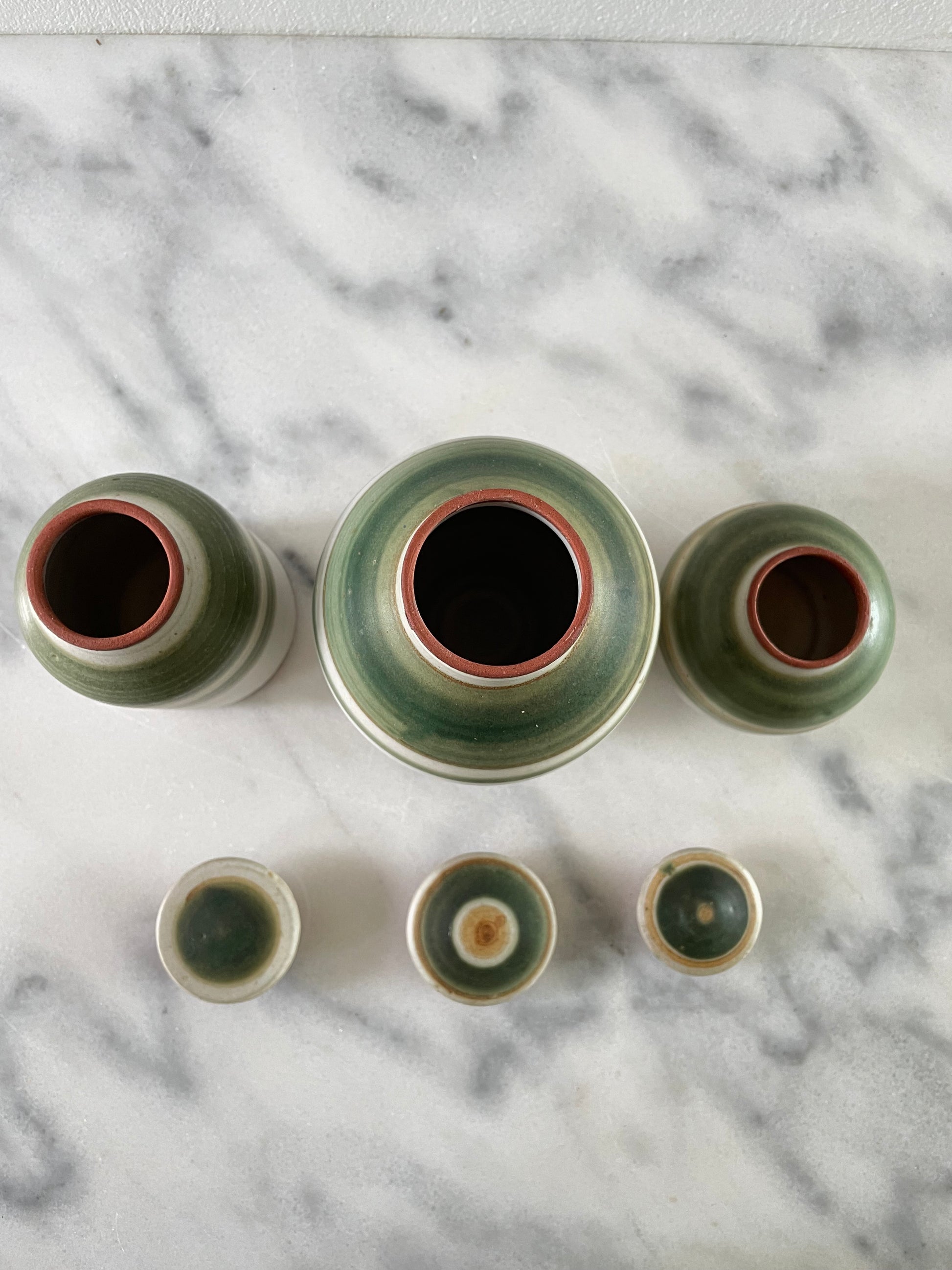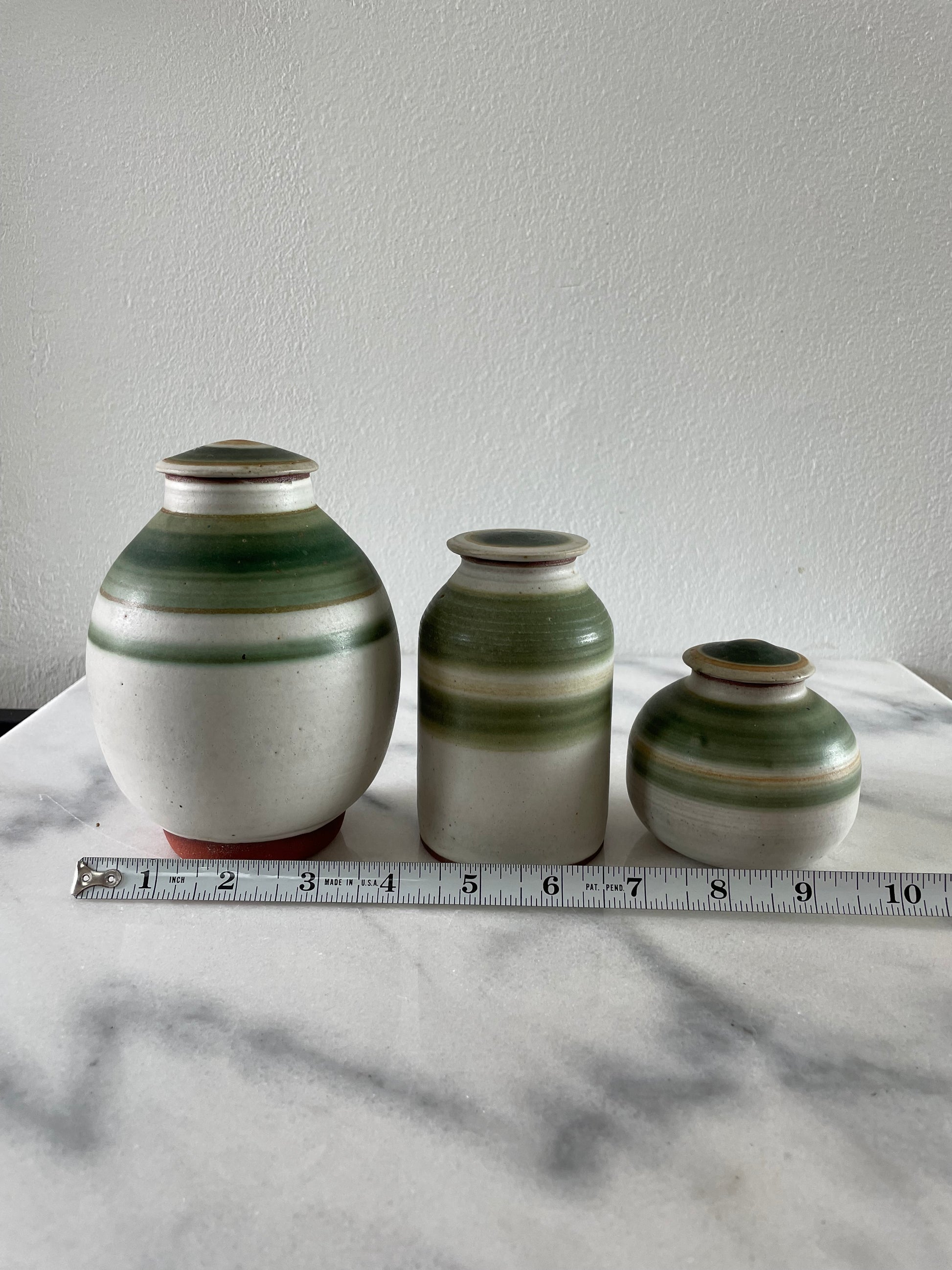 A set of three studio ceramic jars with attractive light gray and green striped glaze design. The containers have a terra cotta clay body and each one has a fitted lid. These are attractive shelf decoration and functional for small item storage in a bathroom or kitchen. Each piece is signed on the bottom, William.