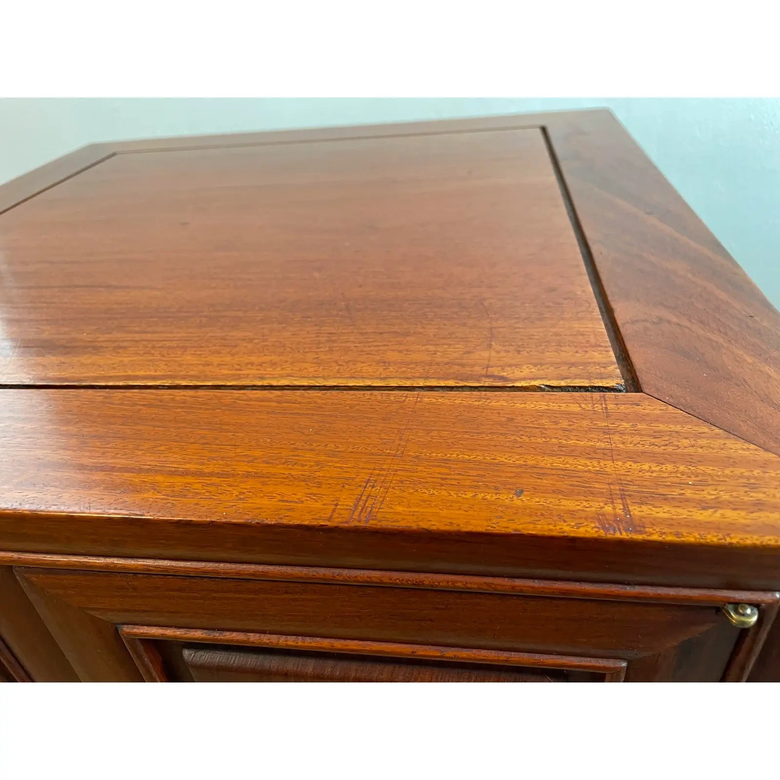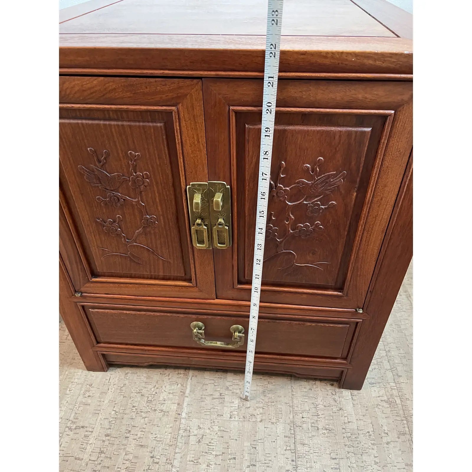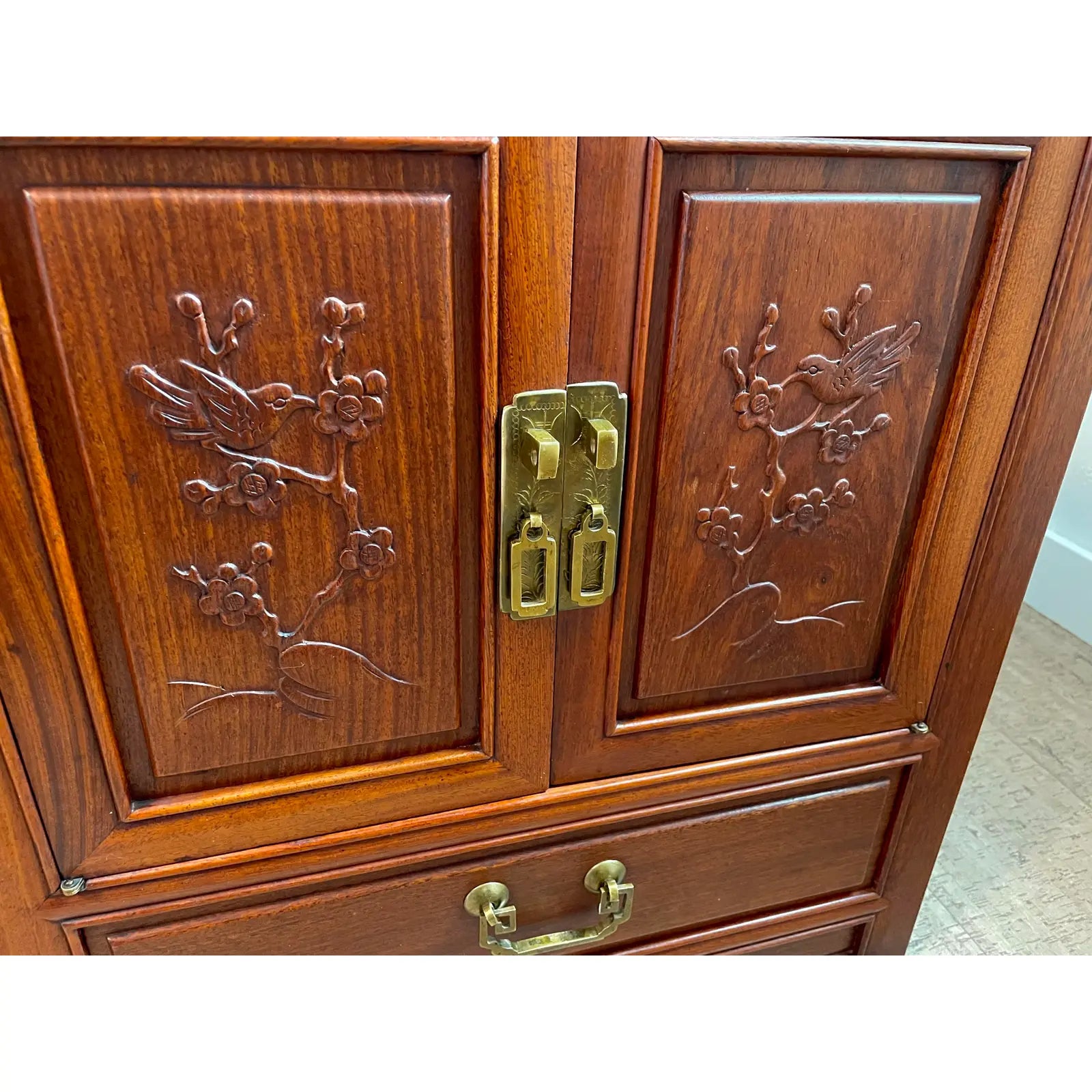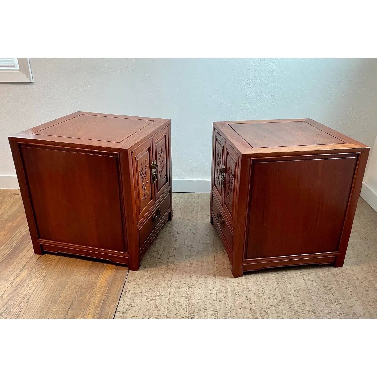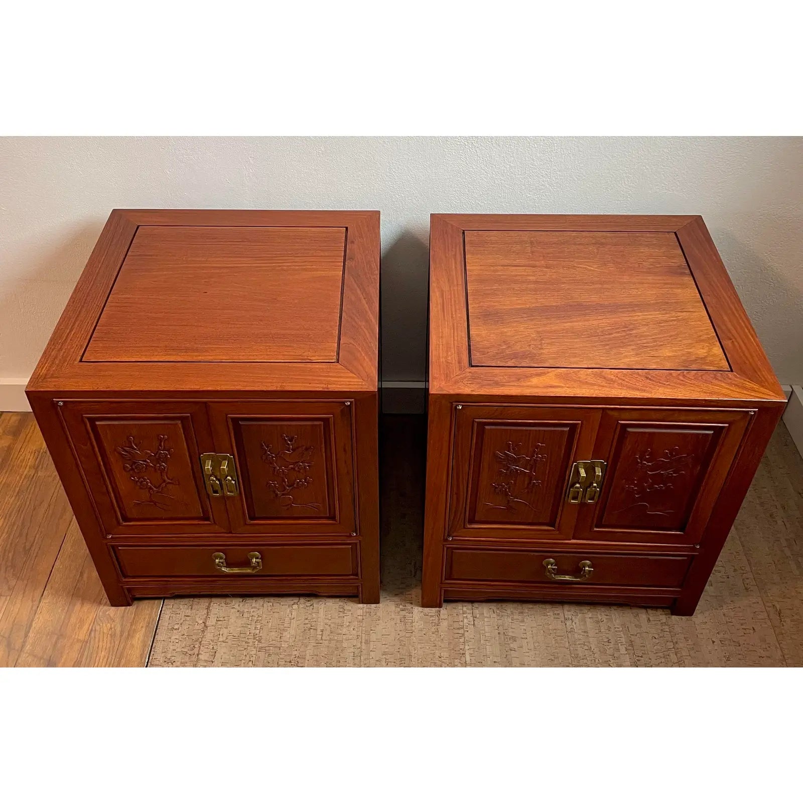 Hand carved solid rosewood nightstands side tables with exquisite cherry blossom tree and birds detailing on raised panels. Excellent craftsmanship as seen by the timeless elegance, warm color, dovetailed joinery construction and brass hardware.