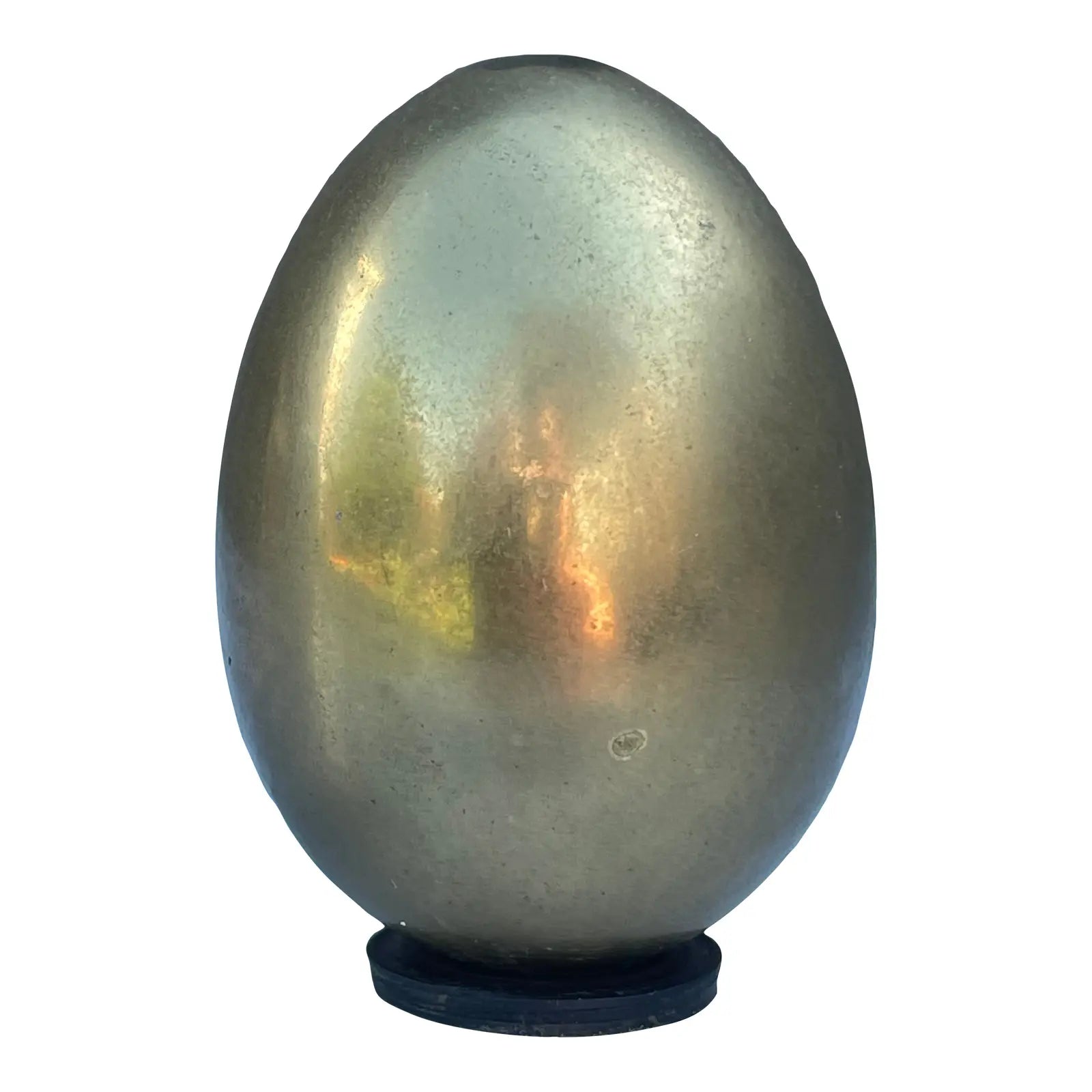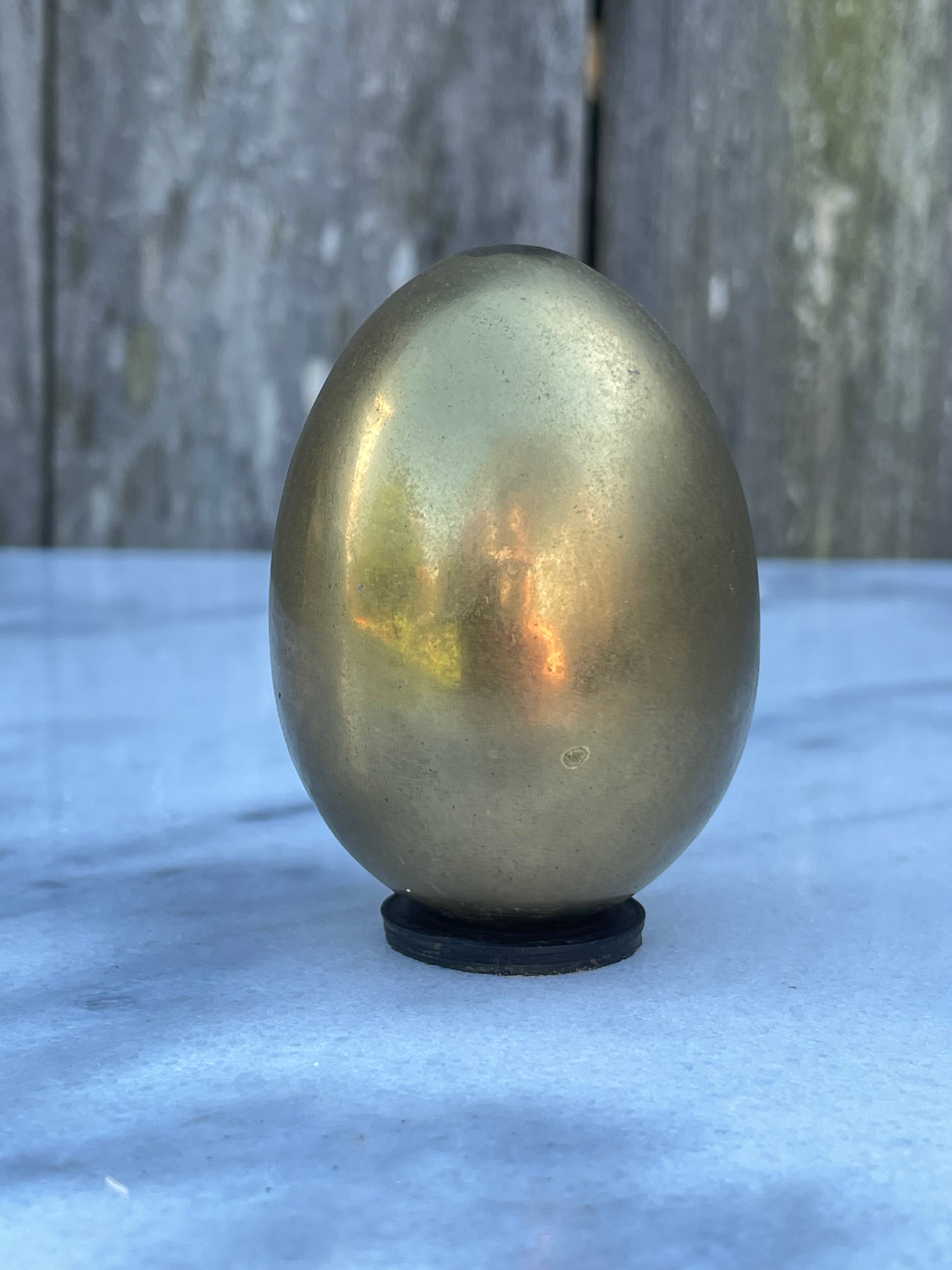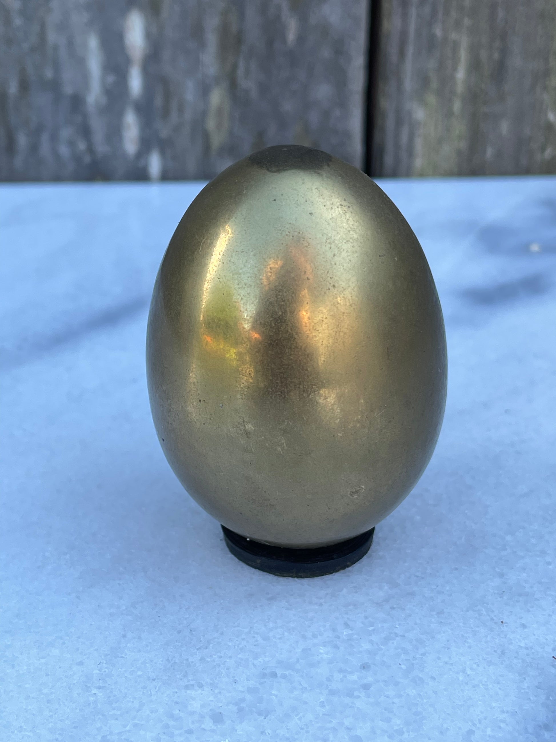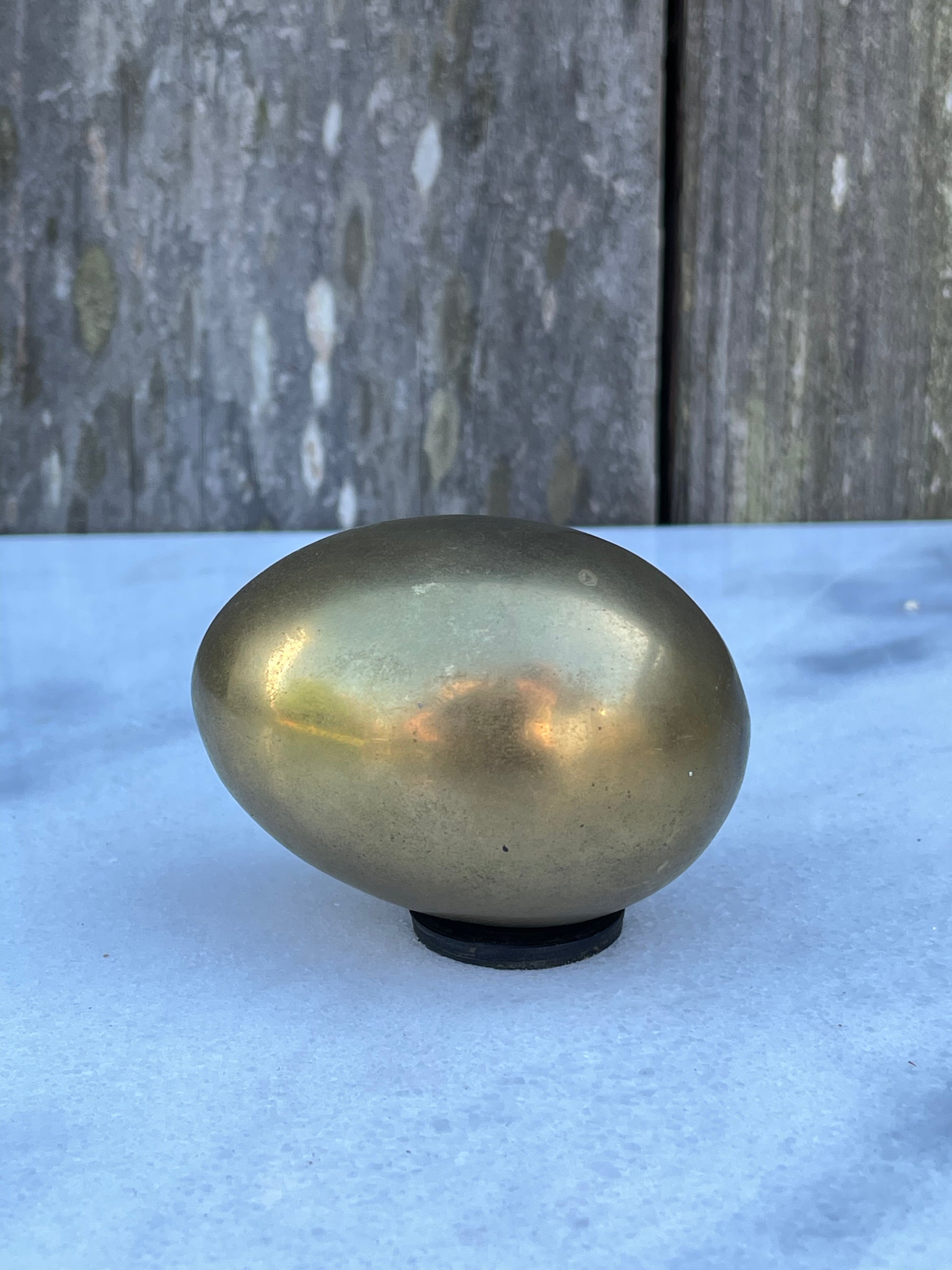 A vintage Aubock style brass egg sculpture with aged patina. This piece has great form and feel, sure to add interest to any display. The egg is crafted from solid brass with a hollow inside. It sits on a simple o-ring.