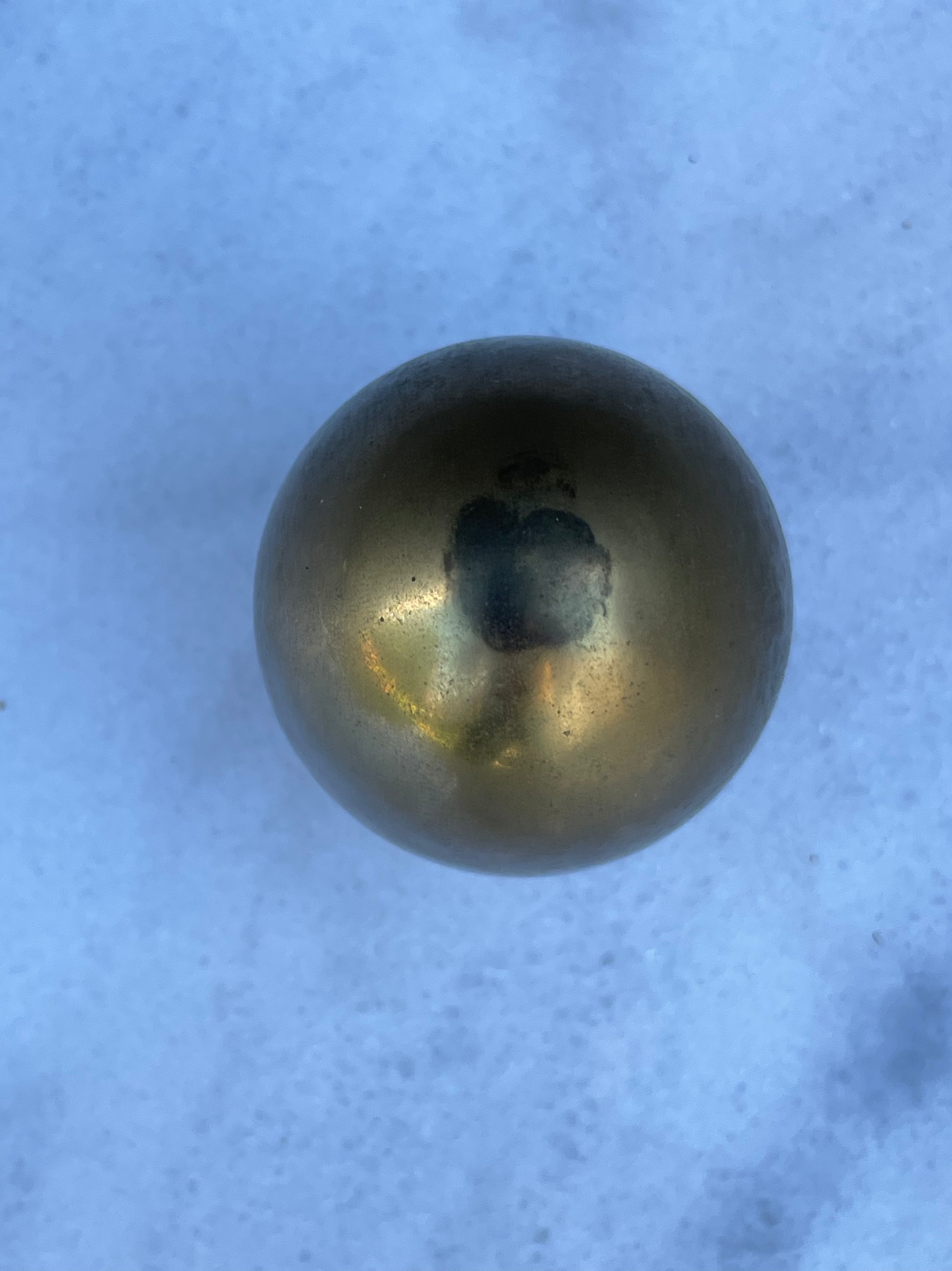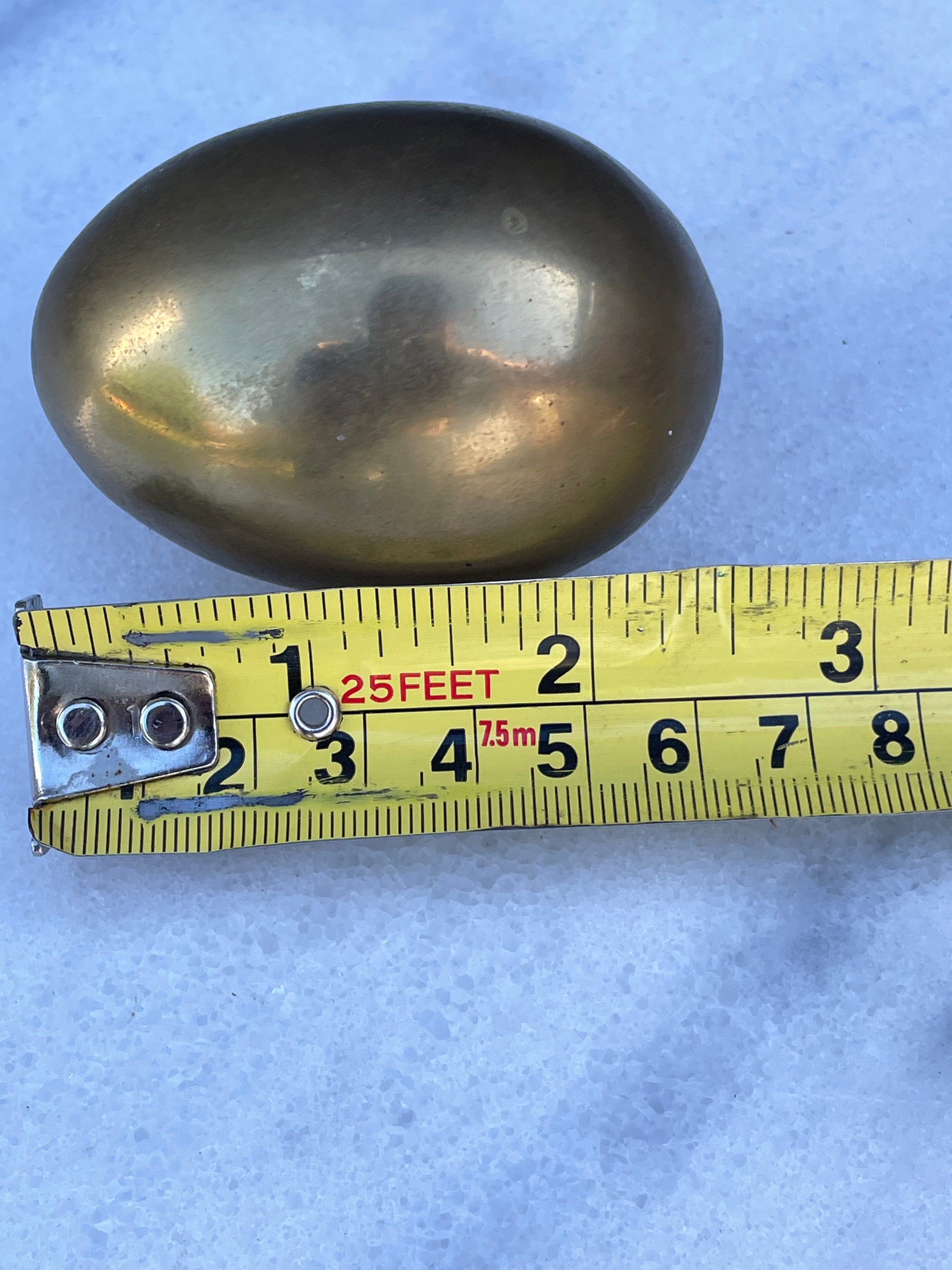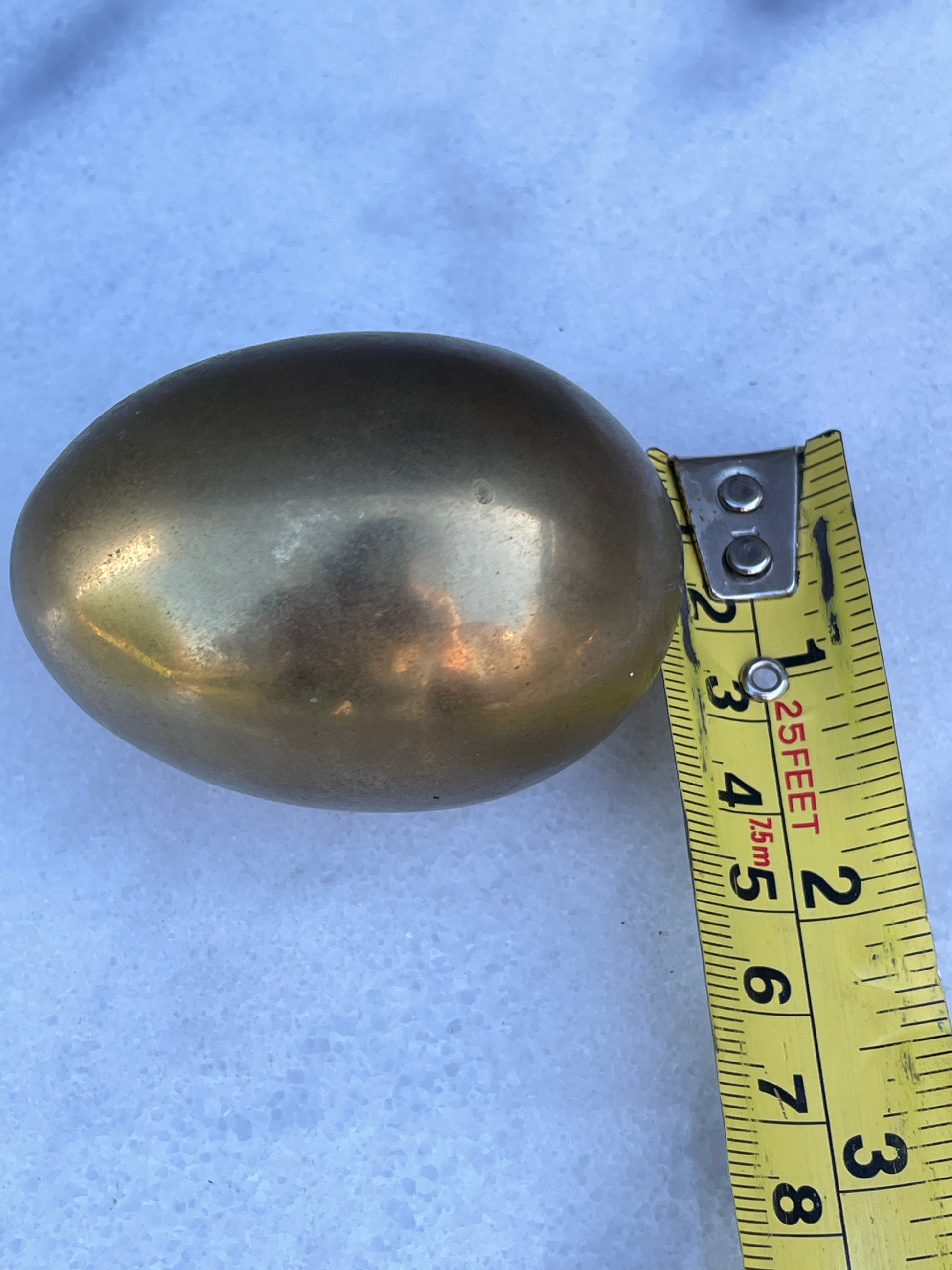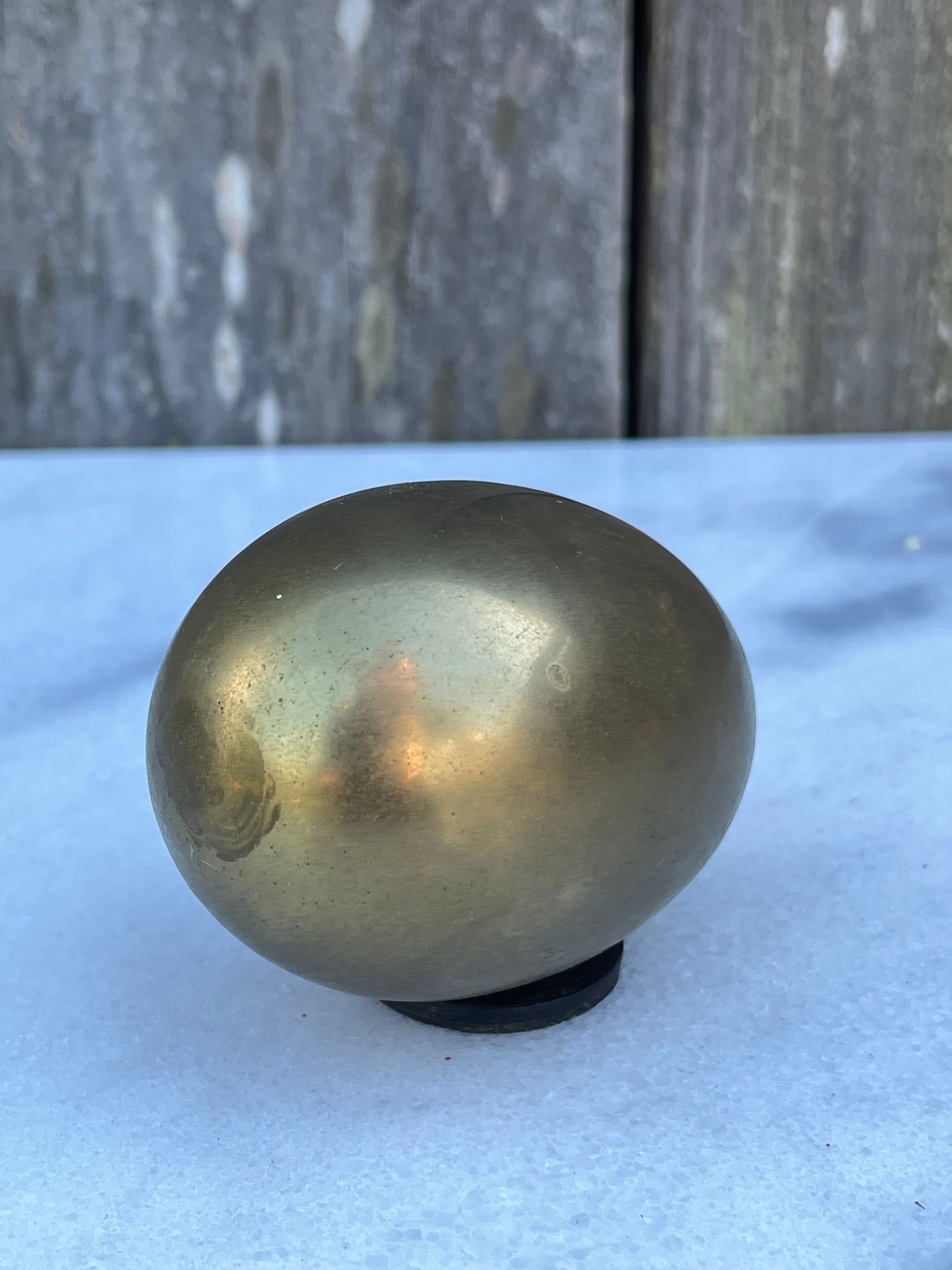 A vintage Aubock style brass egg sculpture with aged patina. This piece has great form and feel, sure to add interest to any display. The egg is crafted from solid brass with a hollow inside. It sits on a simple o-ring.