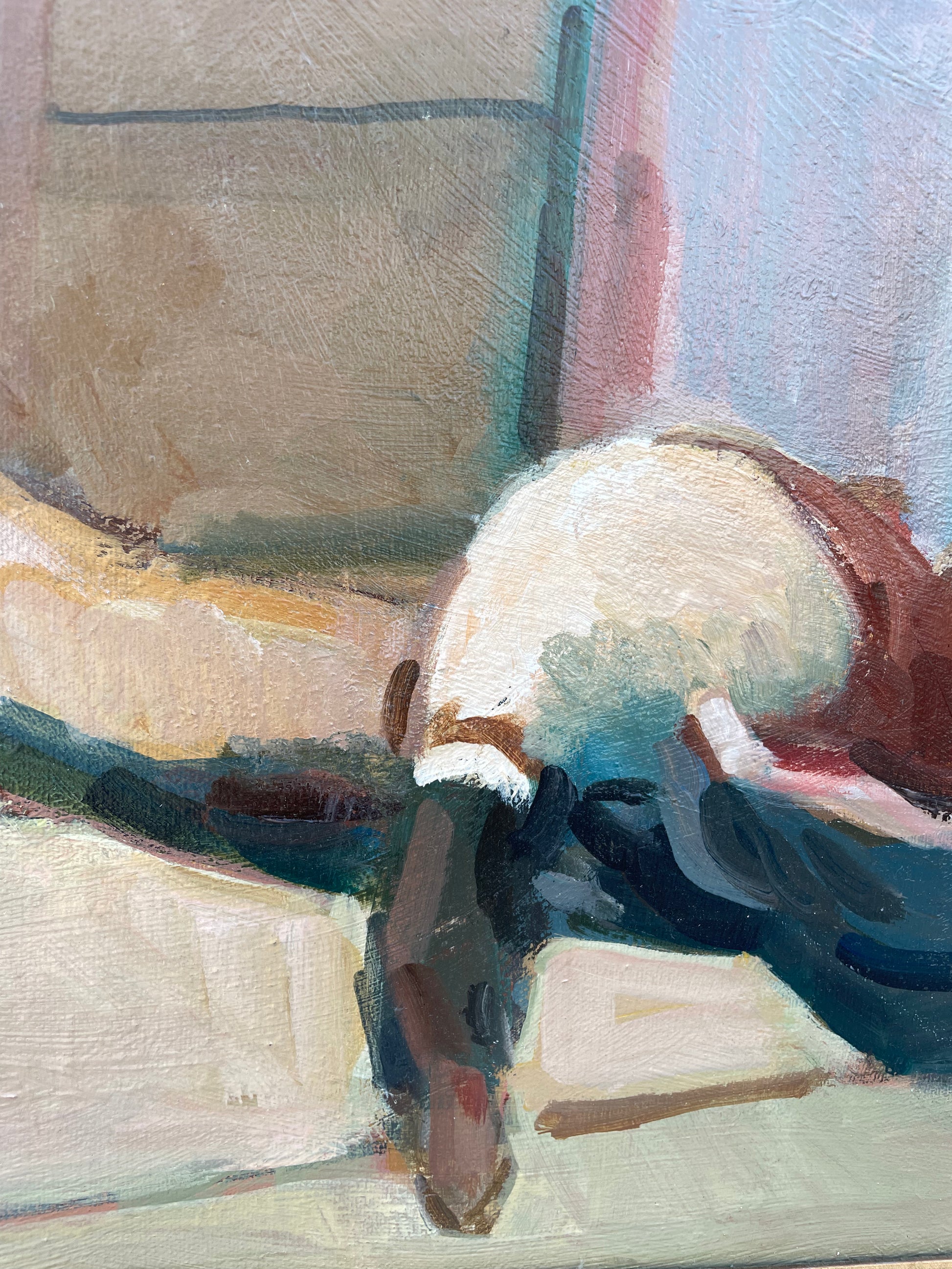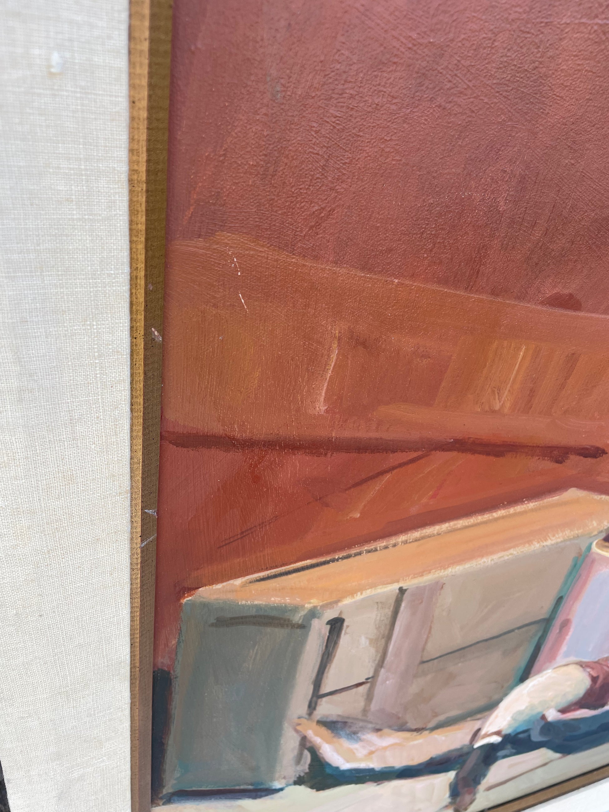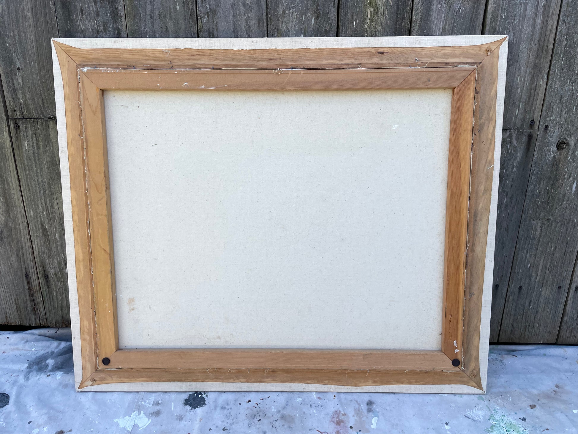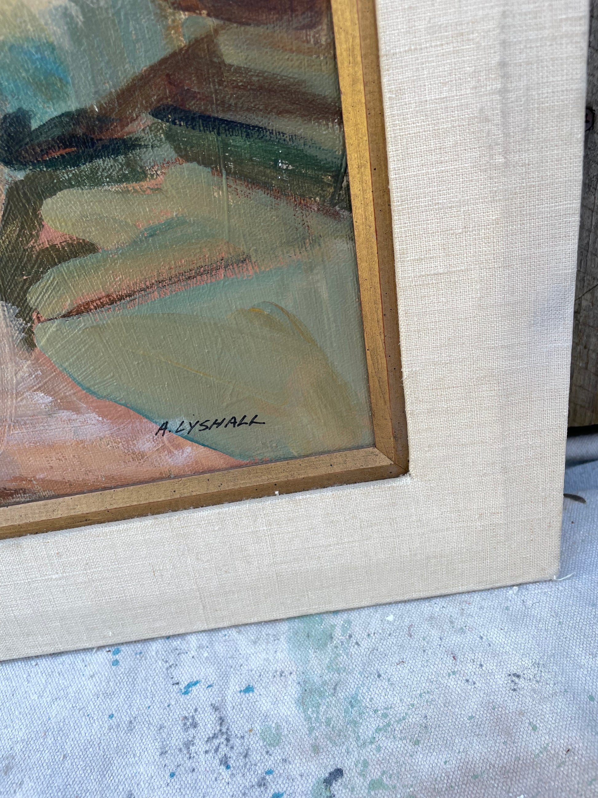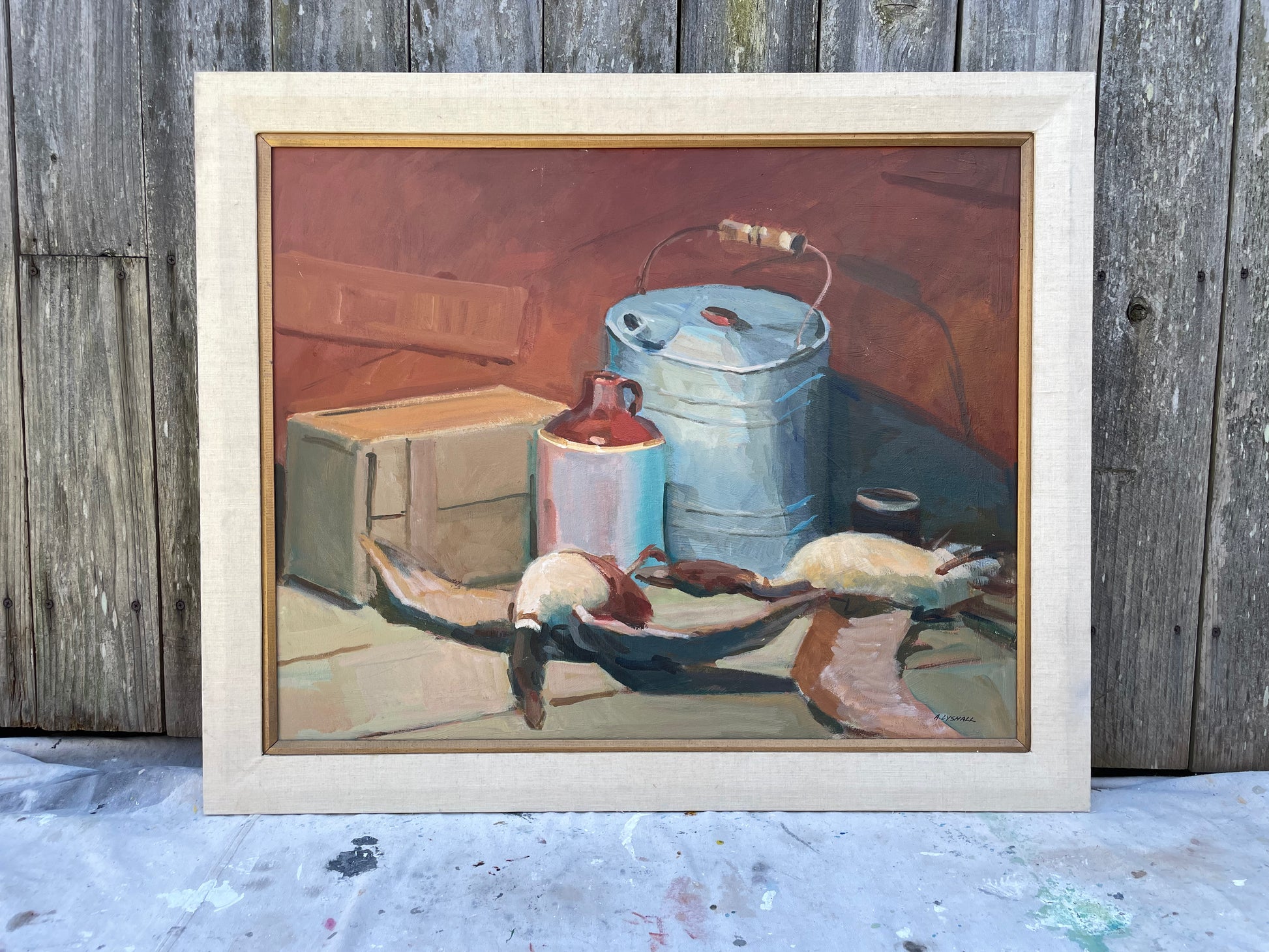 A vintage oil on canvas featuring a rustic still life scene with geese in rich terracotta, tan, and blue tones. The painting is framed in a canvas wrapped frame with gilt rabbet. Signed, A. Lyshall.