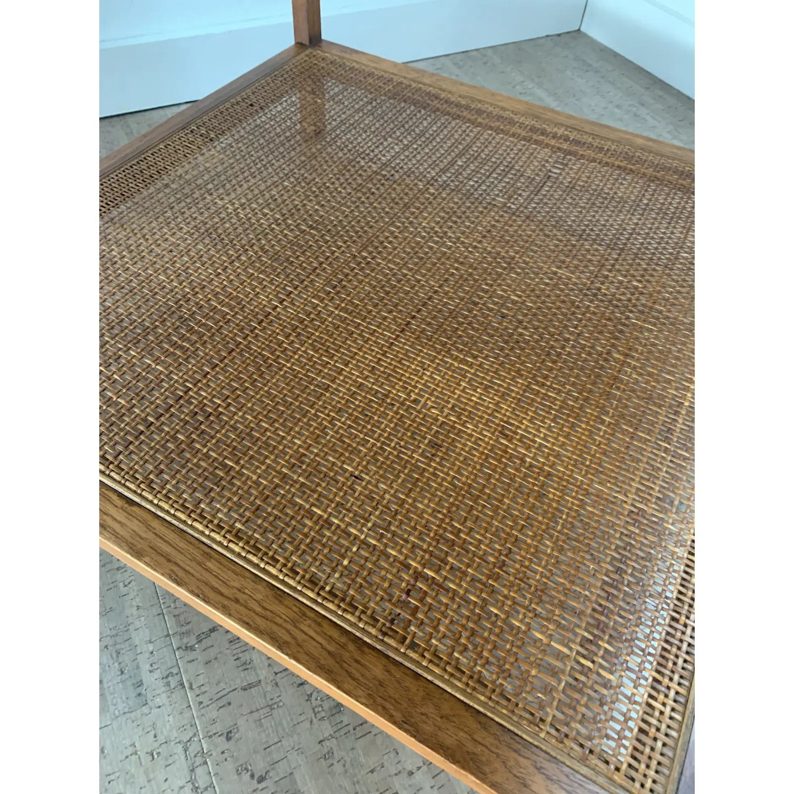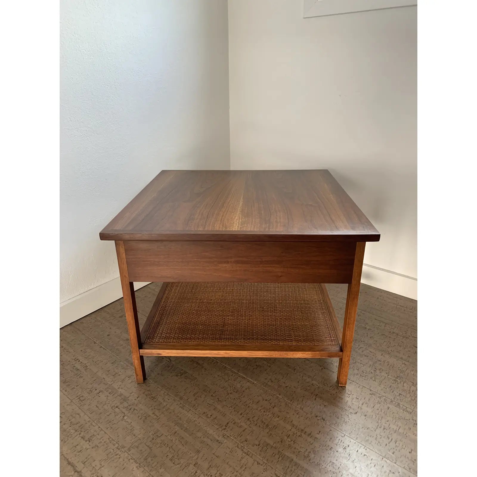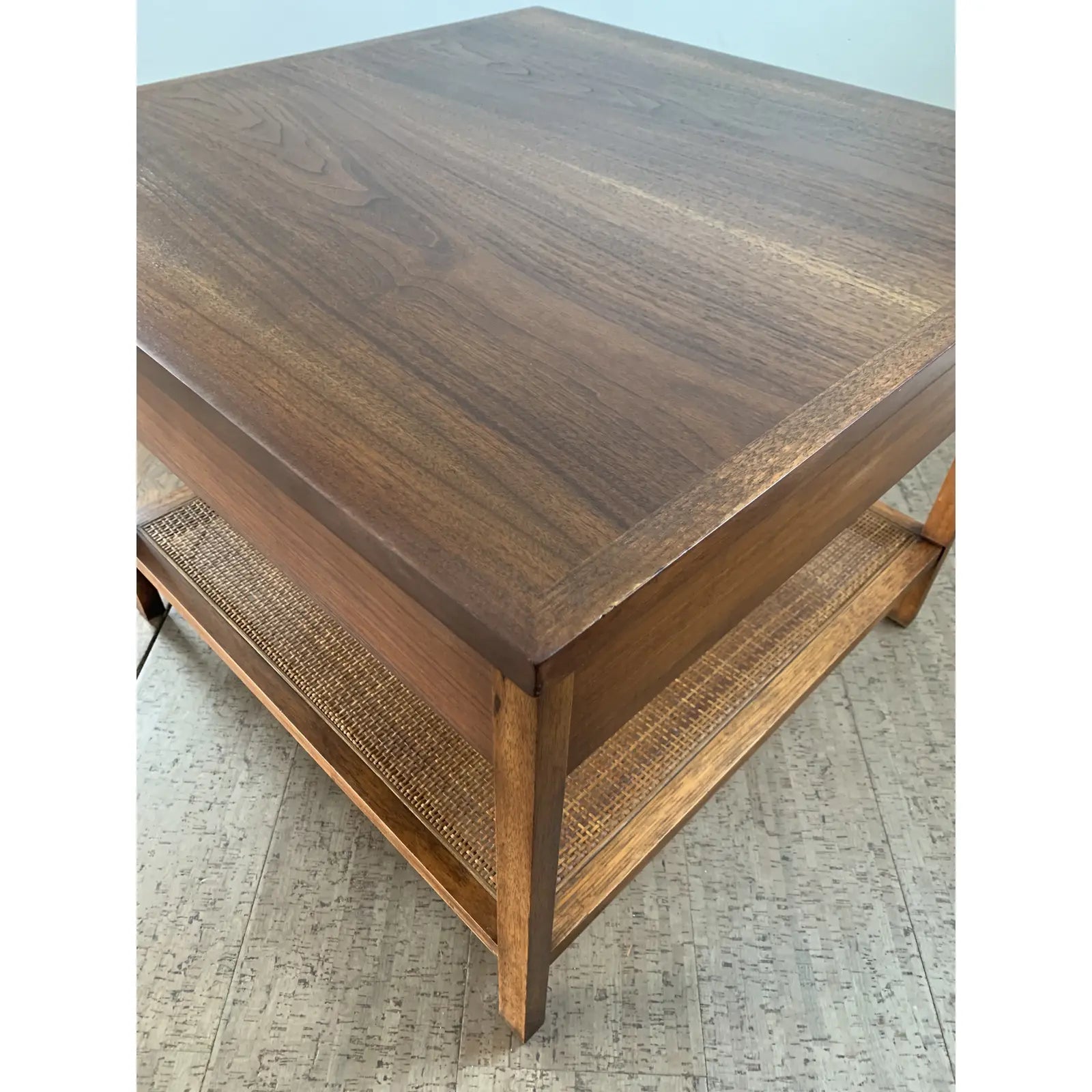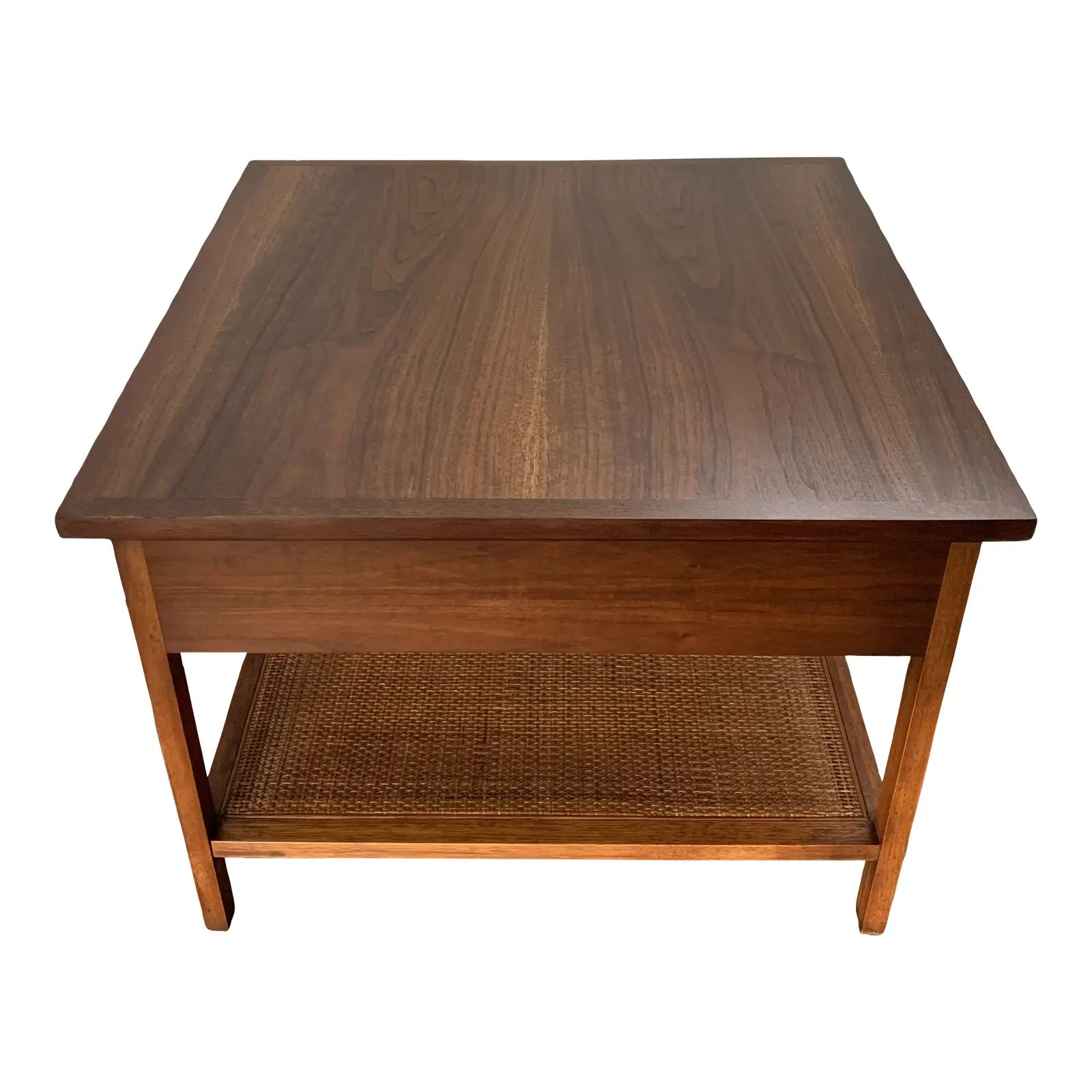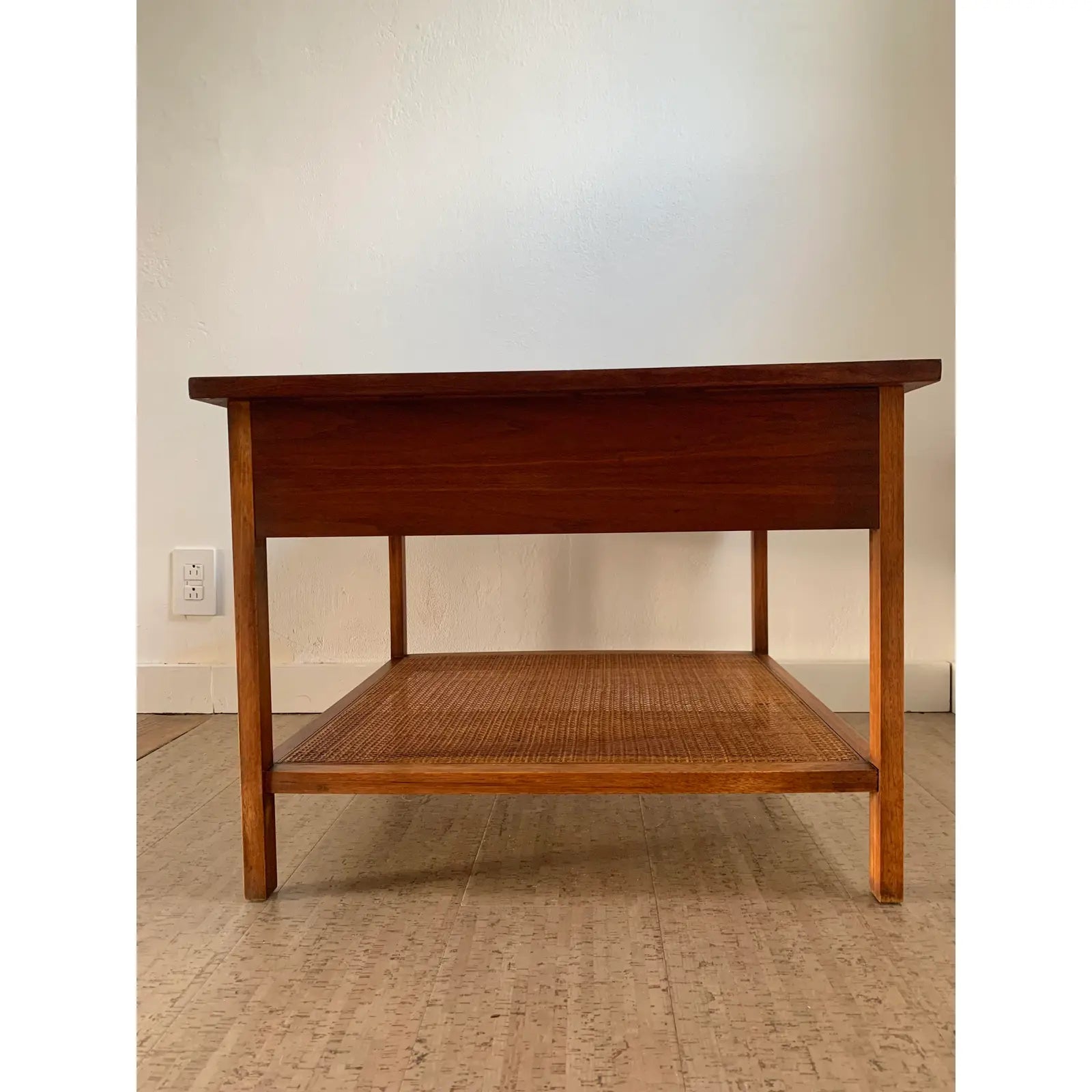 A vintage mid-century modern walnut side table with a woven cane shelf. The table features rich contrasting grain pattern with high quality construction. This table once had a drawer, but it was found without and restored for use as a side table. It works great with the opening against a wall, as three sides are finished with walnut panel. See photos for detail.