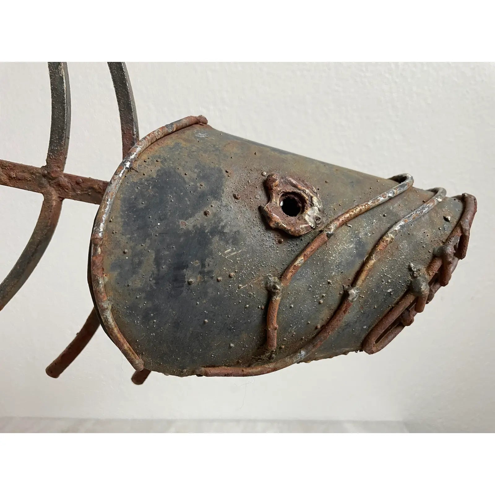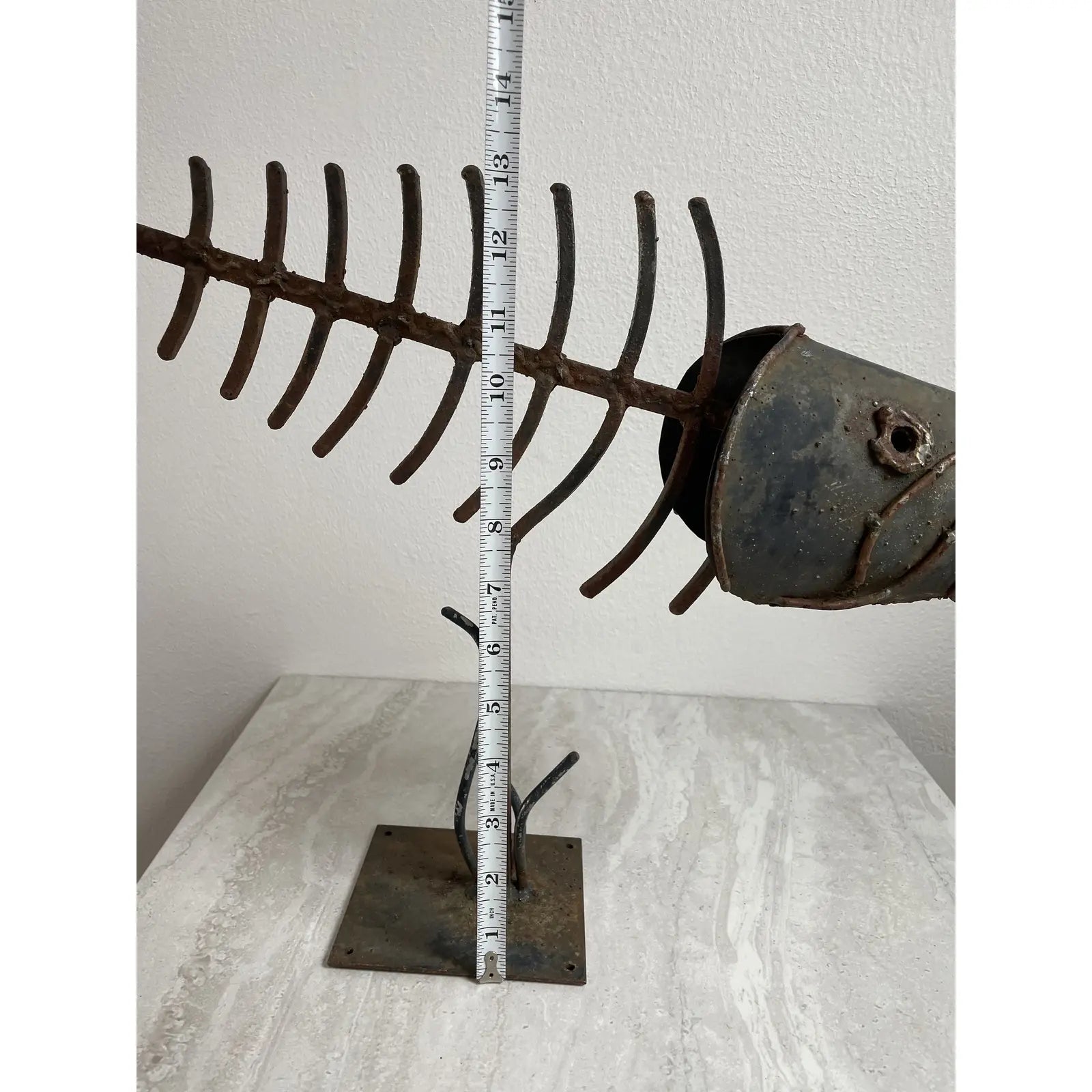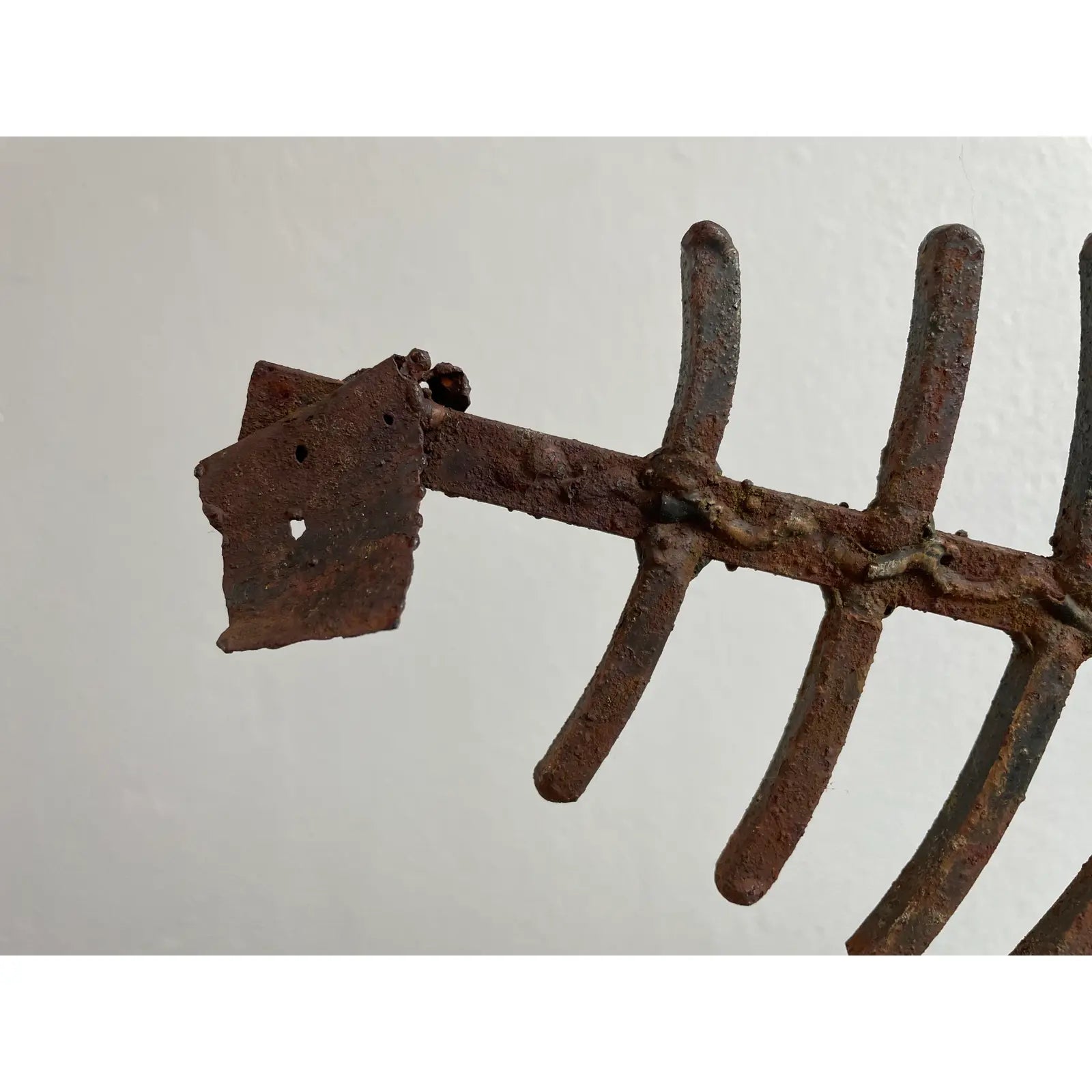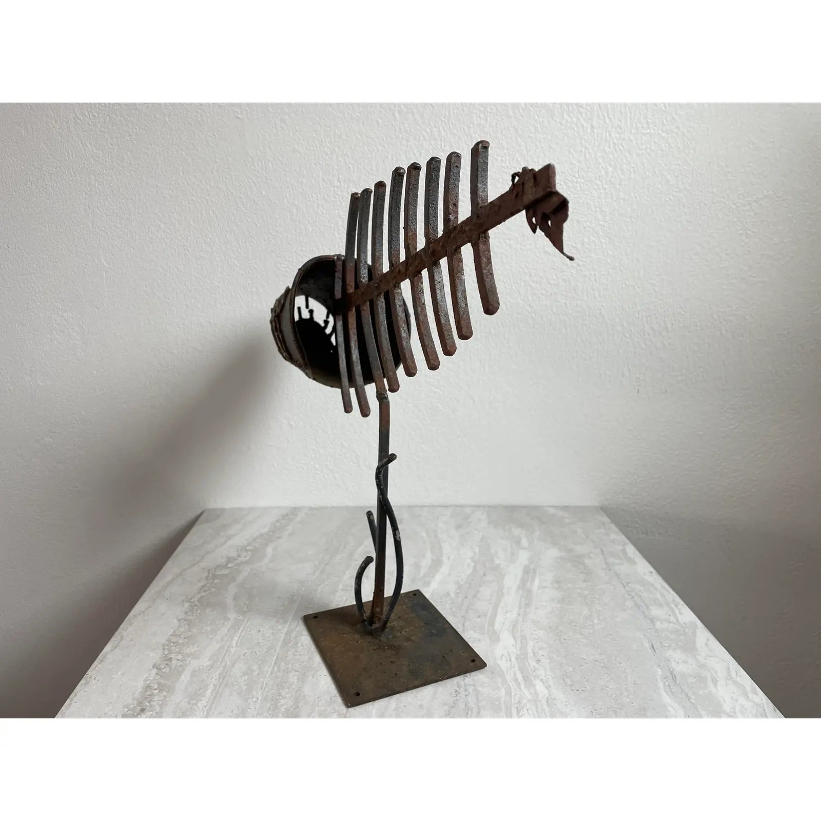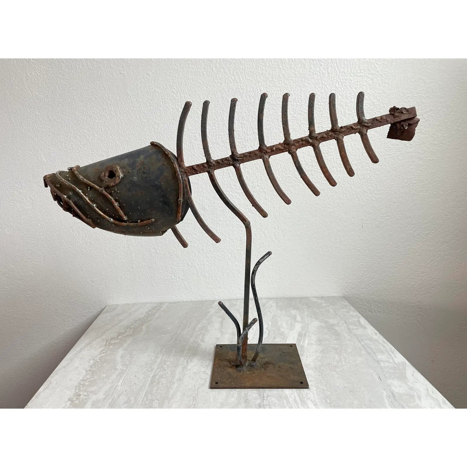 A vintage mid-century modern brutalist stylized welded metal sculpture featuring a fishbone with head on stand.