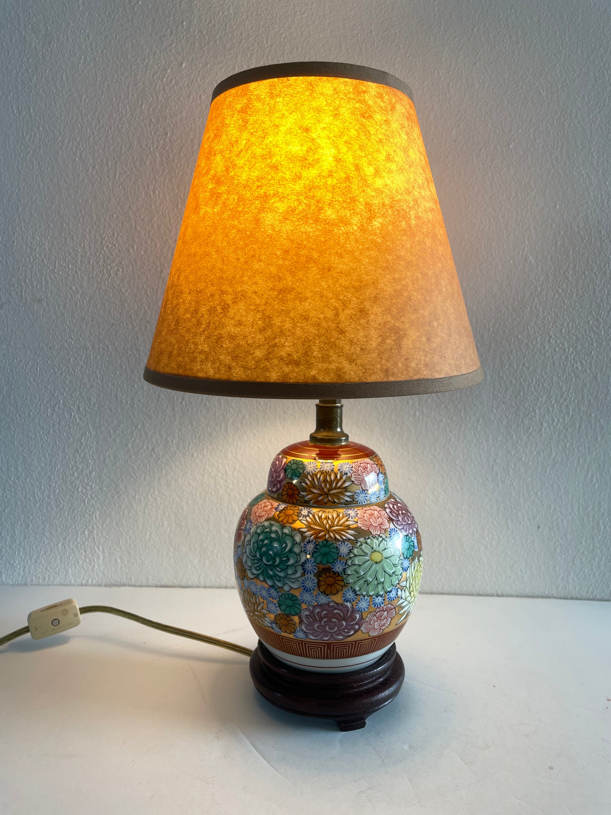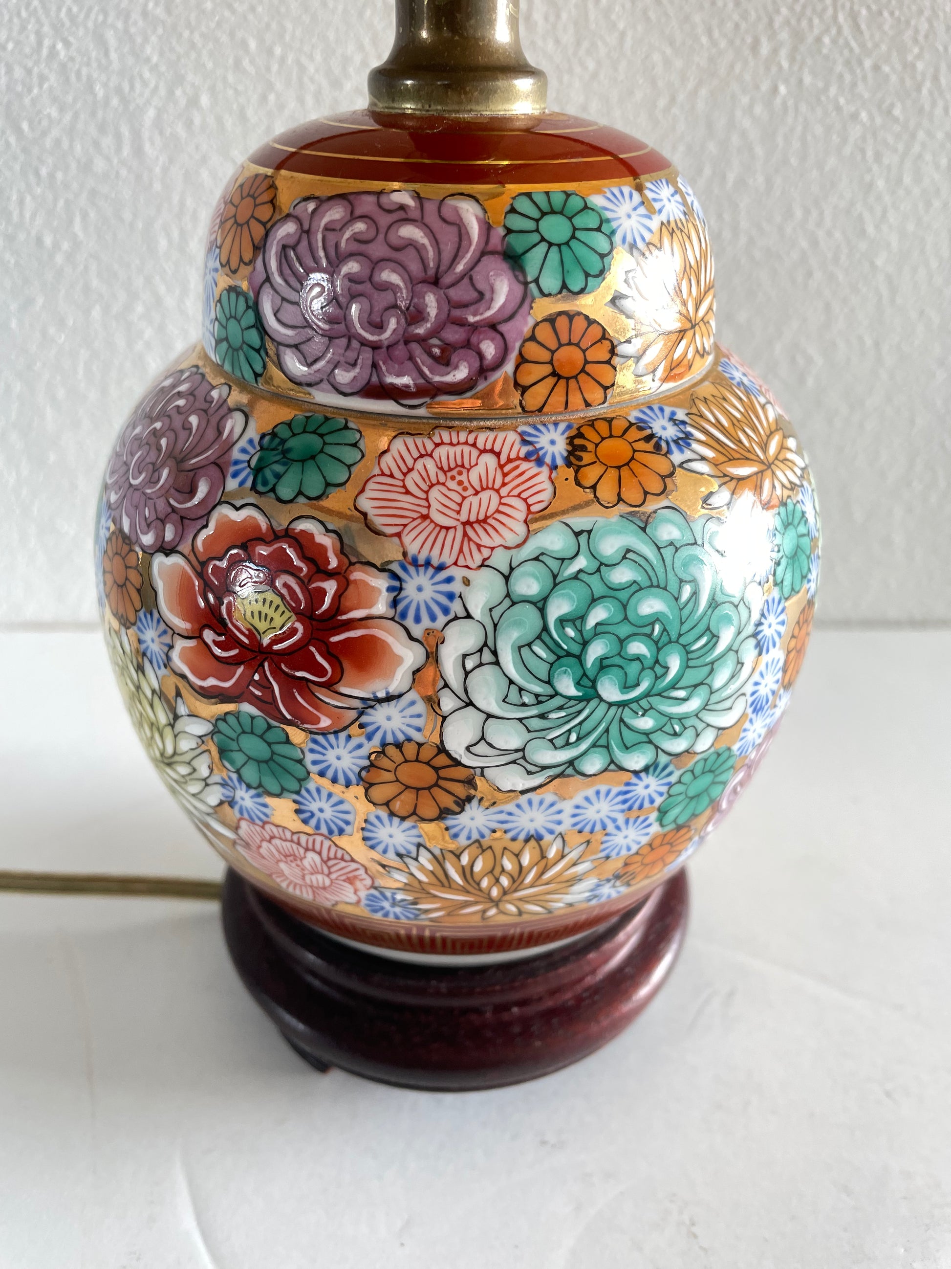 Adorable petite vintage floral Japanese ginger gar table lamp with rosewood base and a warm light glow. Rich gold accent to warm jewel tone colors.
