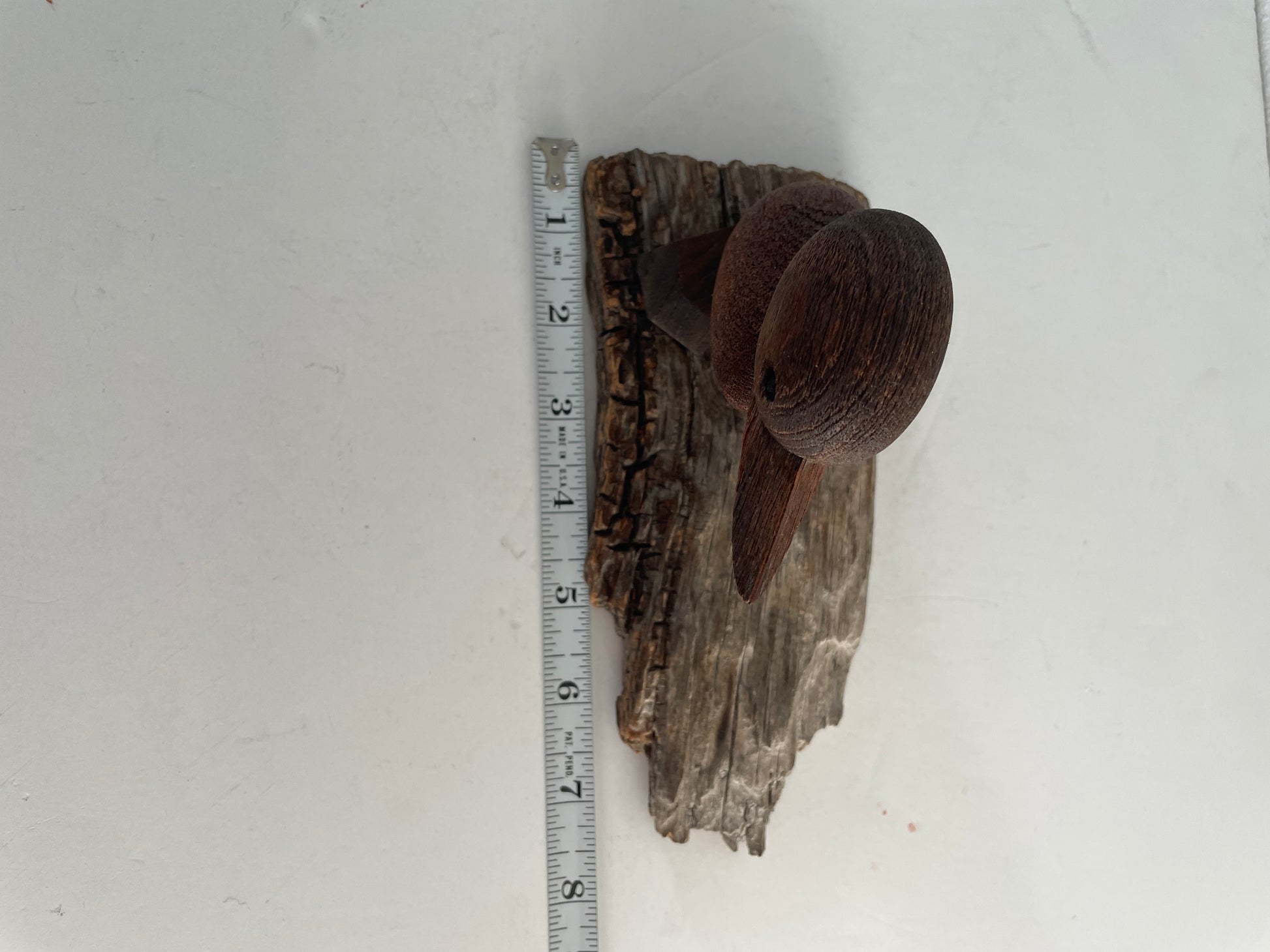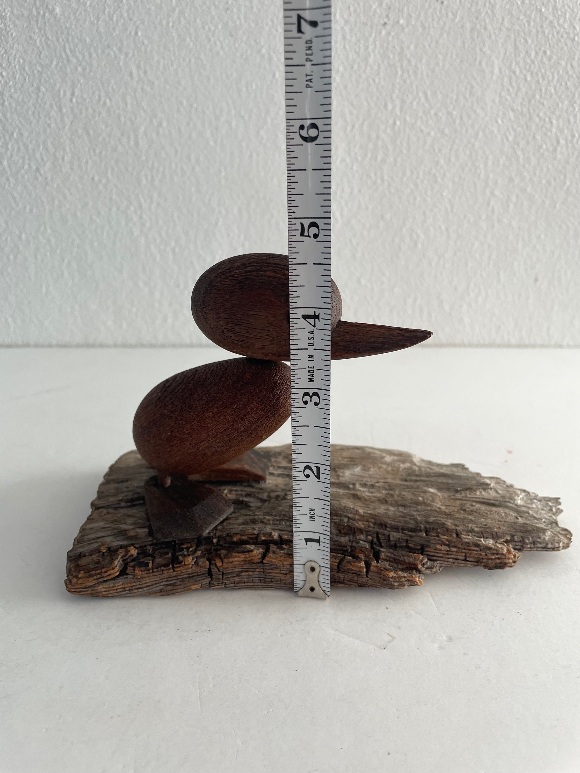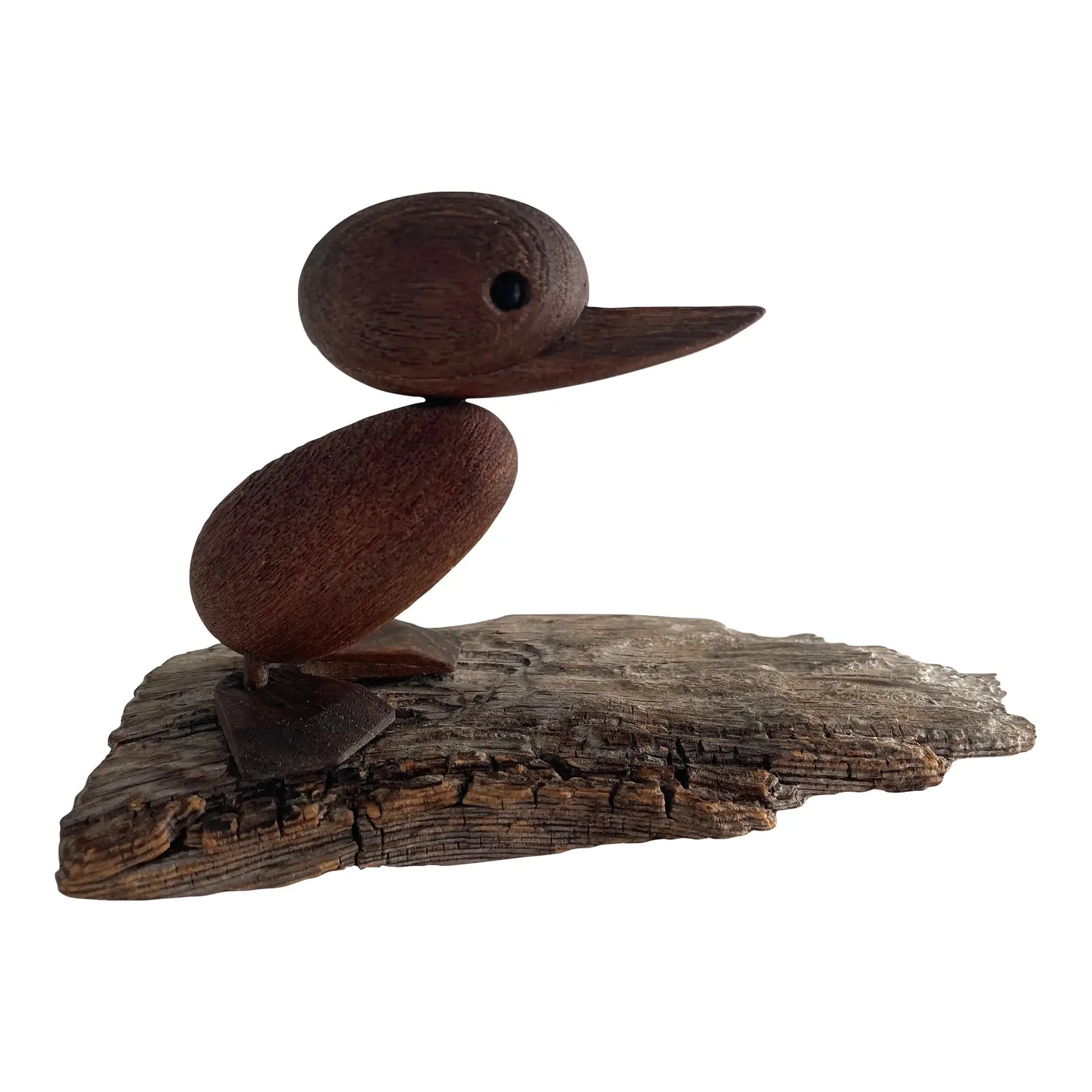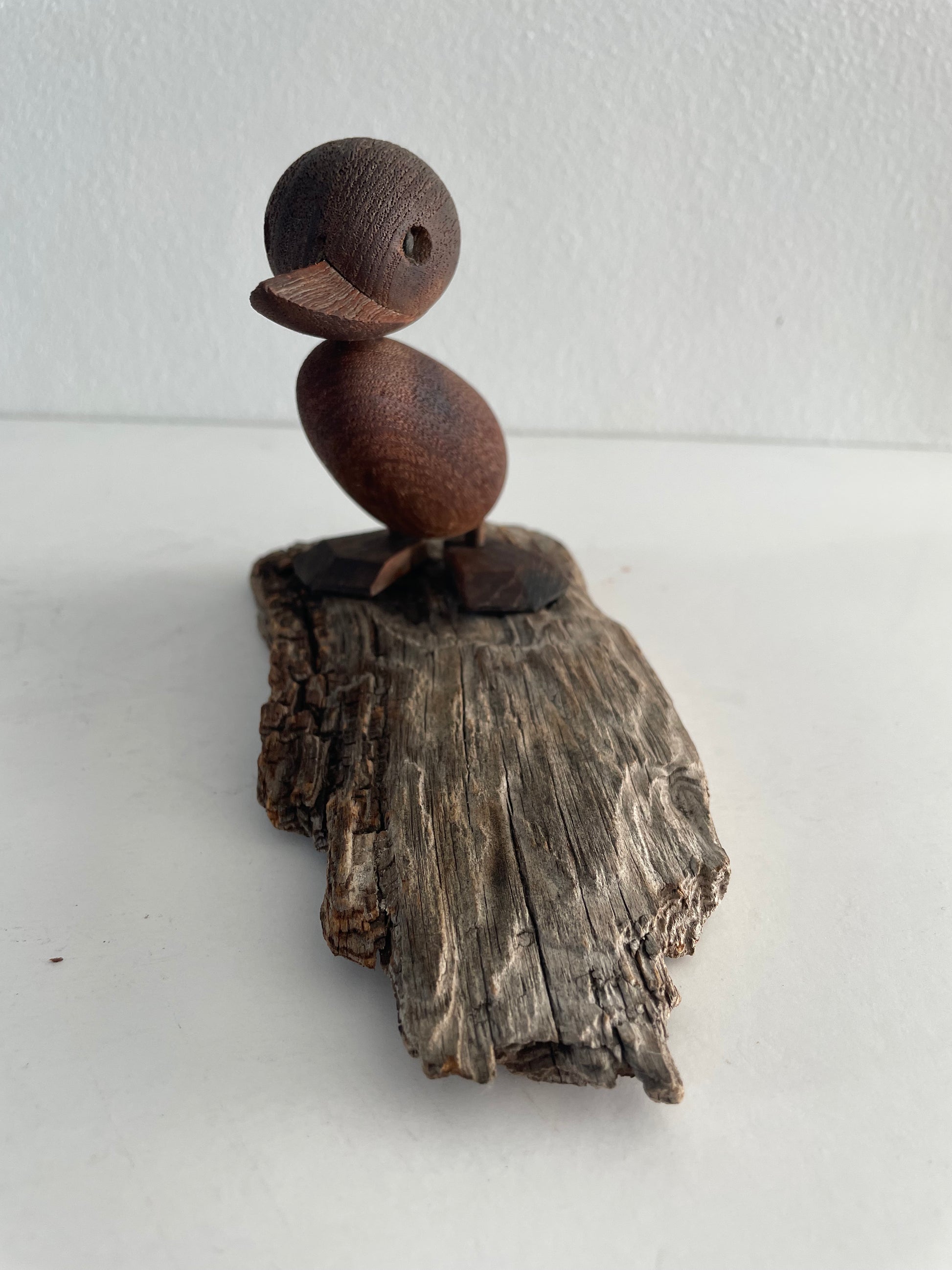 Delightful Hans Bolling teak duckling figure on driftwood. Organic vintage charm can be added to any space for aesthetic appeal.