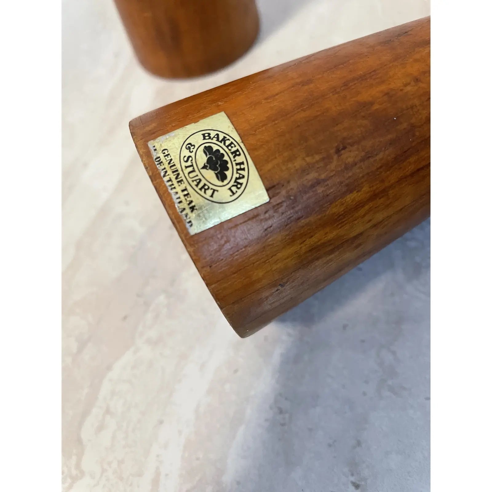 A pair of vintage Danish modern style salt and pepper shakers featuring rich, solid teak wood with soft rounded edges.