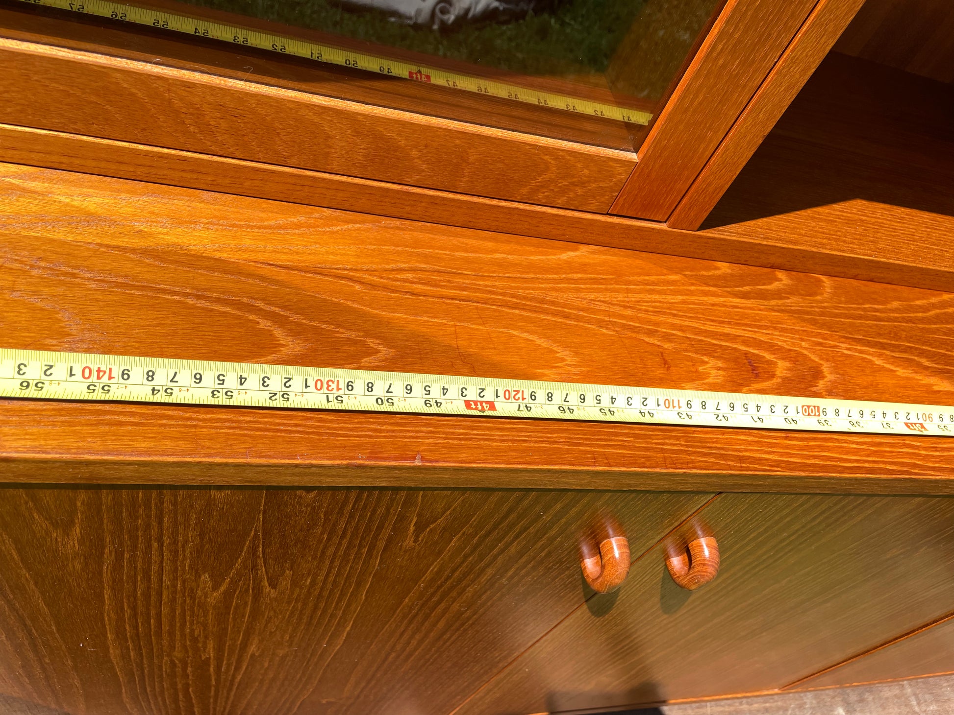 Excellent quality piece from the 1970s. Recently waxed and cleaned up for its new home. Danish stamp under lower cabinet. All doors and shelves in pristine condition. Minor scratches and scuffs around piece.
