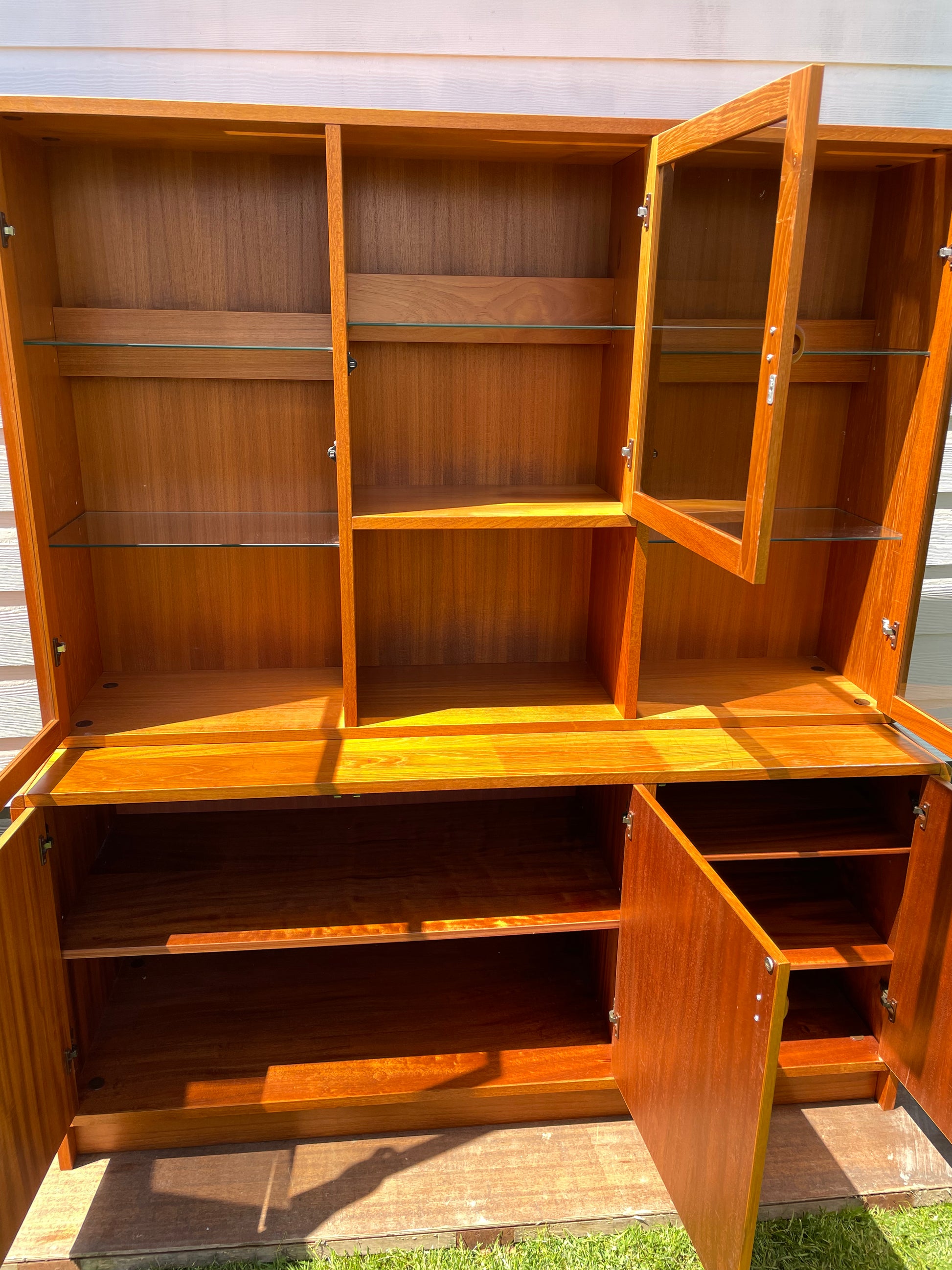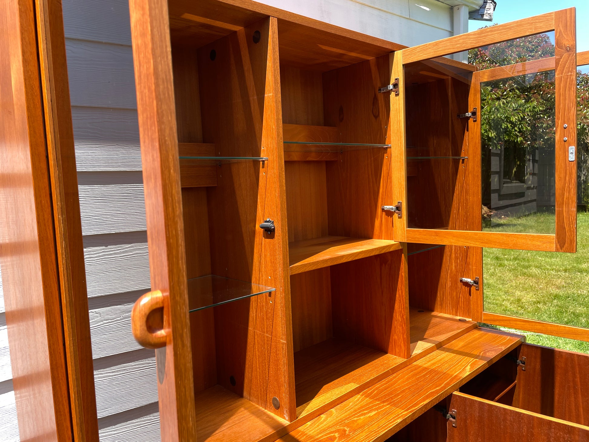 Excellent quality piece from the 1970s. Recently waxed and cleaned up for its new home. Danish stamp under lower cabinet. All doors and shelves in pristine condition. Minor scratches and scuffs around piece. See photos*