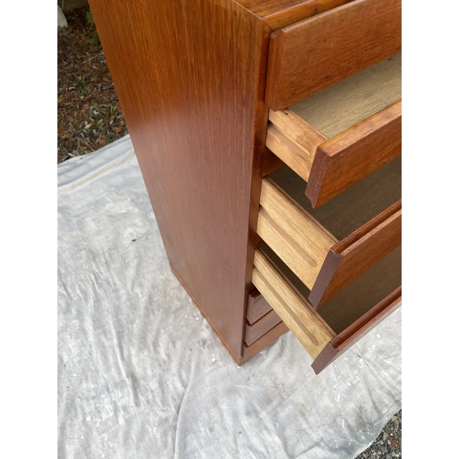 A vintage Danish modern 10-drawer teak dresser with rich, warm wood grain. The dresser features four wide drawers, two half-width drawers, and four shallow drawers at the top