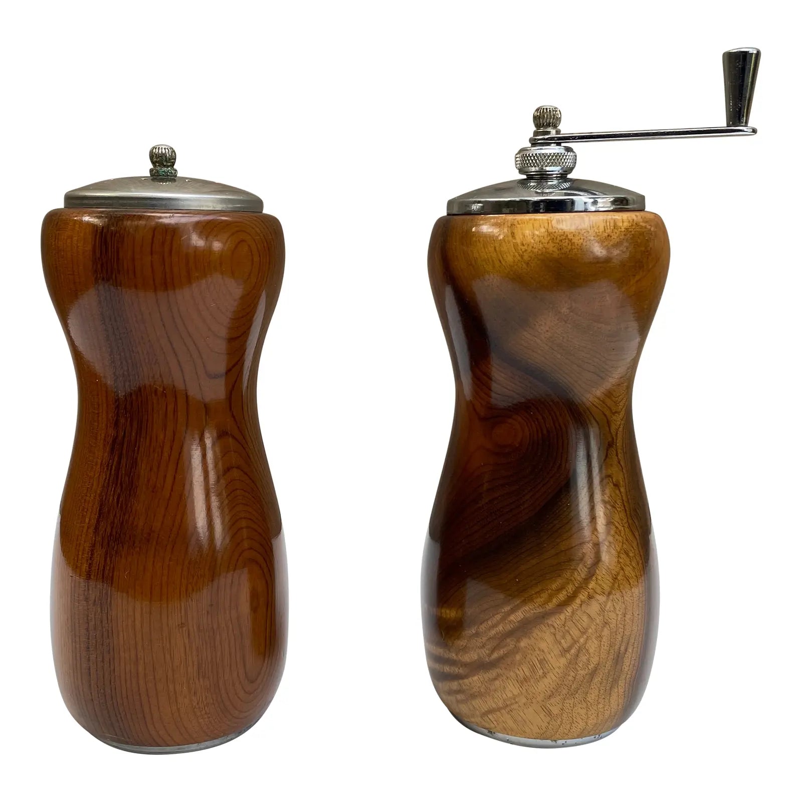 Enhance your dining experience with this set of vintage mid-century modern salt and pepper shakers, boasting a glossy finish. These shakers feature a comfortable size that feels great to handle and an easy-to-use and generous grinding mechanism.
