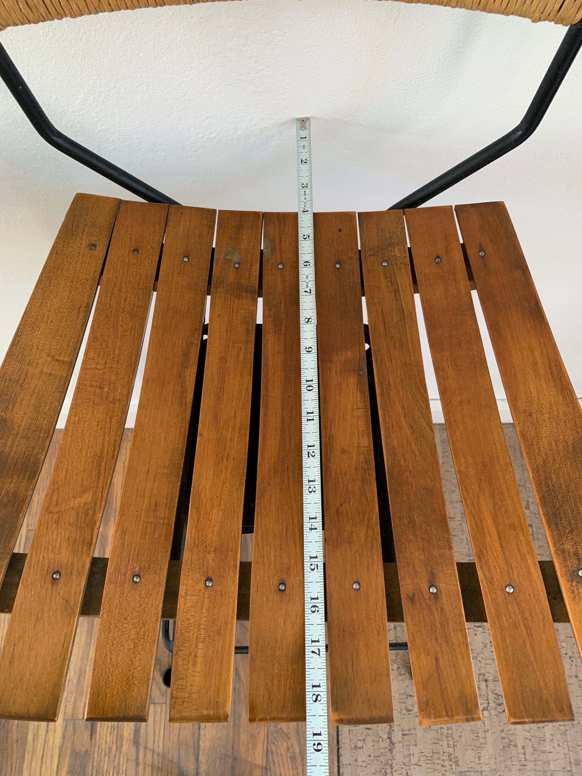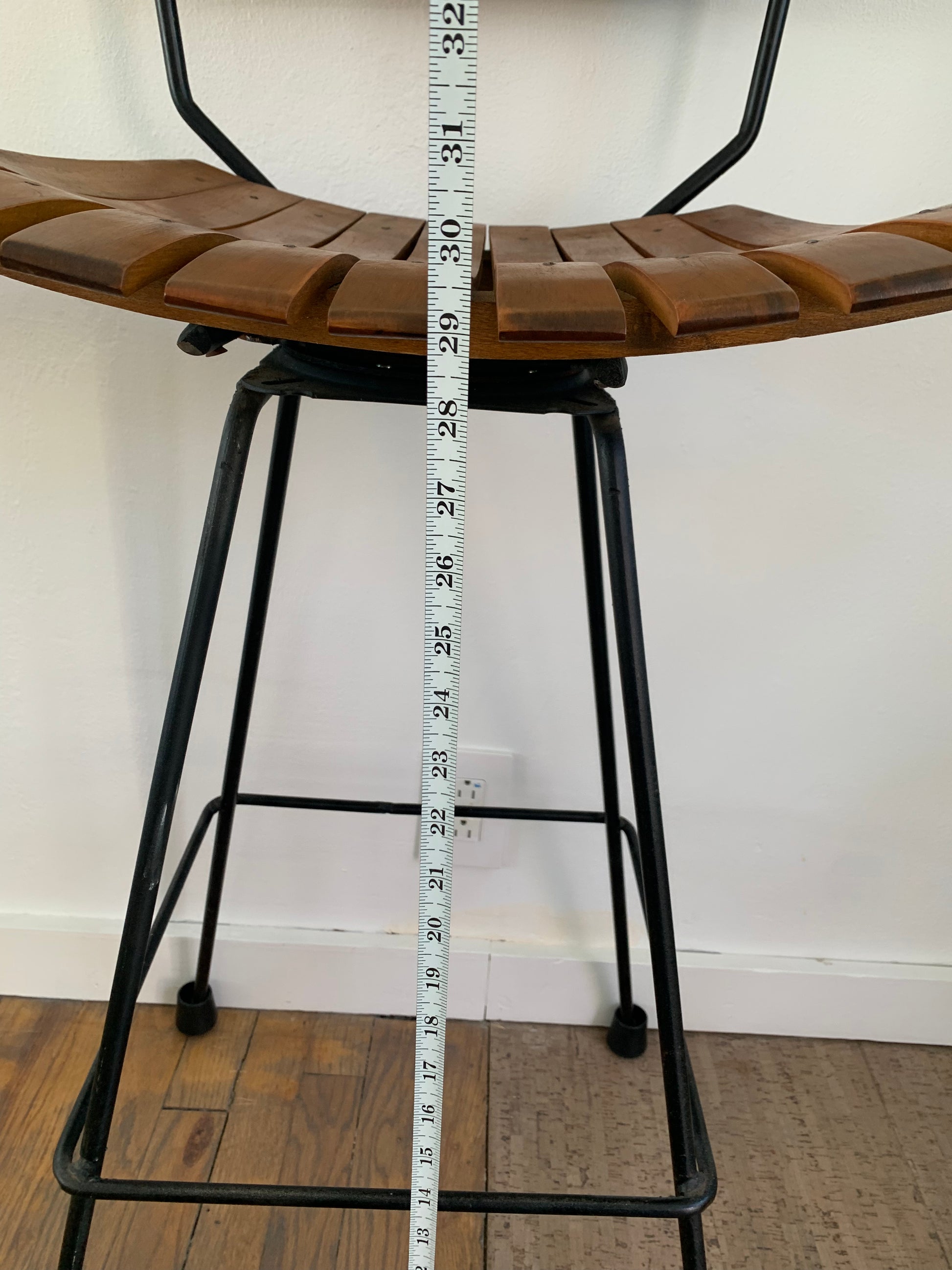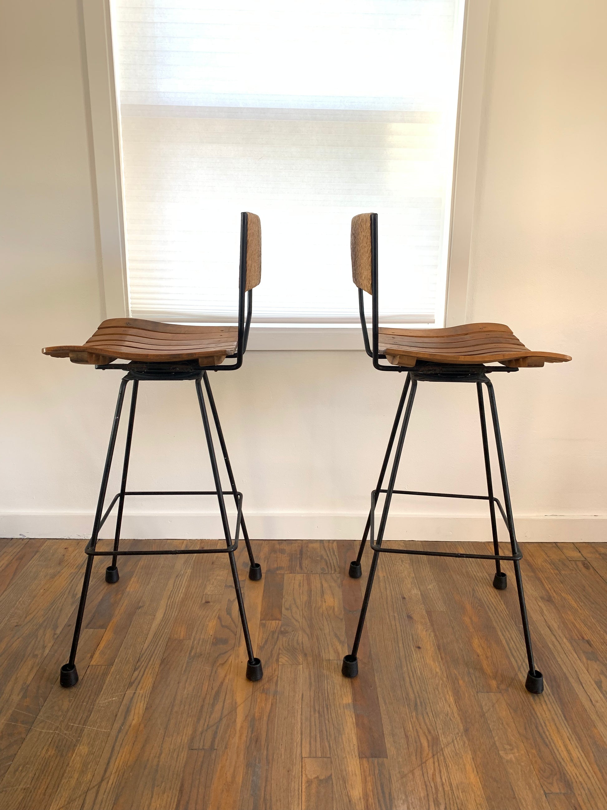 CONDITION NOTES: Barstools are in original condition with age appropriate markings on the wooden seats and patina on the legs. Nothing major to note except for the missing foot cap on one.