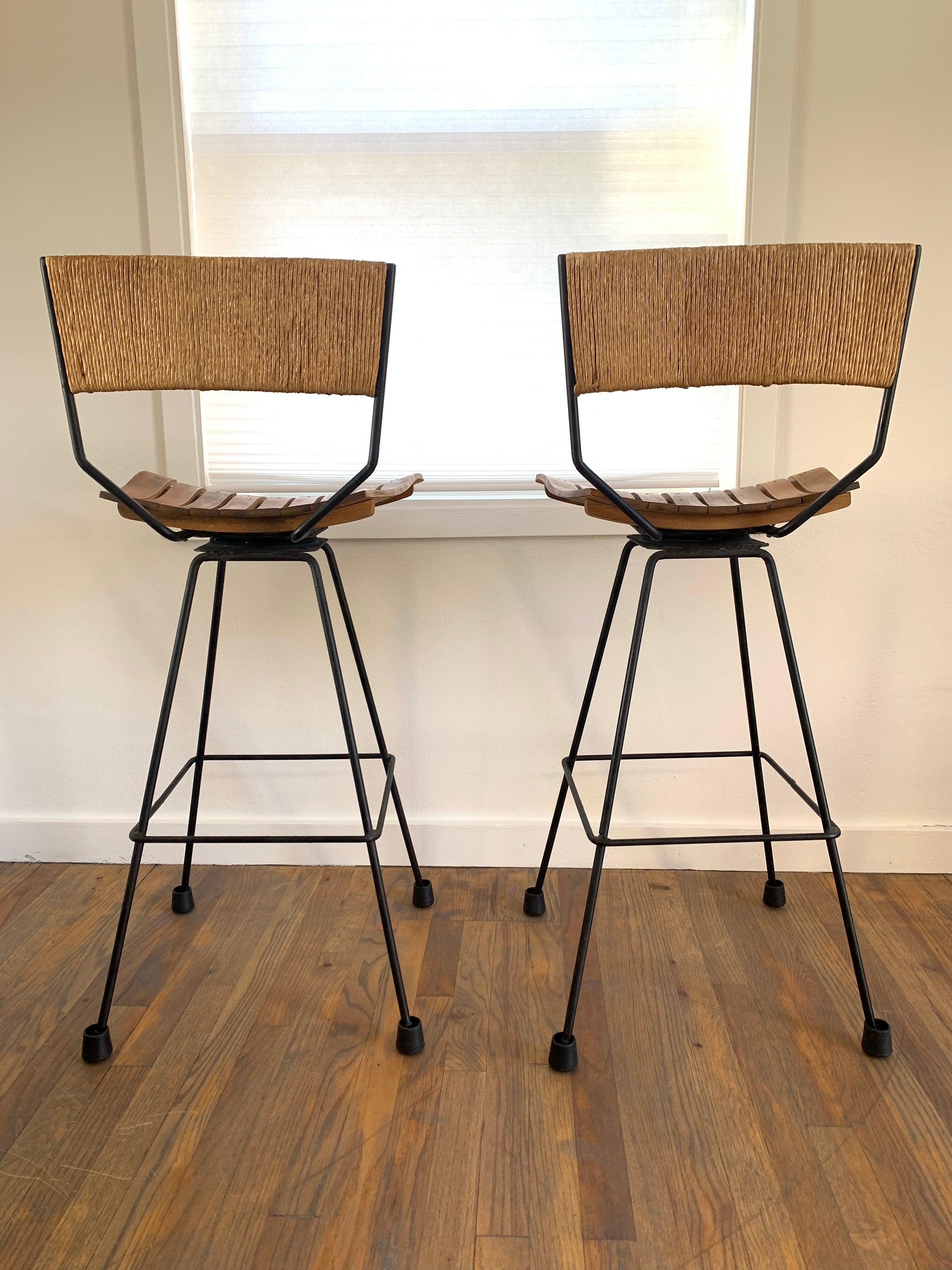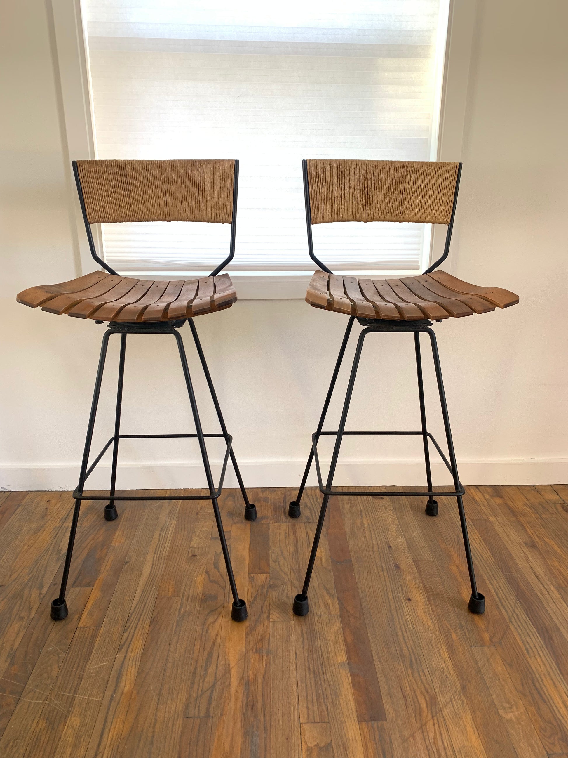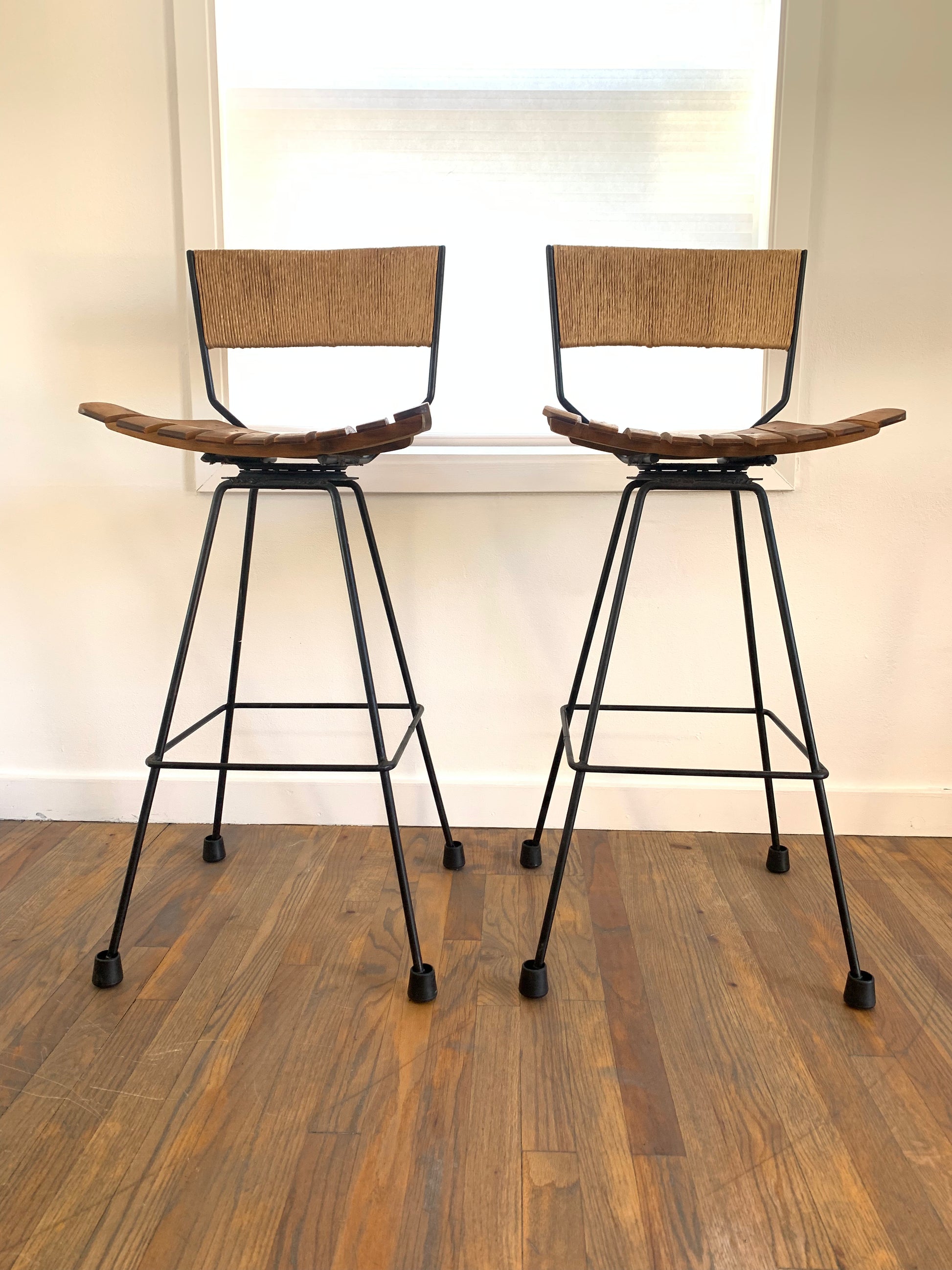 Mid-century modern Arthur Umanoff swivel bar stools featuring wood slat seats, iron frames and Danish rush cord wrapped backs. Minimalist rustic design. These barstools add natural stylish seating into a multitude of spaces and design concepts. Feet are covered with rubber cups that can be removed. One of the original rotating foot caps is missing.
